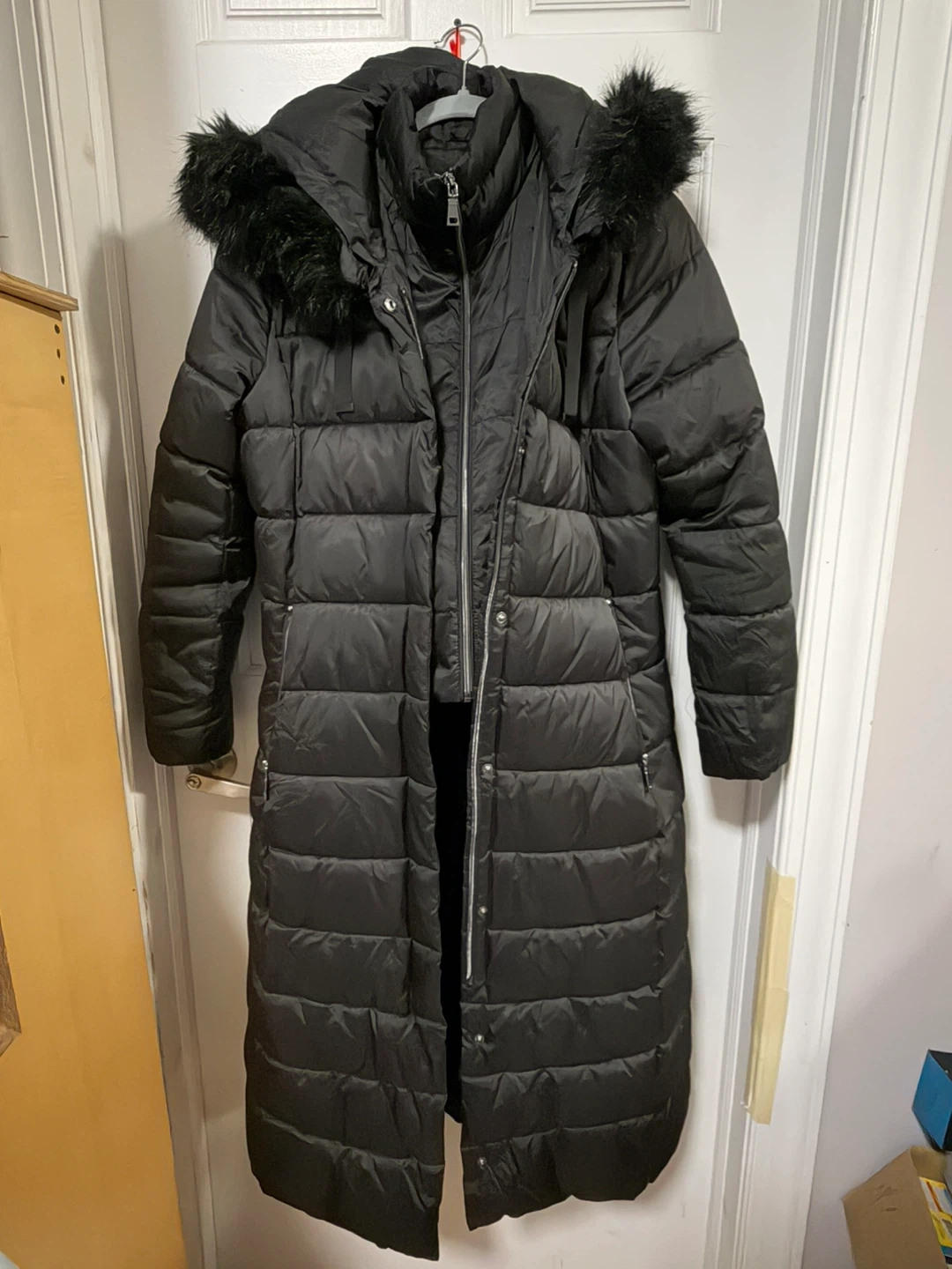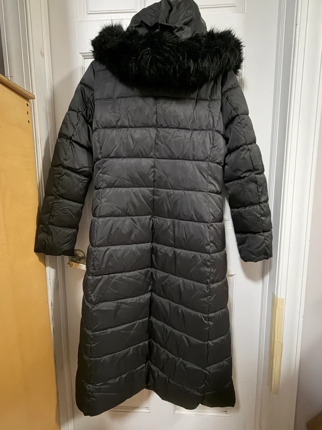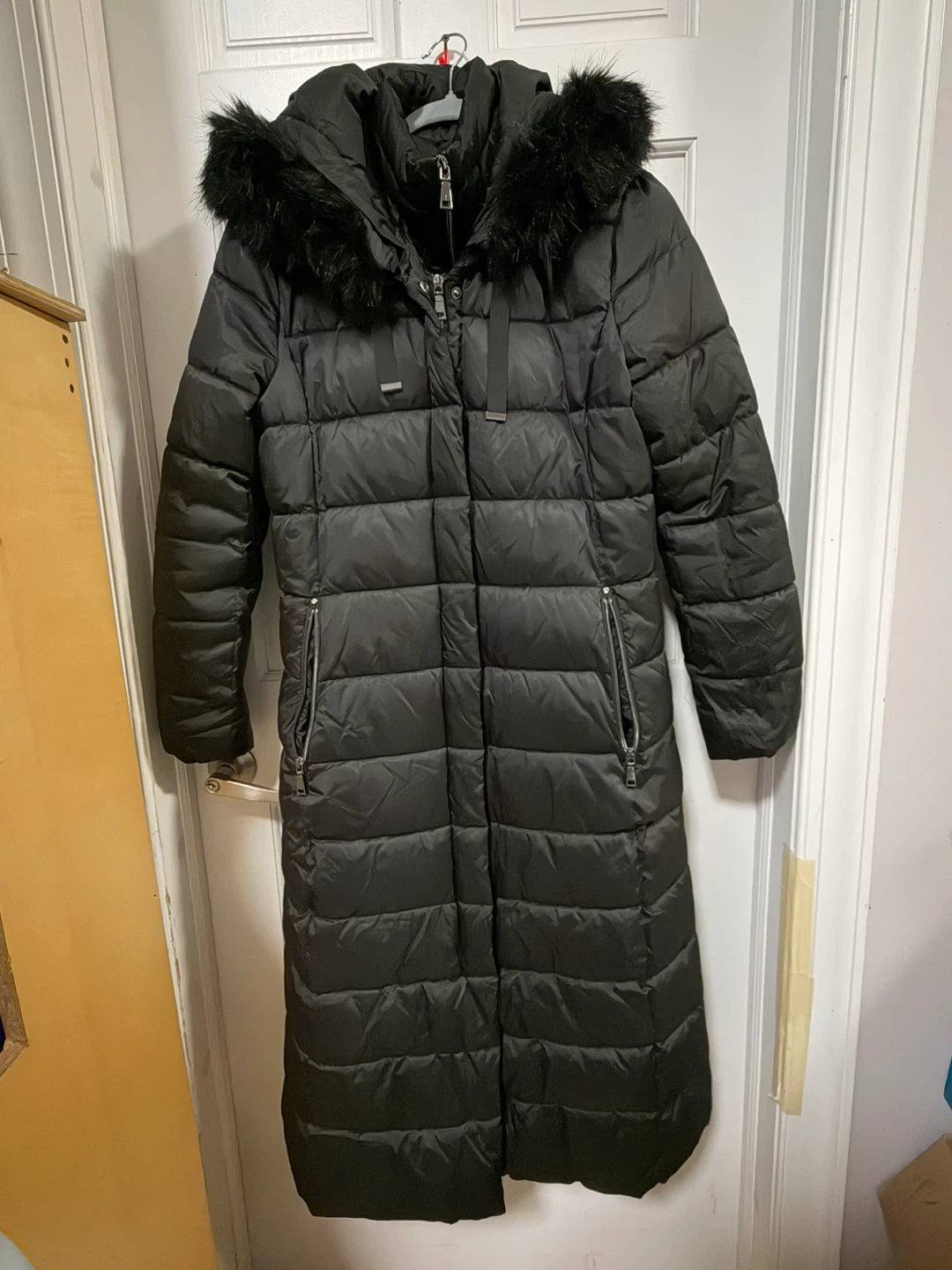 It's a stylish and warm option for colder weather. The coat features a hood with faux fur trim and a long silhouette for extra coverage. Perfect for staying cozy and chic!