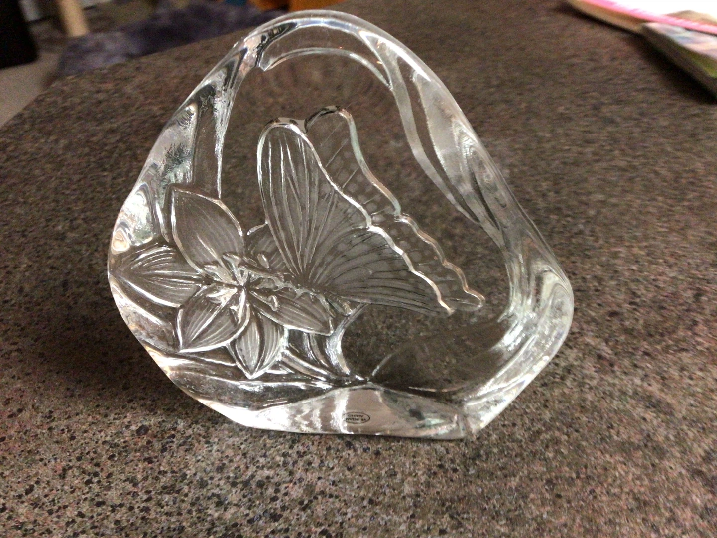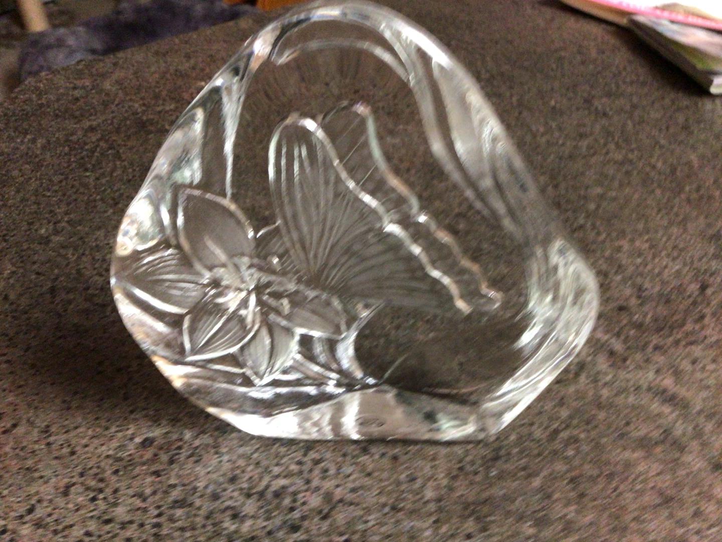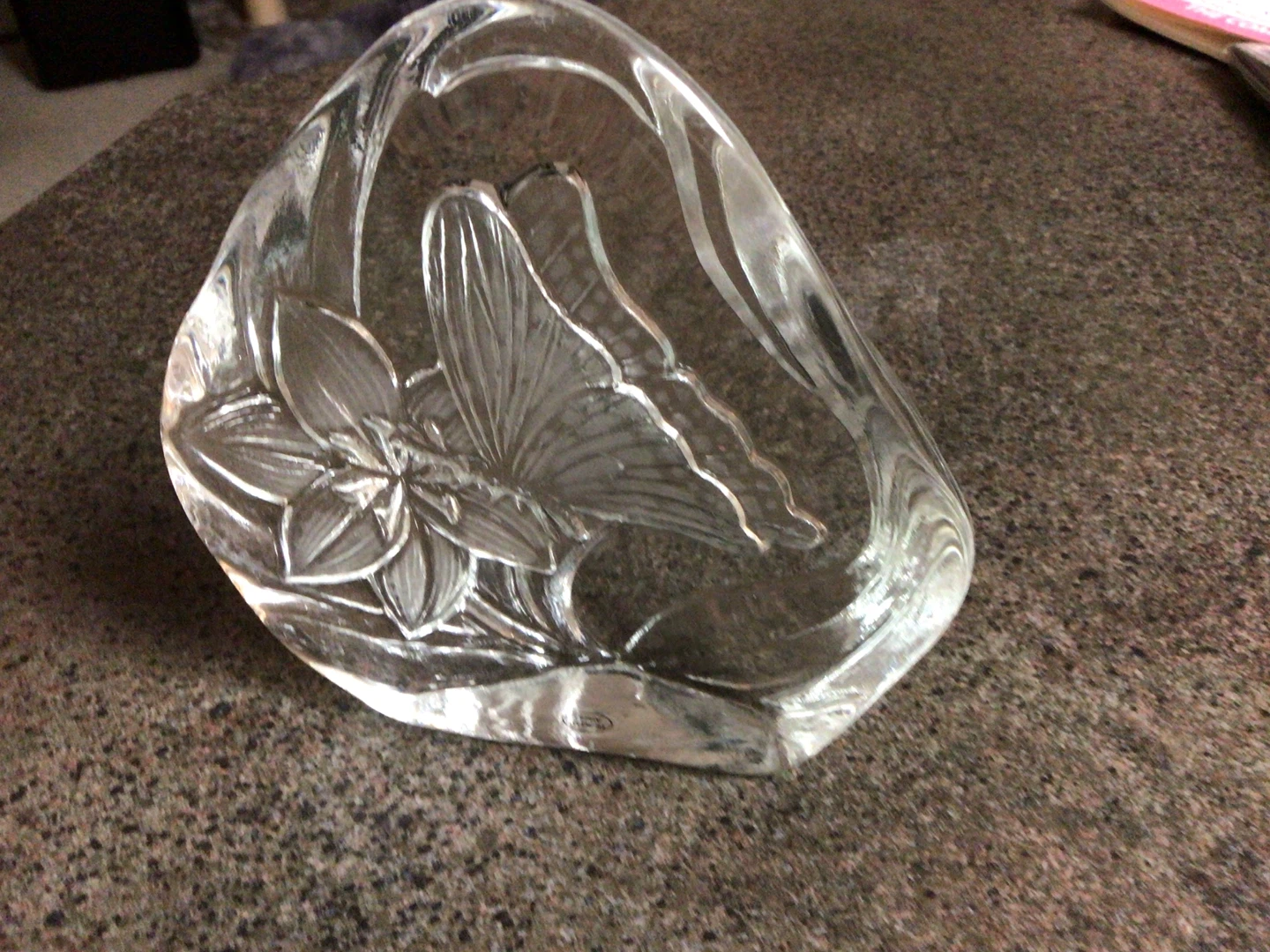 Selling a beautiful clear glass sculpture featuring a butterfly and flower design. It would make a lovely addition to any home decor