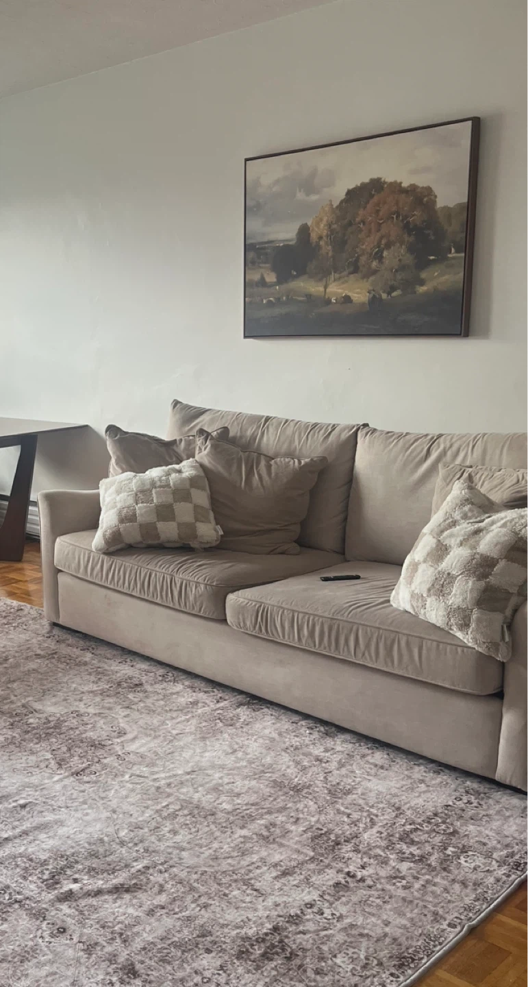 Selling a comfy beige sofa with a matching ottoman! It's in great shape and perfect for lounging. The neutral colour will fit in with any decor. Comes with all the cushions pictured. A great addition to any living room!