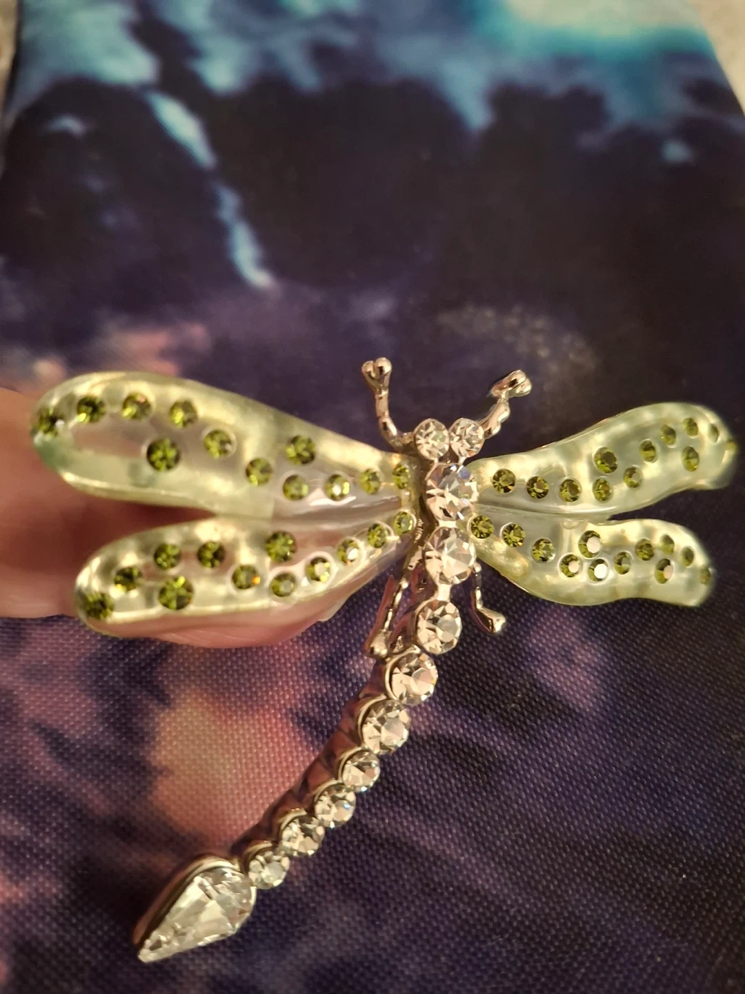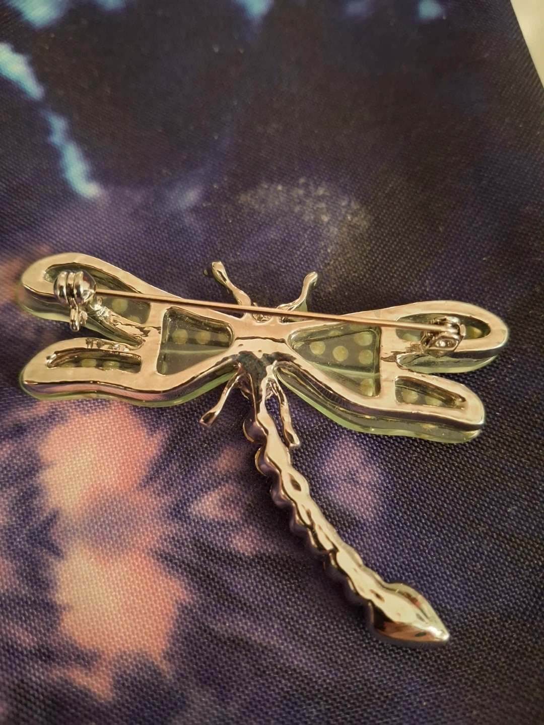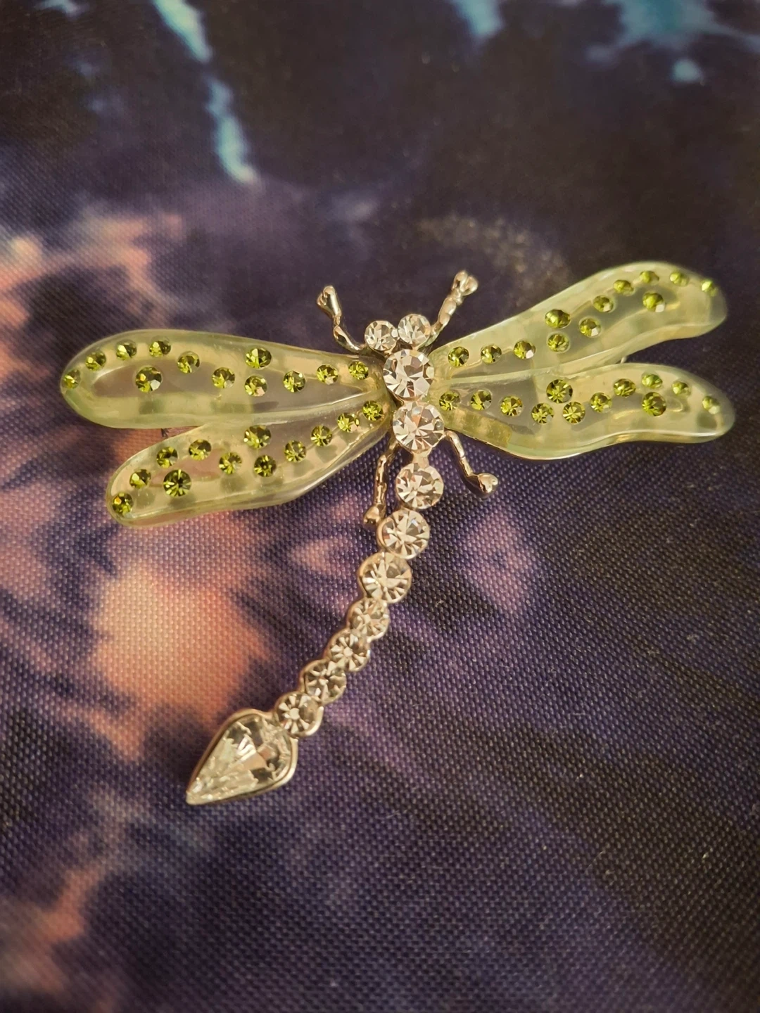Beautiful dragonfly brooch with light green hue and many stones. Unmarked. In excellent condition, never been worn. 2.5” across x 2” down.