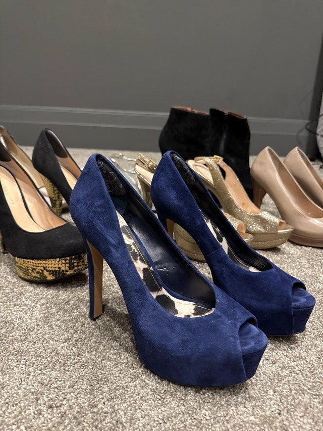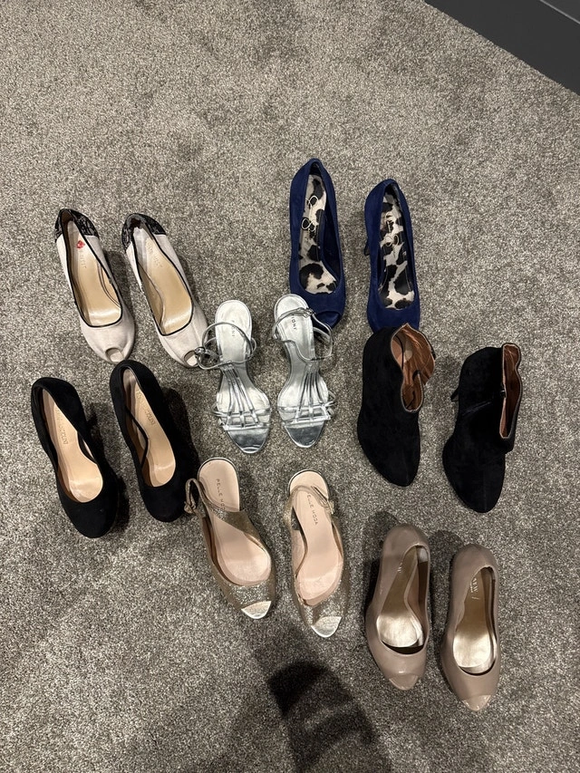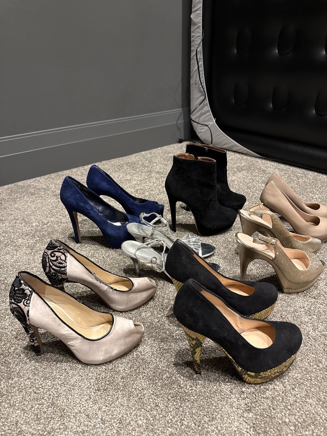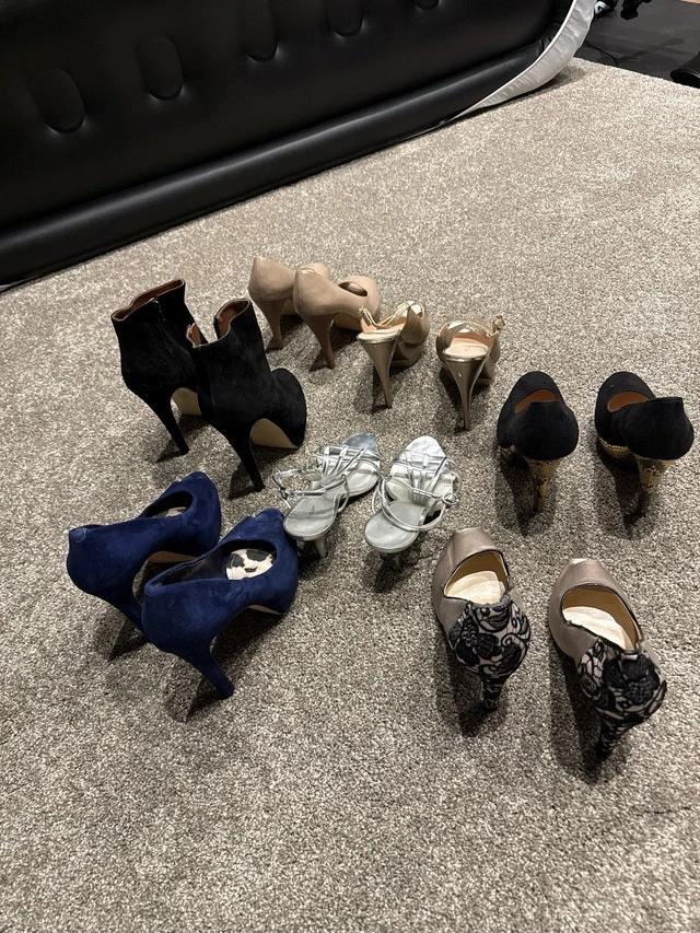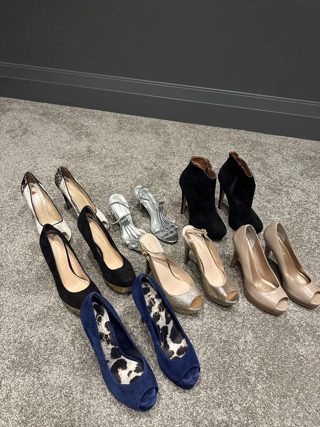 Elevate your shoe game with this stylish bundle of various heels and booties, perfect for any fashion-forward individual! This diverse collection includes an assortment of designs, colours, and sizes to suit various occasions. Sold as a bundle, these shoes are in used condition but have plenty of life left. Note that these are from a variety of brands, without boxes.