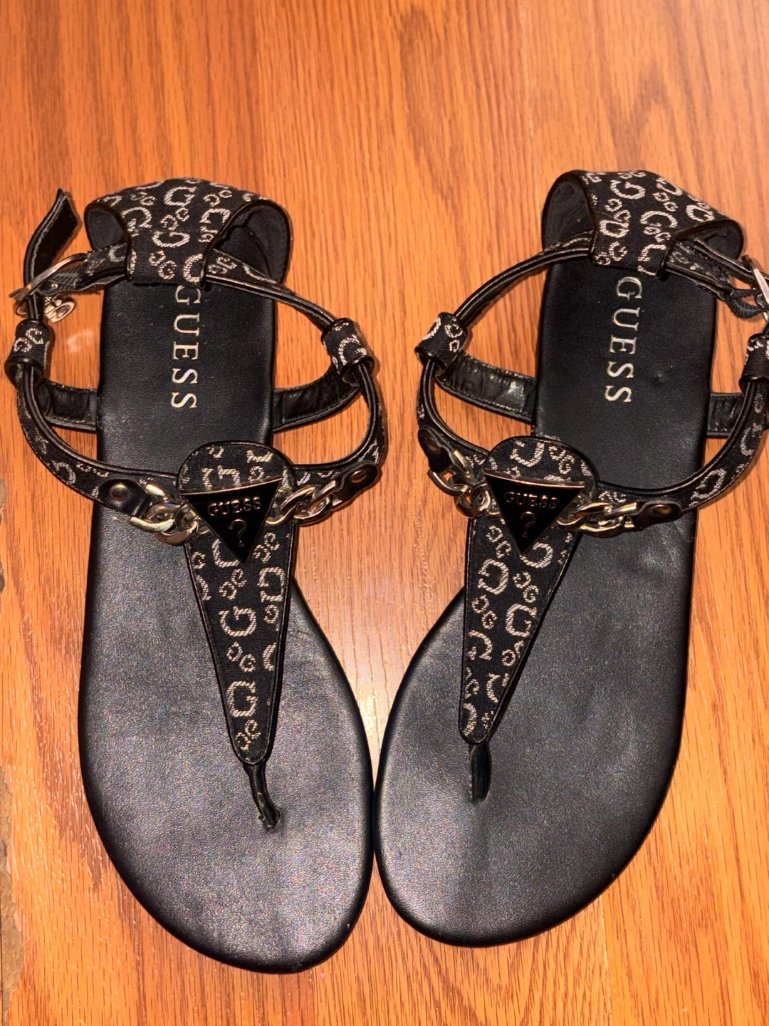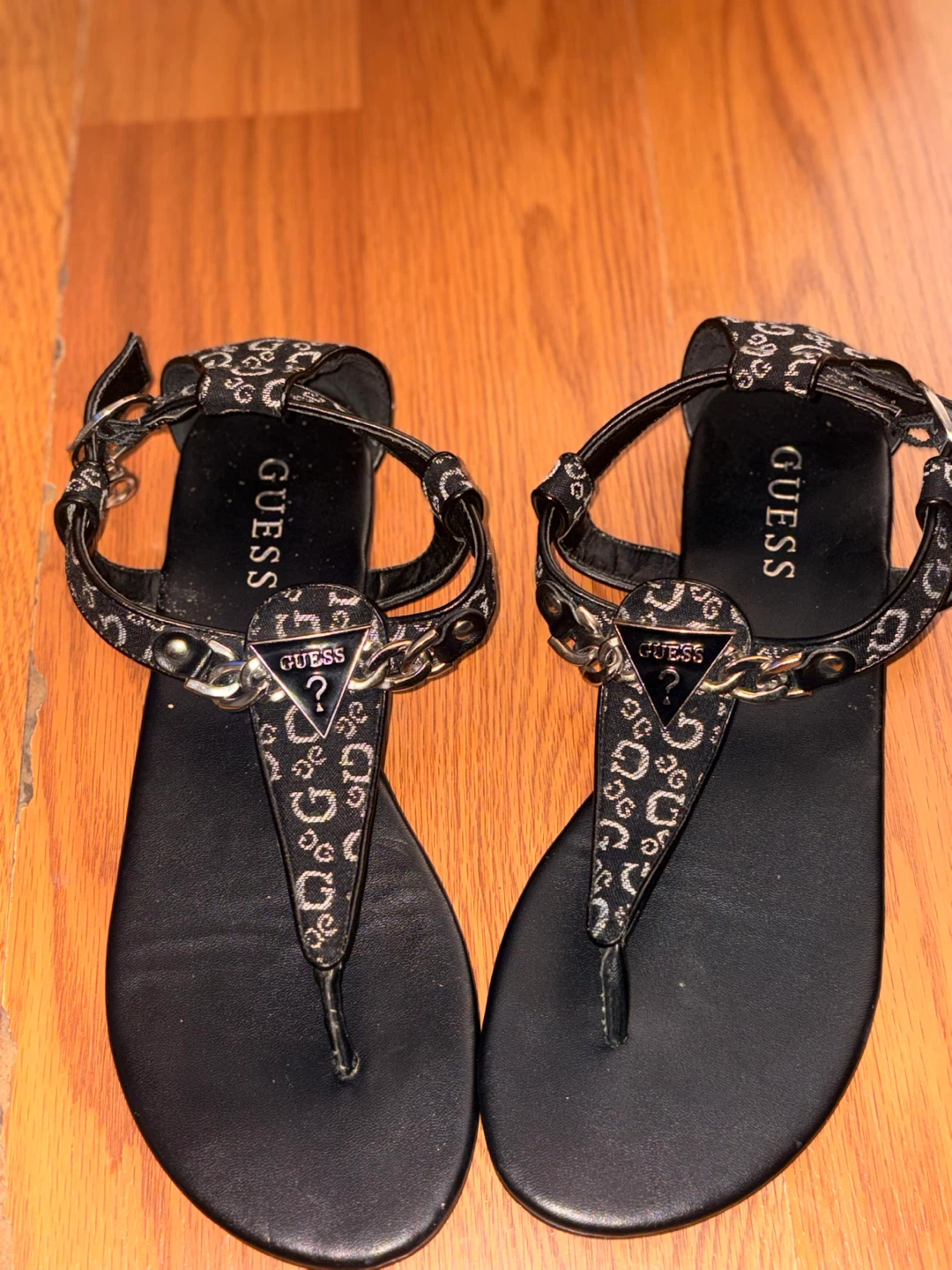 Cute black Guess sandals in a size 8. They have a unique design with the Guess logo and chain detailing. Perfect for adding a bit of style to your summer outfits!