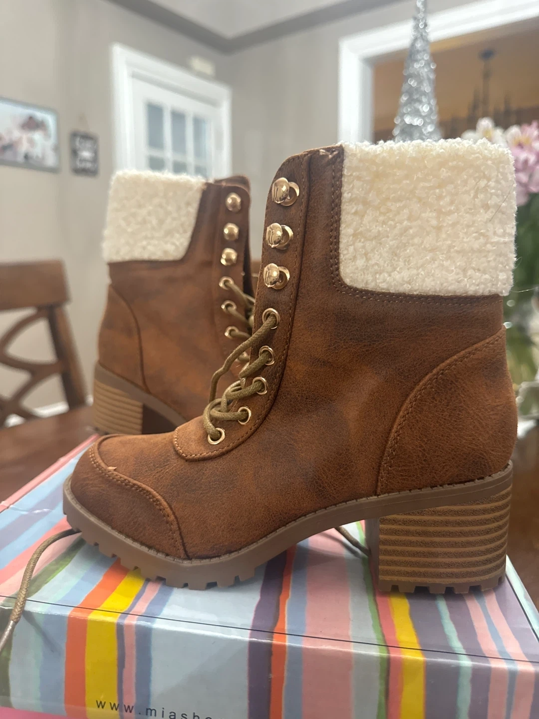 These stylish brown Mia boots feature a lace-up design and a comfortable heel. They come with the original box