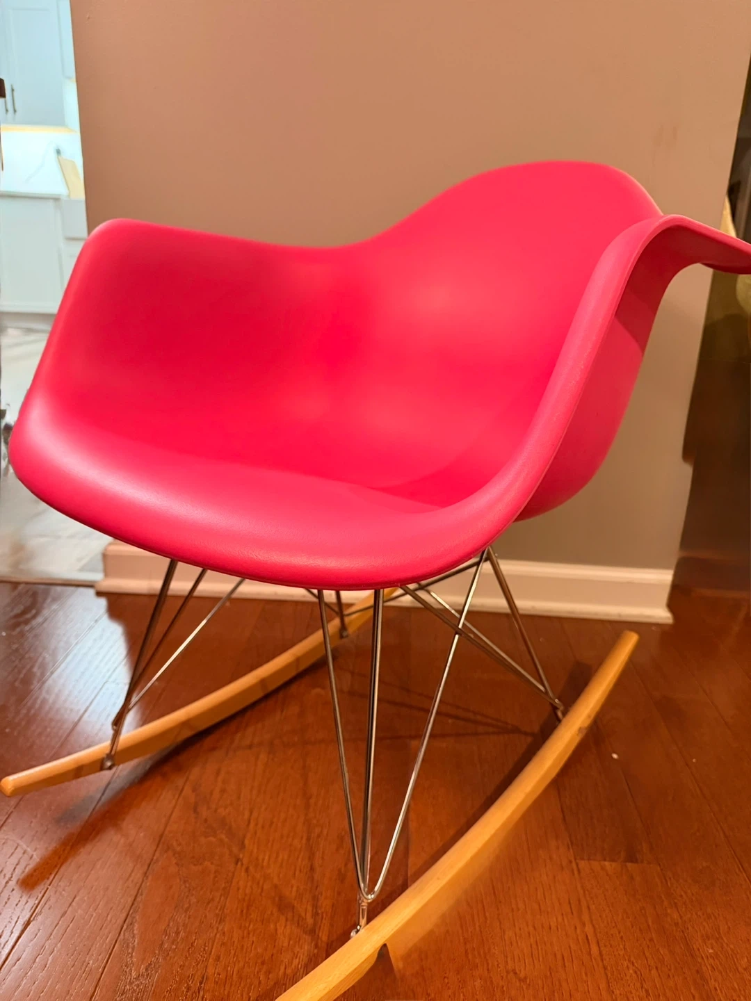 Here's a stylish Eames-style rocking chair! It's a fun pop of color with its bright pink seat and would look great in any room