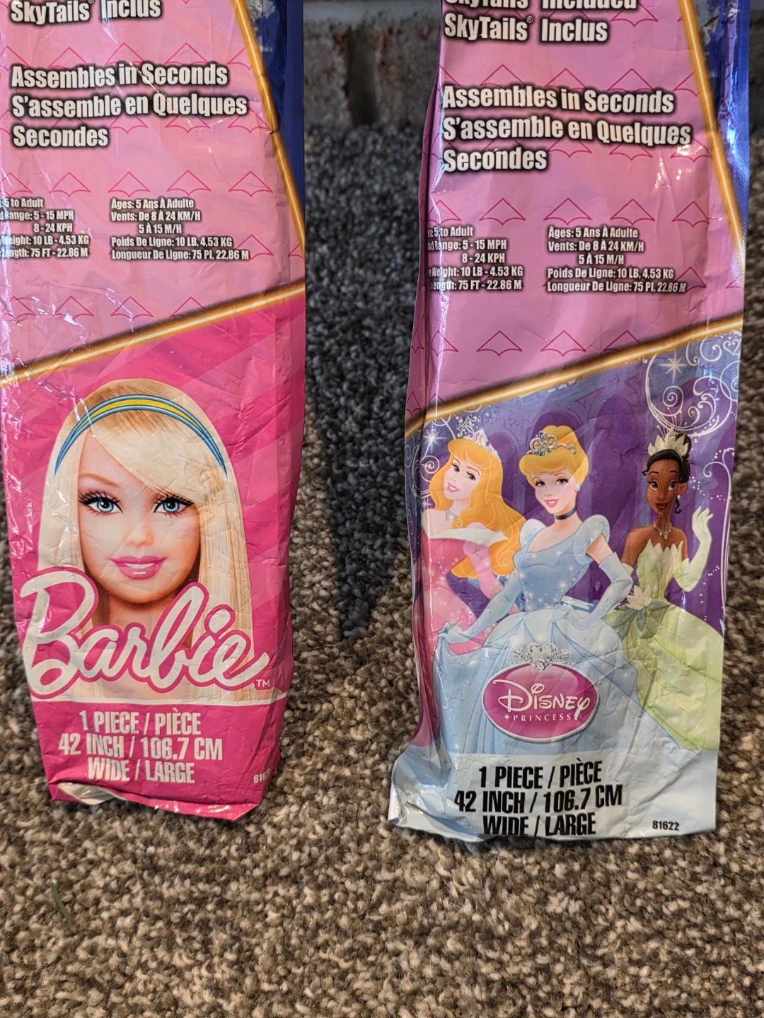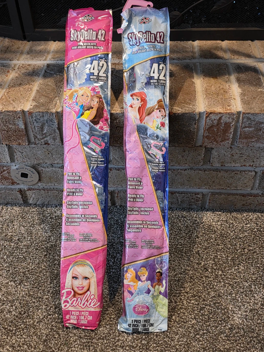 I have two brand new SkyDelta 42 inch kites for sale! One is Barbie themed and the other features Disney Princesses. They are ready to fly and assemble in seconds. Each package includes skytails. Perfect for some outdoor fun! $5.00 each