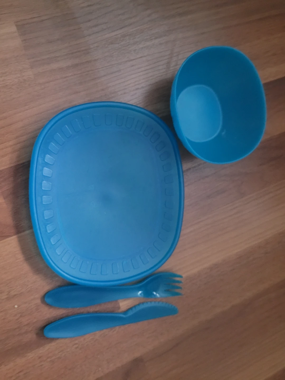 This adorable blue children's dinnerware set includes a plate, bowl, fork, and knife, perfect for your little one's meals! This is a previously enjoyed set and has visible signs of use.