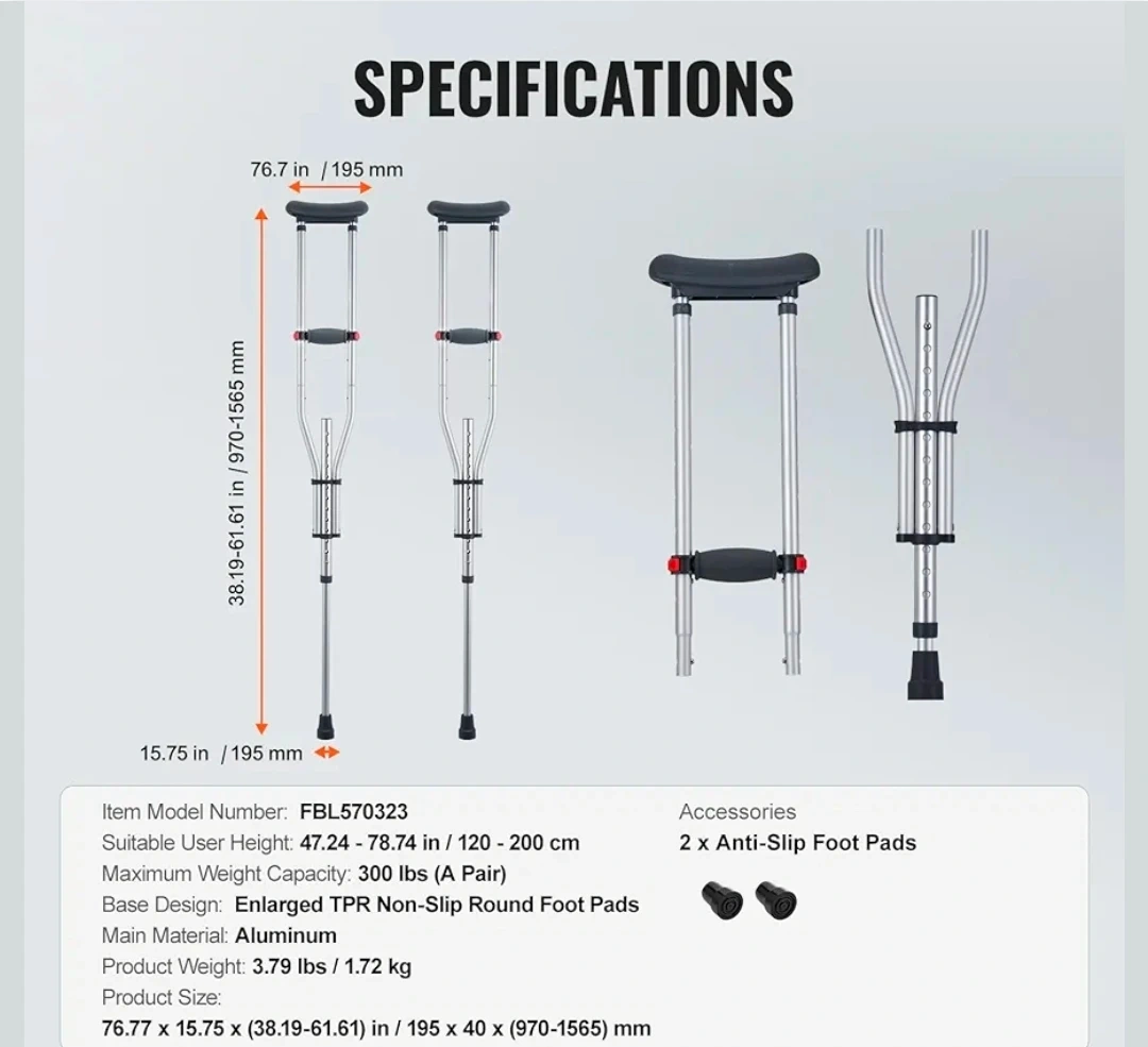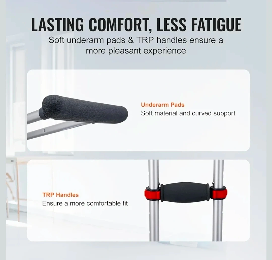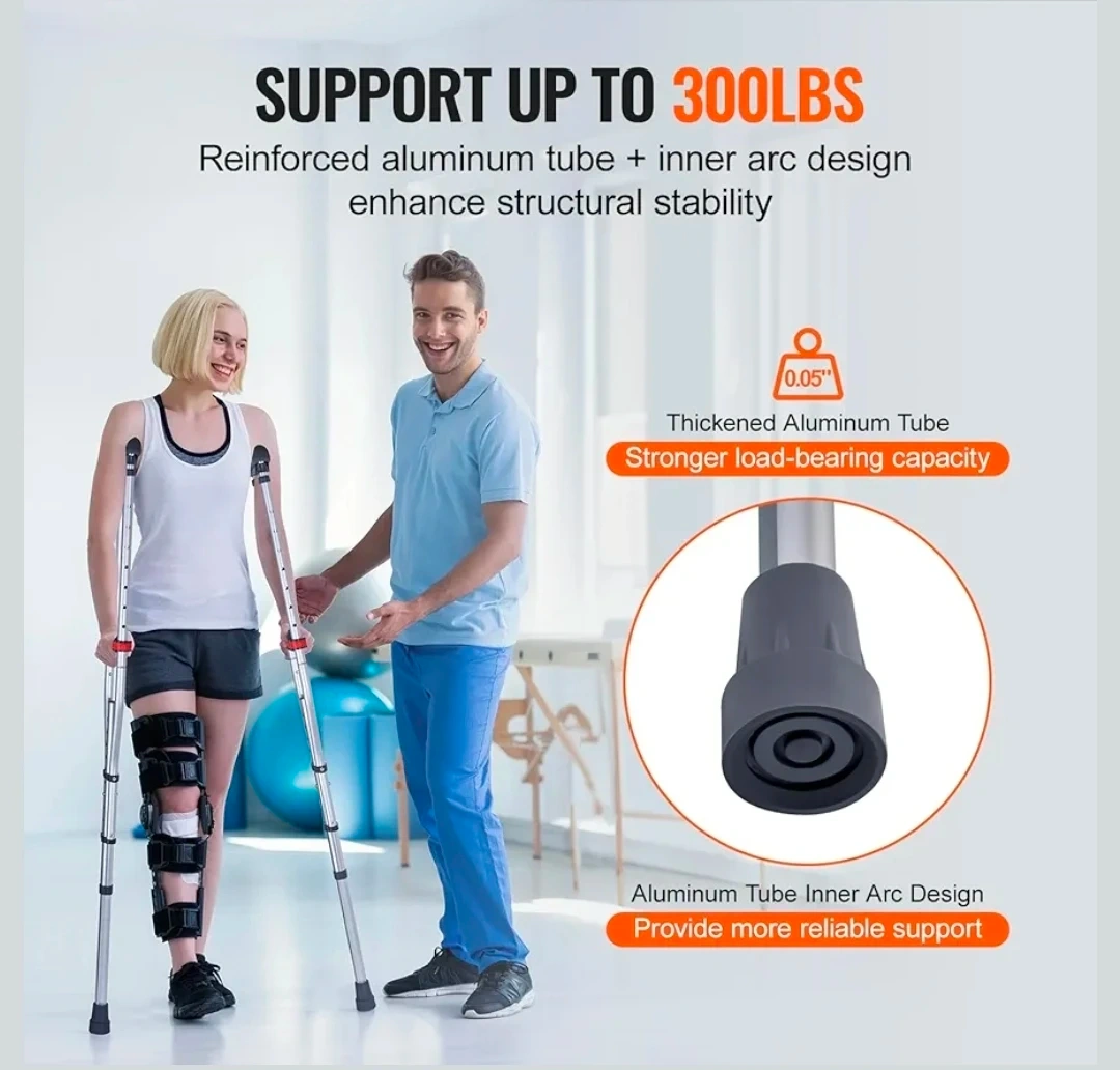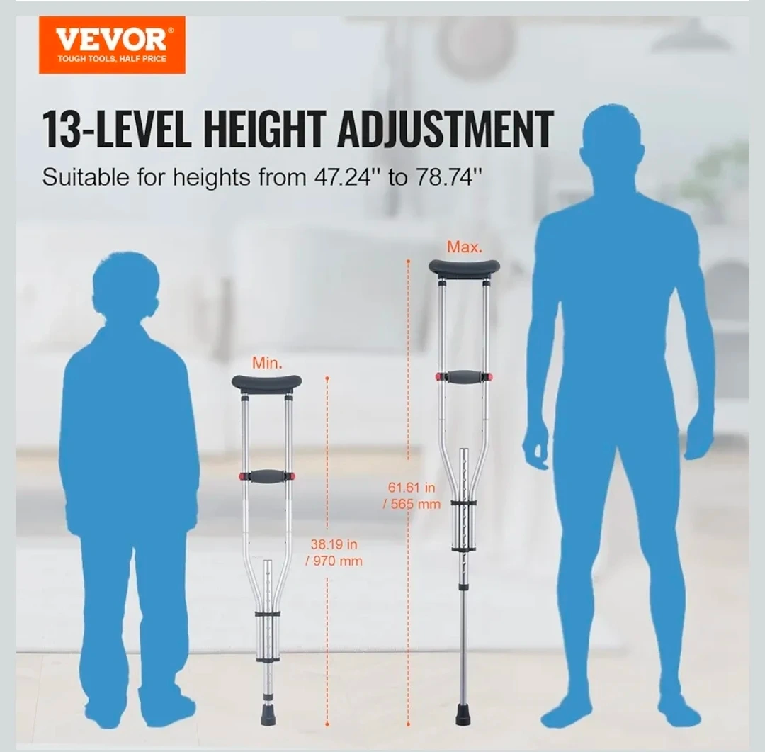 These Vevor crutches are lightweight and easy to carry around. They feature 13-level height adjustment, suitable for heights from 47.24" to 78.74". The reinforced aluminum tube and inner arc design enhance structural stability, supporting up to 300lbs. The enlarged non-slip bases ensure greater stability on various surfaces
