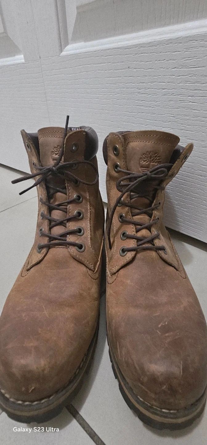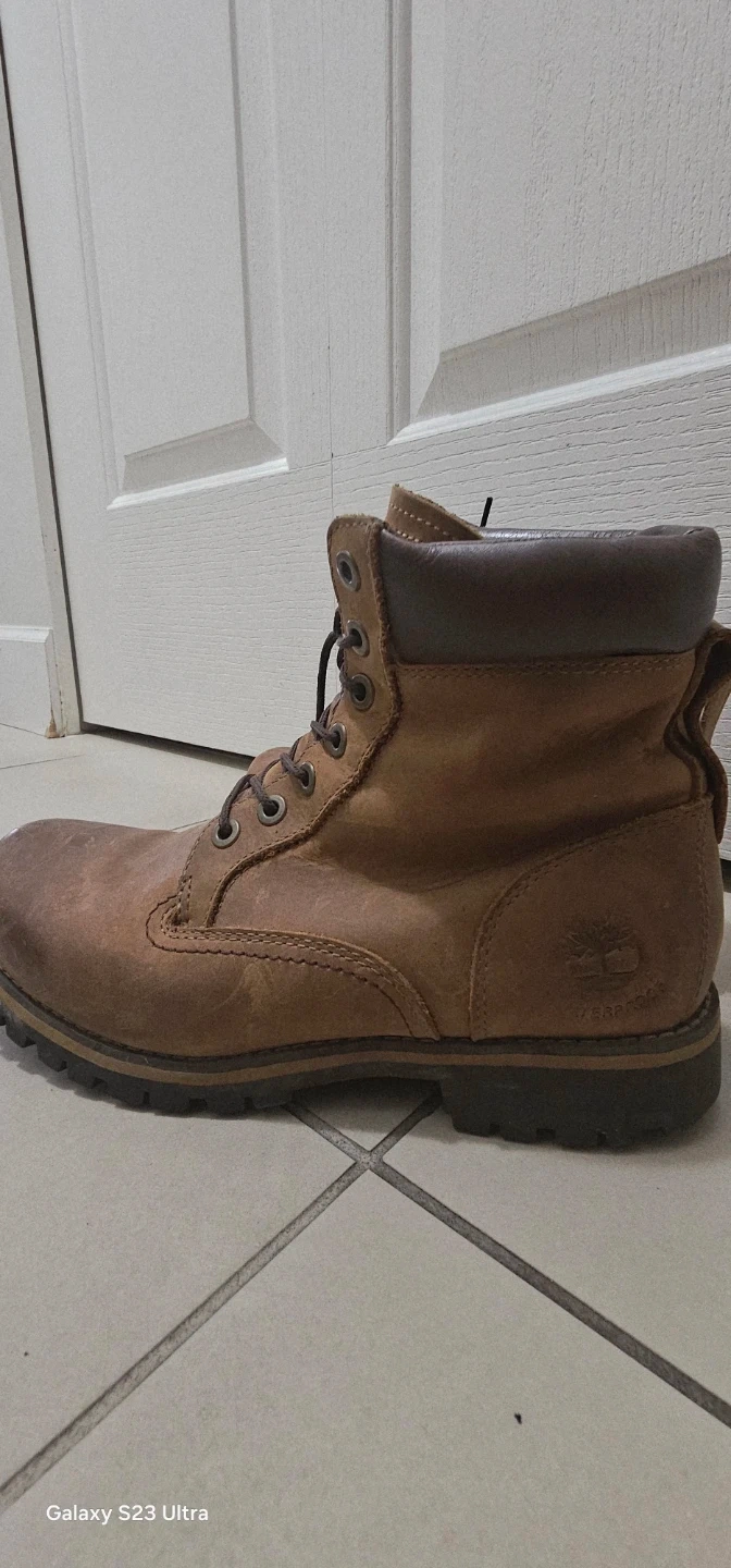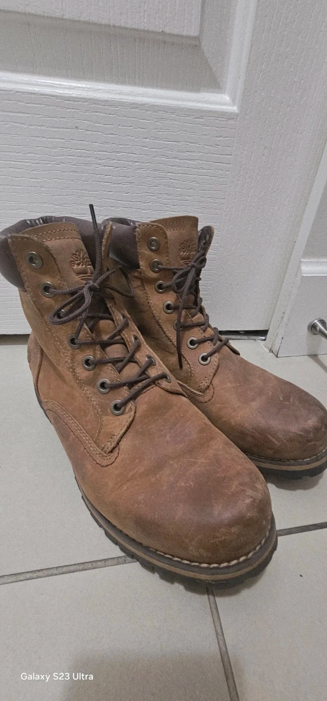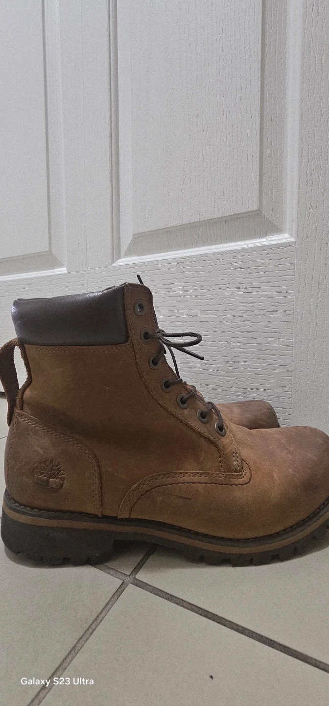 Selling a pair of Timberland boots in brown leather. They're in good condition and ready for a new owner. Perfect for everyday and rainy day wear!
