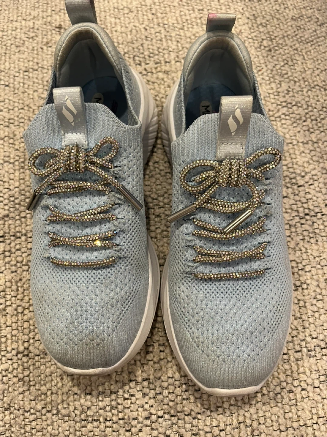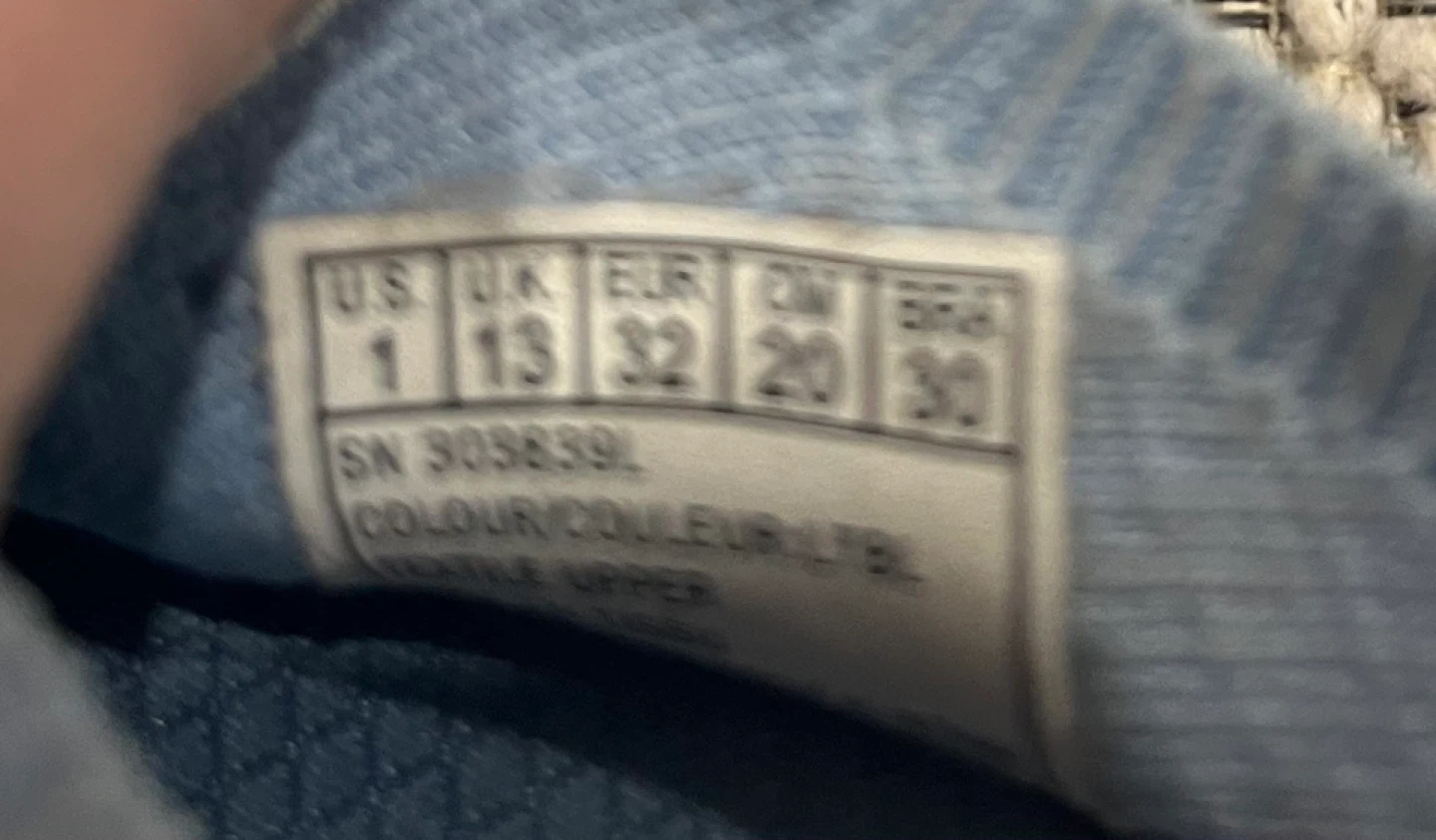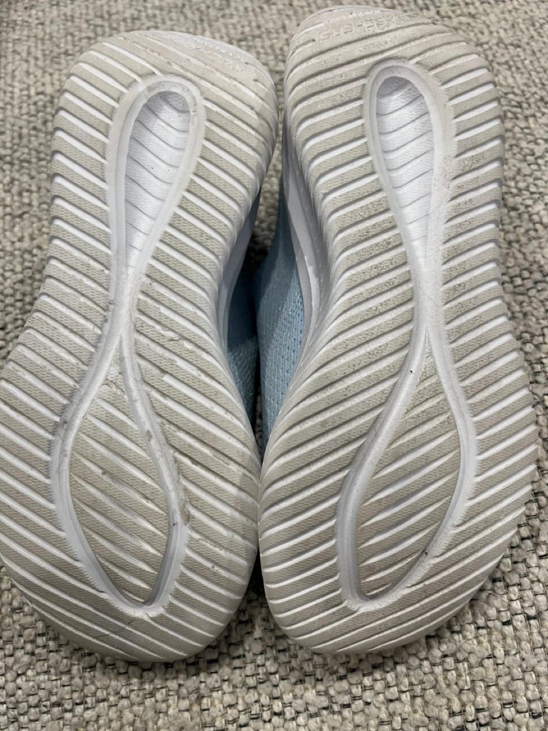 Here are some Skechers kids' sneakers in US size 1. They are a light blue colour and have air-cooled memory foam insoles. Worn as inside shoes only. Perfect for your little one!