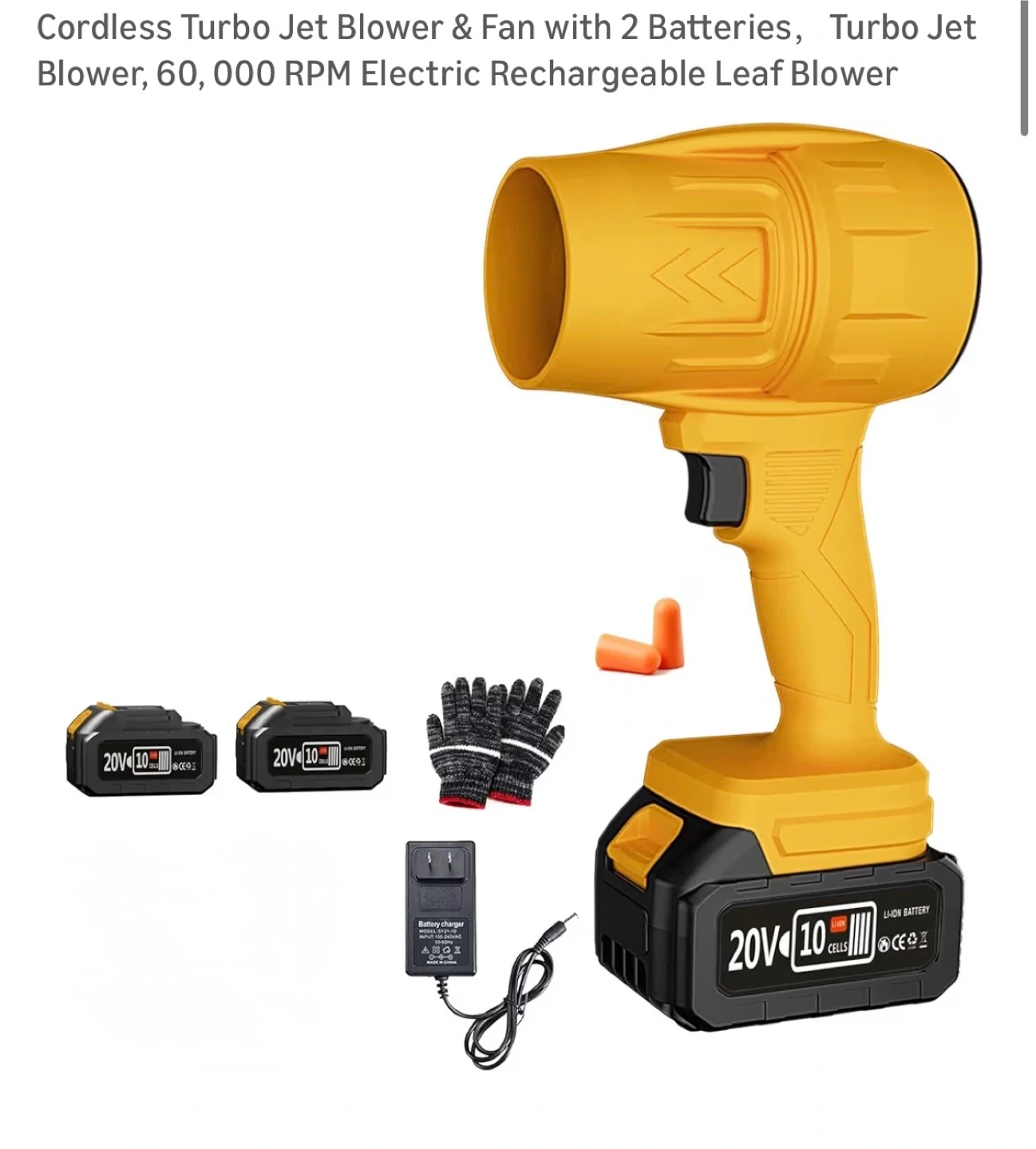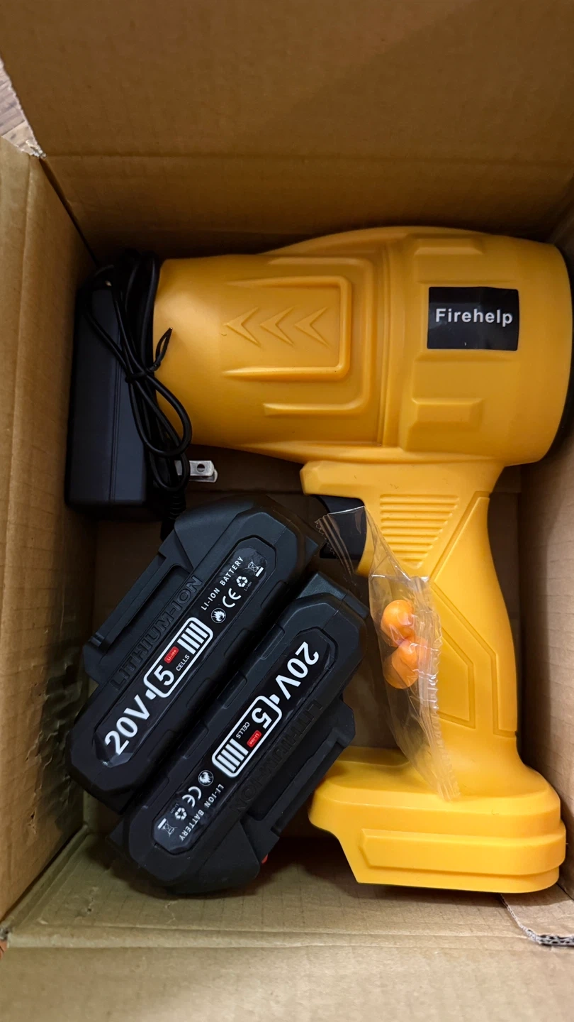 Selling a Firehelp cordless turbo jet blower and fan. It comes with two 20V 5.0Ah lithium batteries, a charger, and a pair of gloves. Also includes the original box and product use instructions