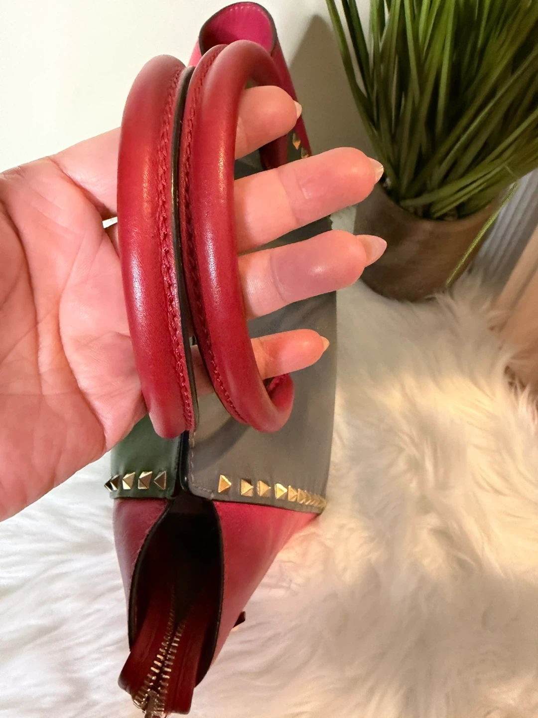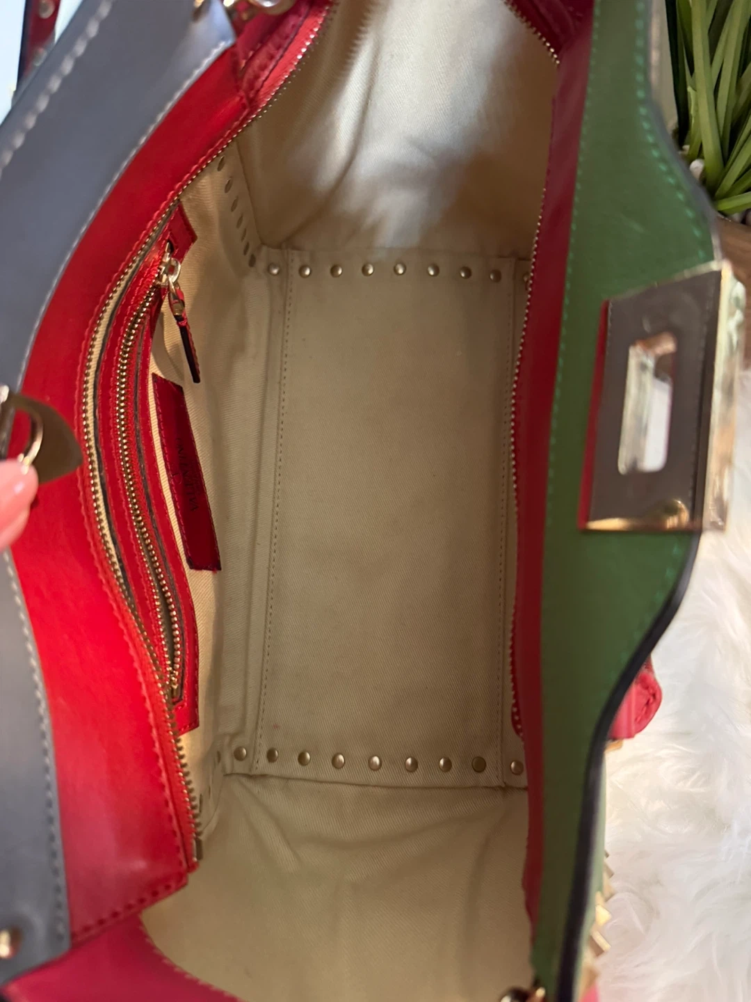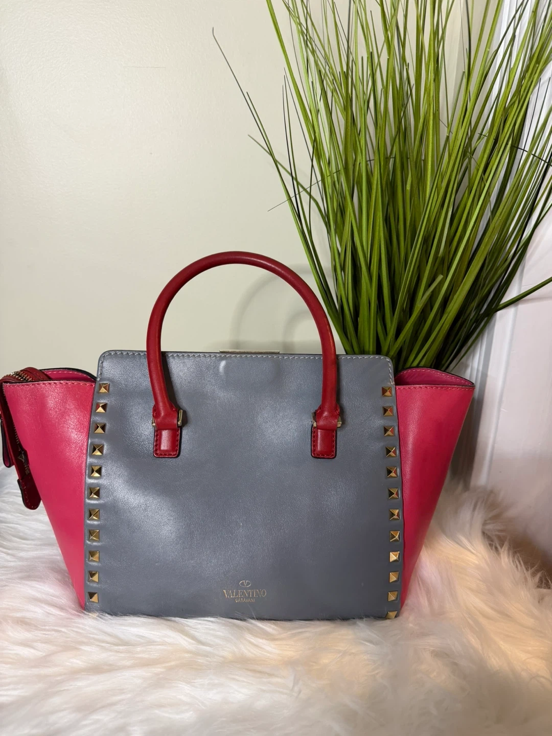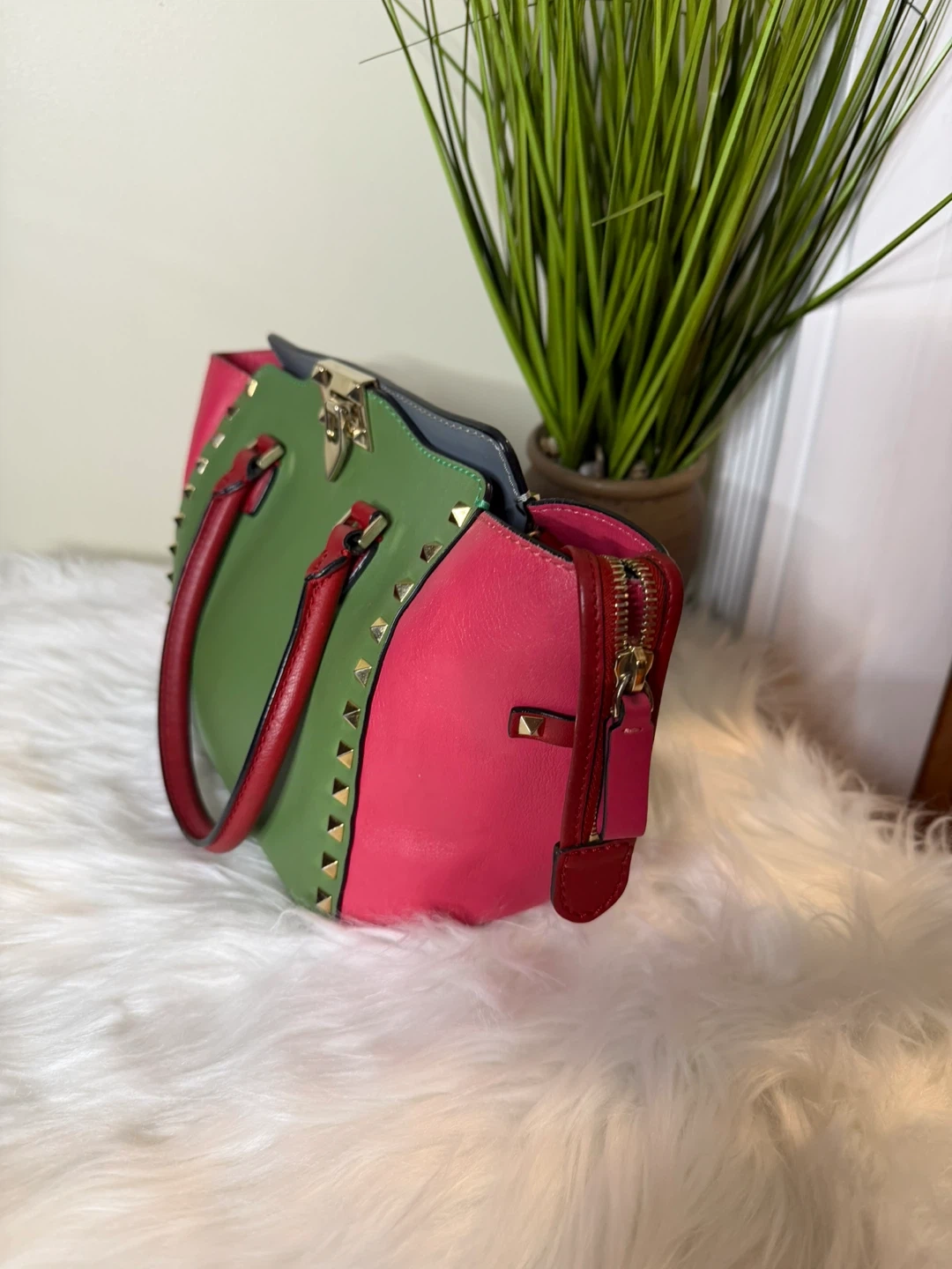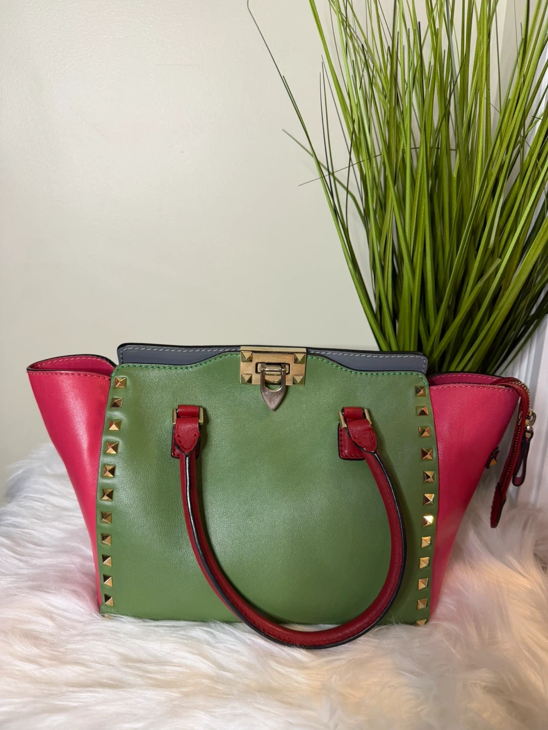 Selling a Valentino tote bag in great condition! It features a unique colour block design with pink, green, and grey leather. The bag is accented with gold studs and red handles, adding a touch of edginess to the classic tote style