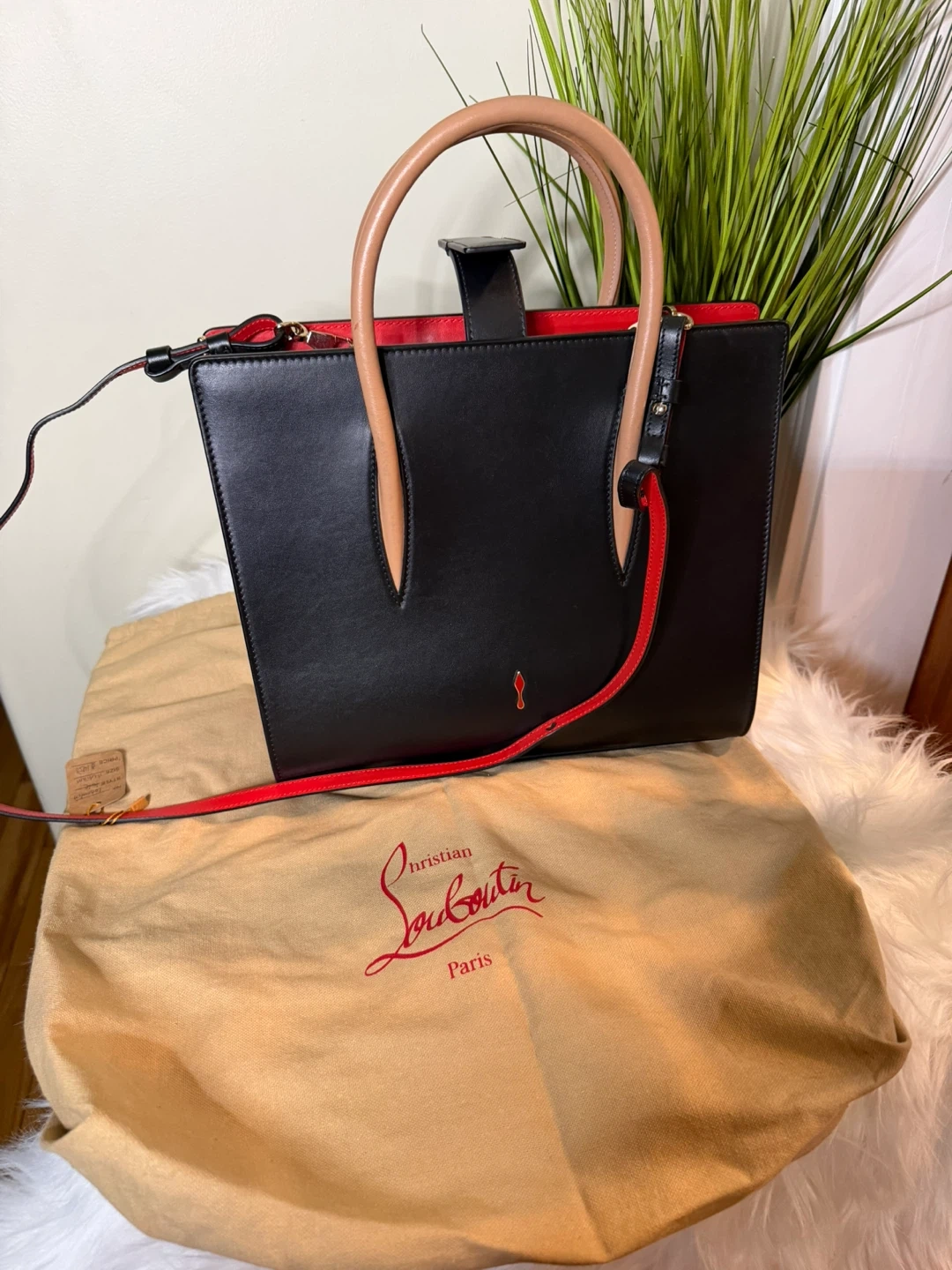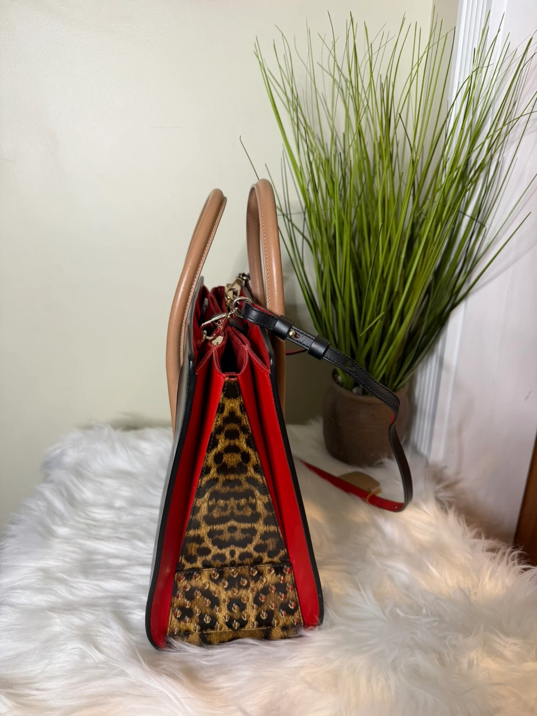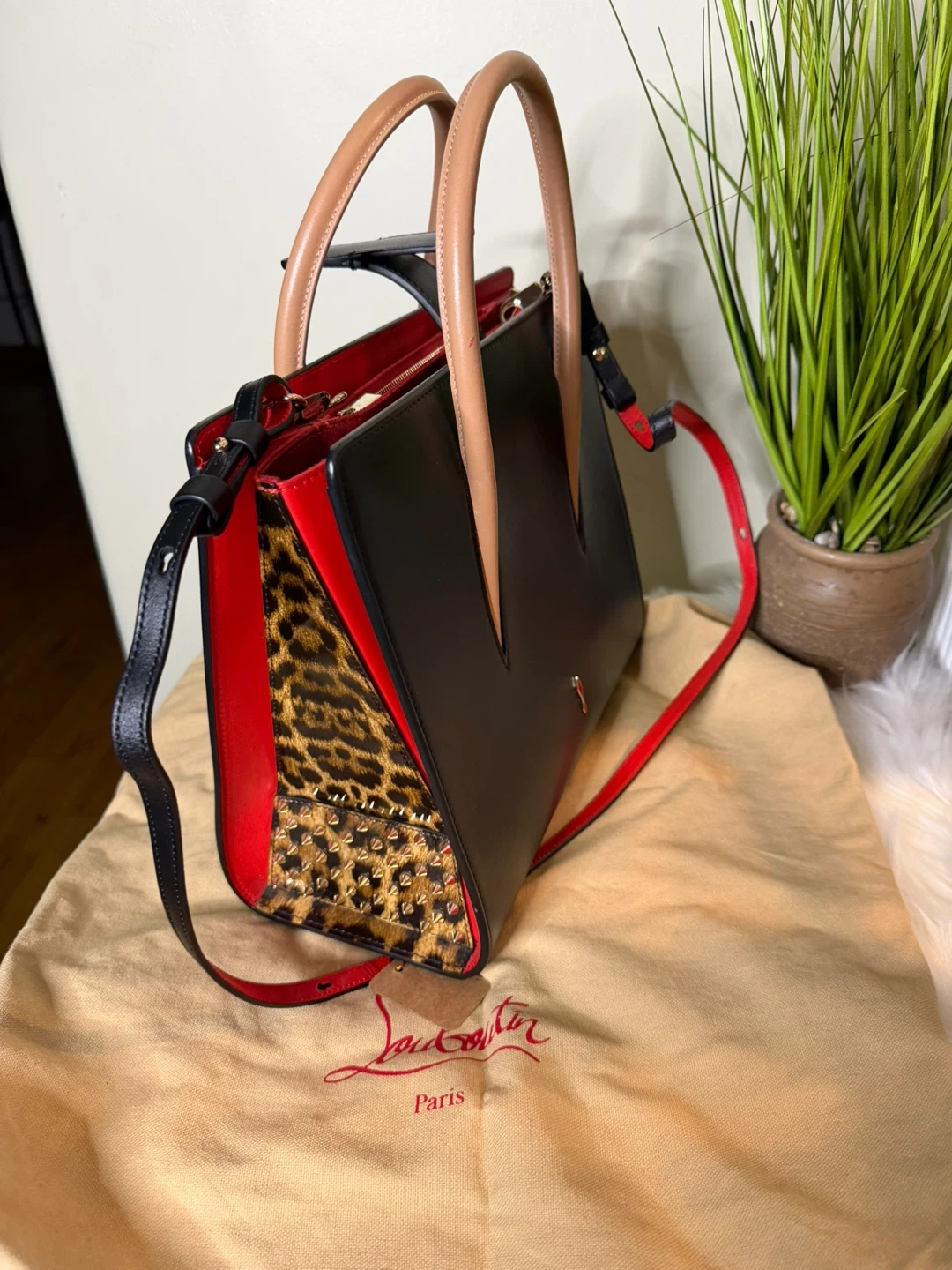 This Christian Louboutin Cabata N/S Mini Tote Bag is in excellent condition! It features a sleek black exterior with red accents and a playful leopard print interior. The bag comes with its original dust bag.