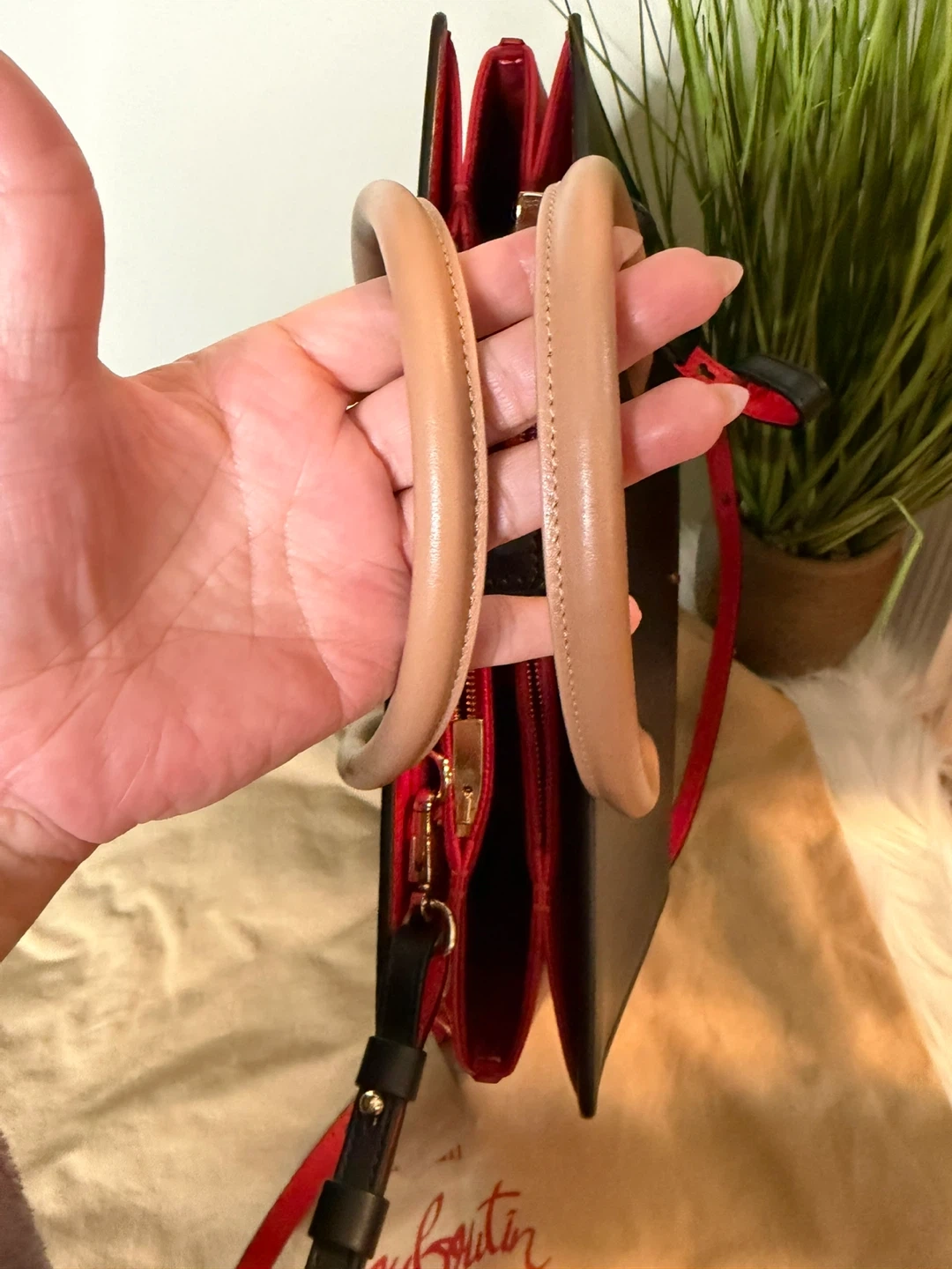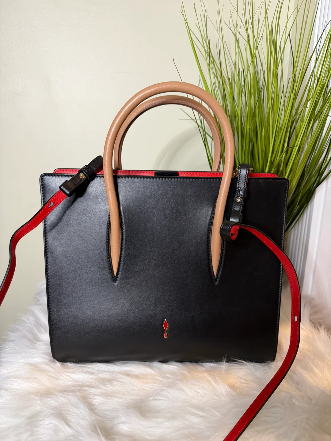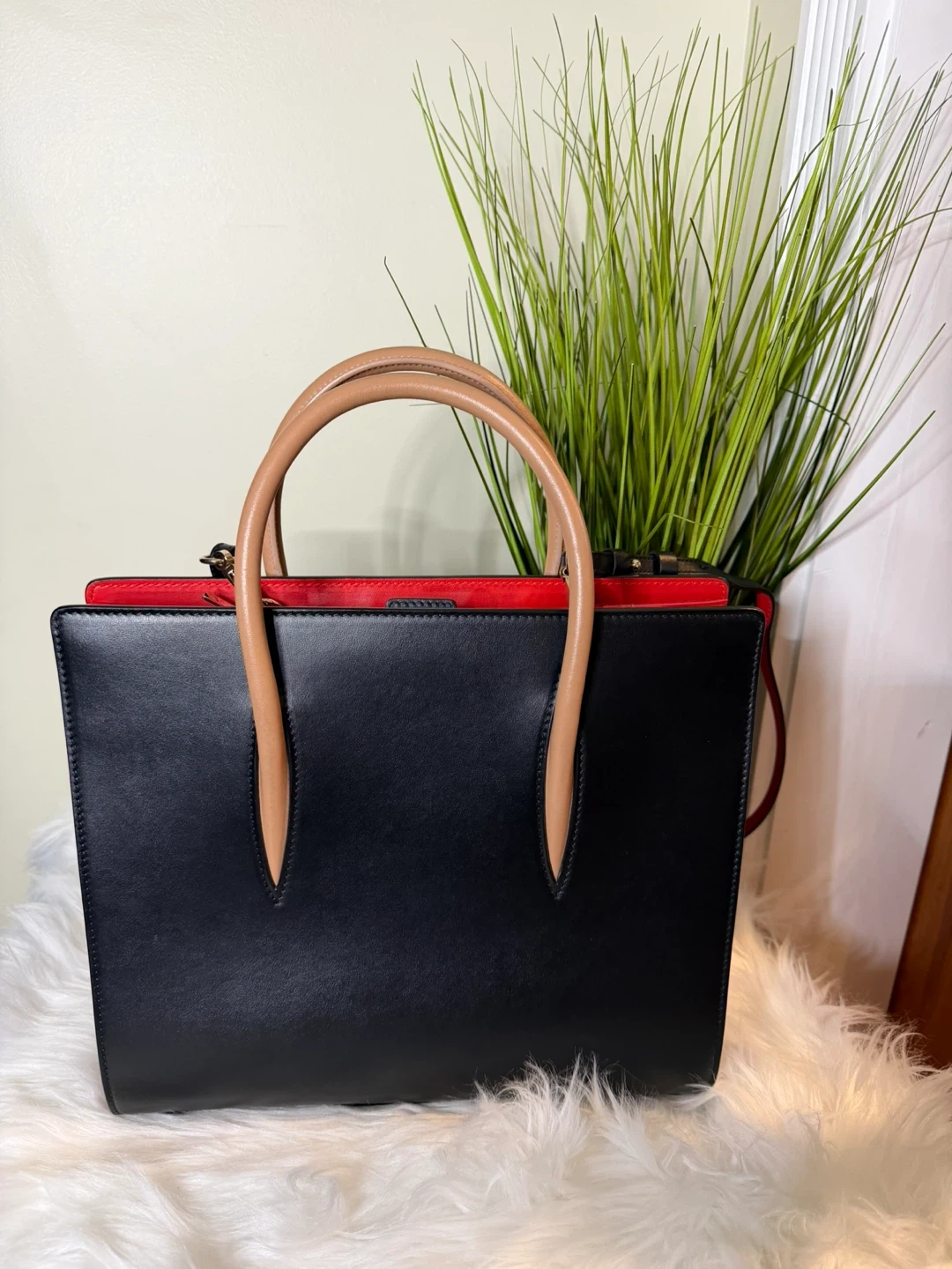 This Christian Louboutin Cabata N/S Mini Tote Bag is in excellent condition! It features a sleek black exterior with red accents and a playful leopard print interior. The bag comes with its original dust bag.