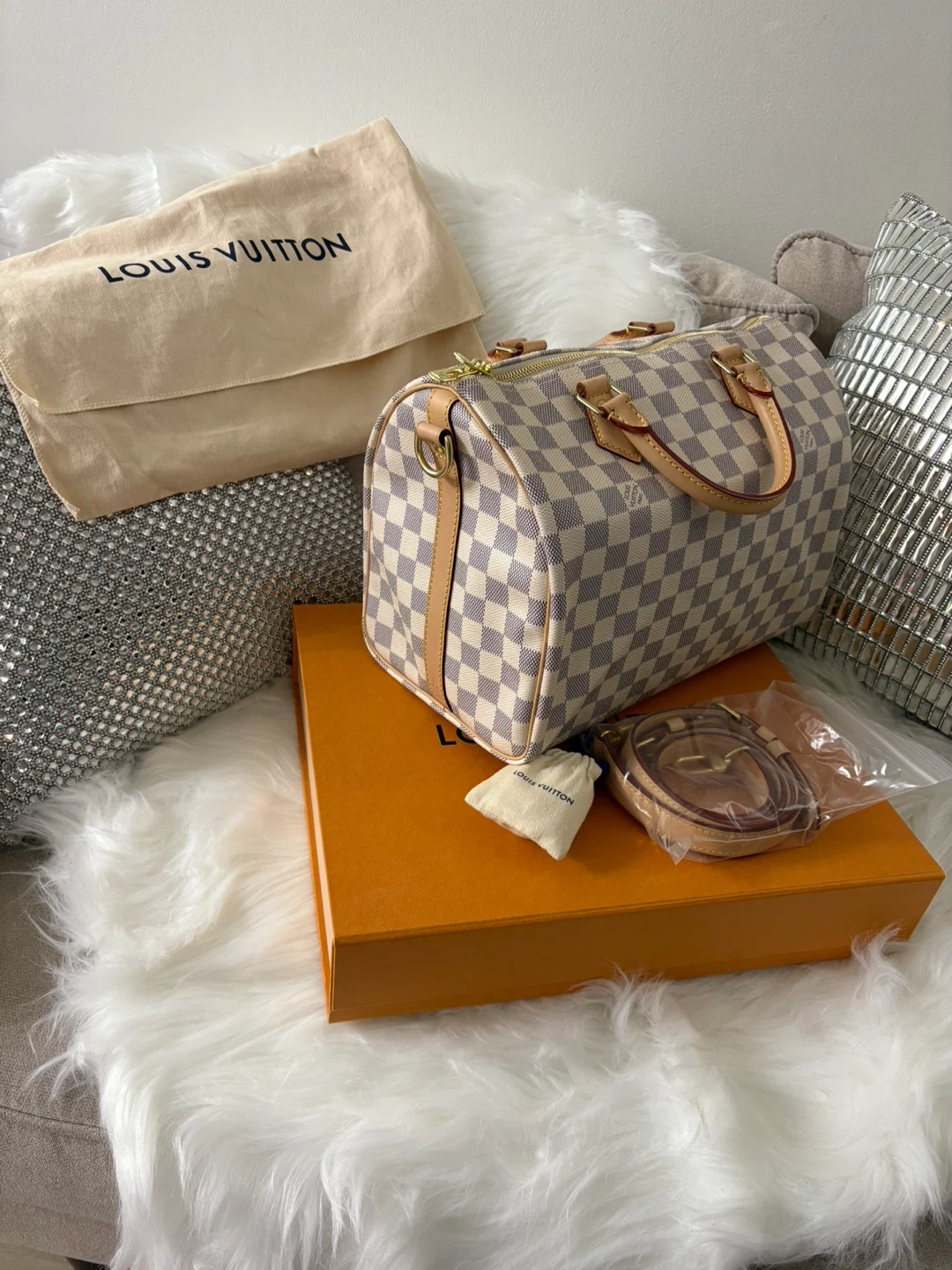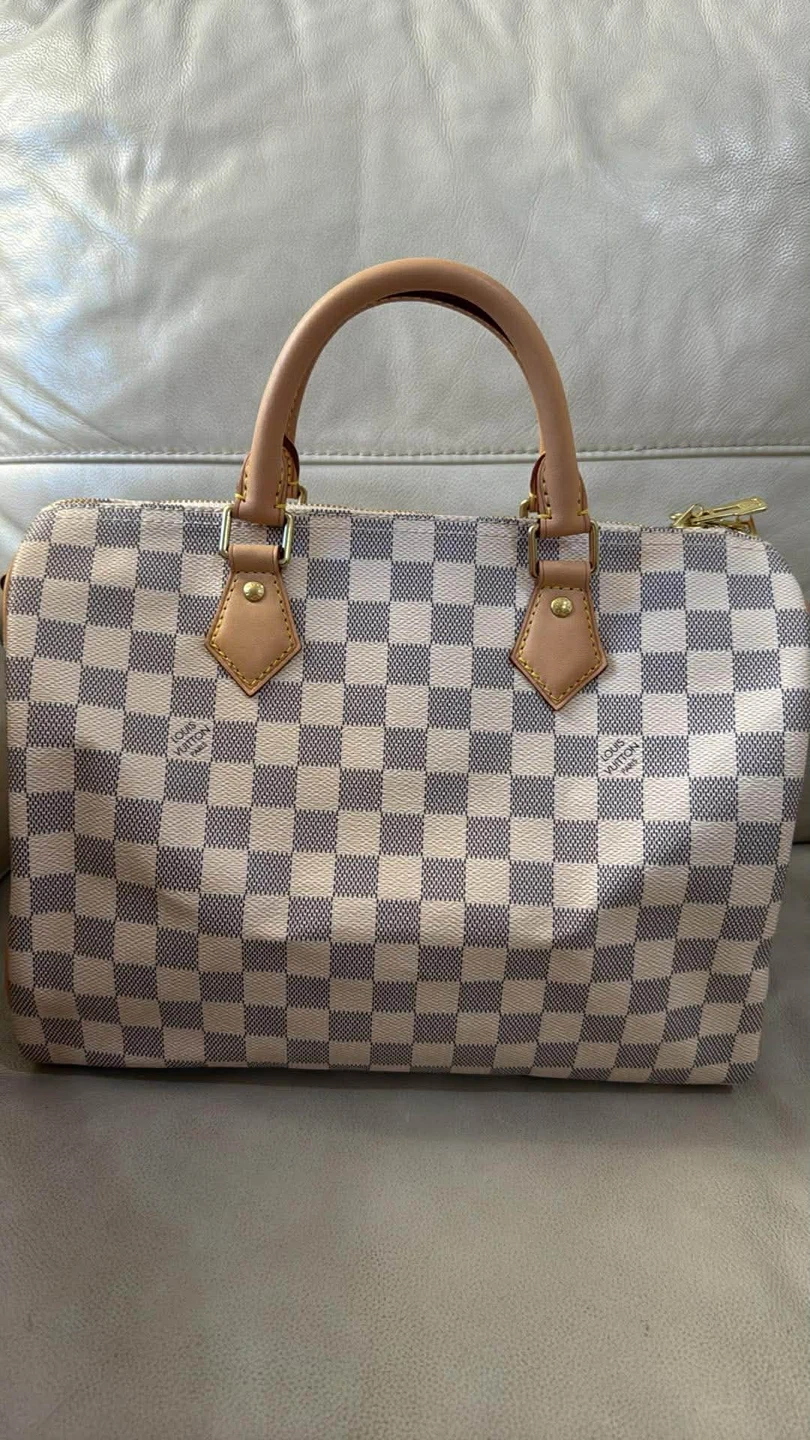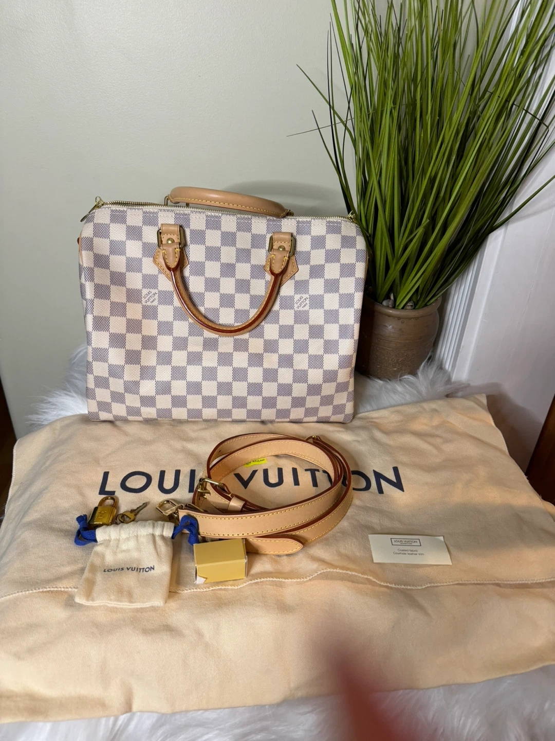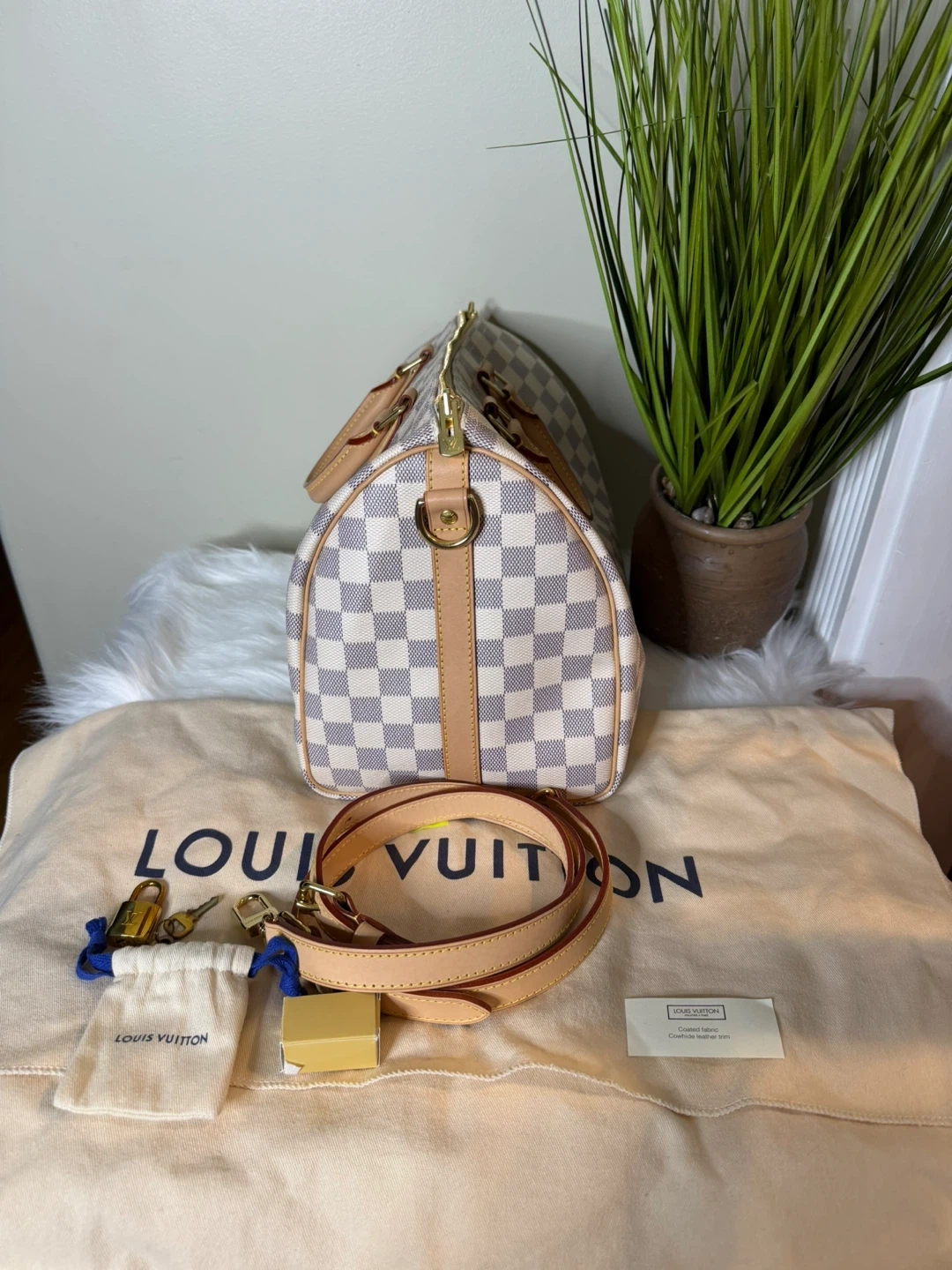 Selling a Louis Vuitton Speedy 25 in the Damier Azur pattern! It's in great condition and comes with the original box and dust bag. This classic bag is perfect for everyday use and adds a touch of luxury to any outfit