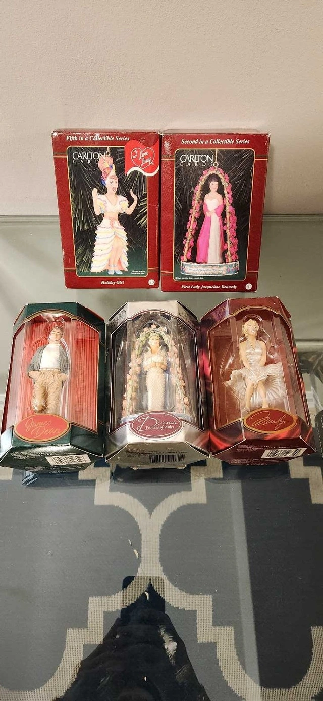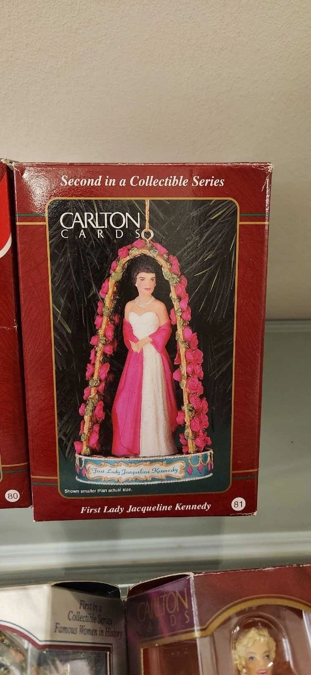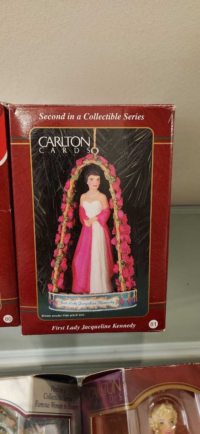 I'm offering a set of collectible ornaments, including Carlton Cards and famous women on history ornaments, all in their original packaging. These ornaments have been carefully stored and are in good condition, making them a great addition to any collection.