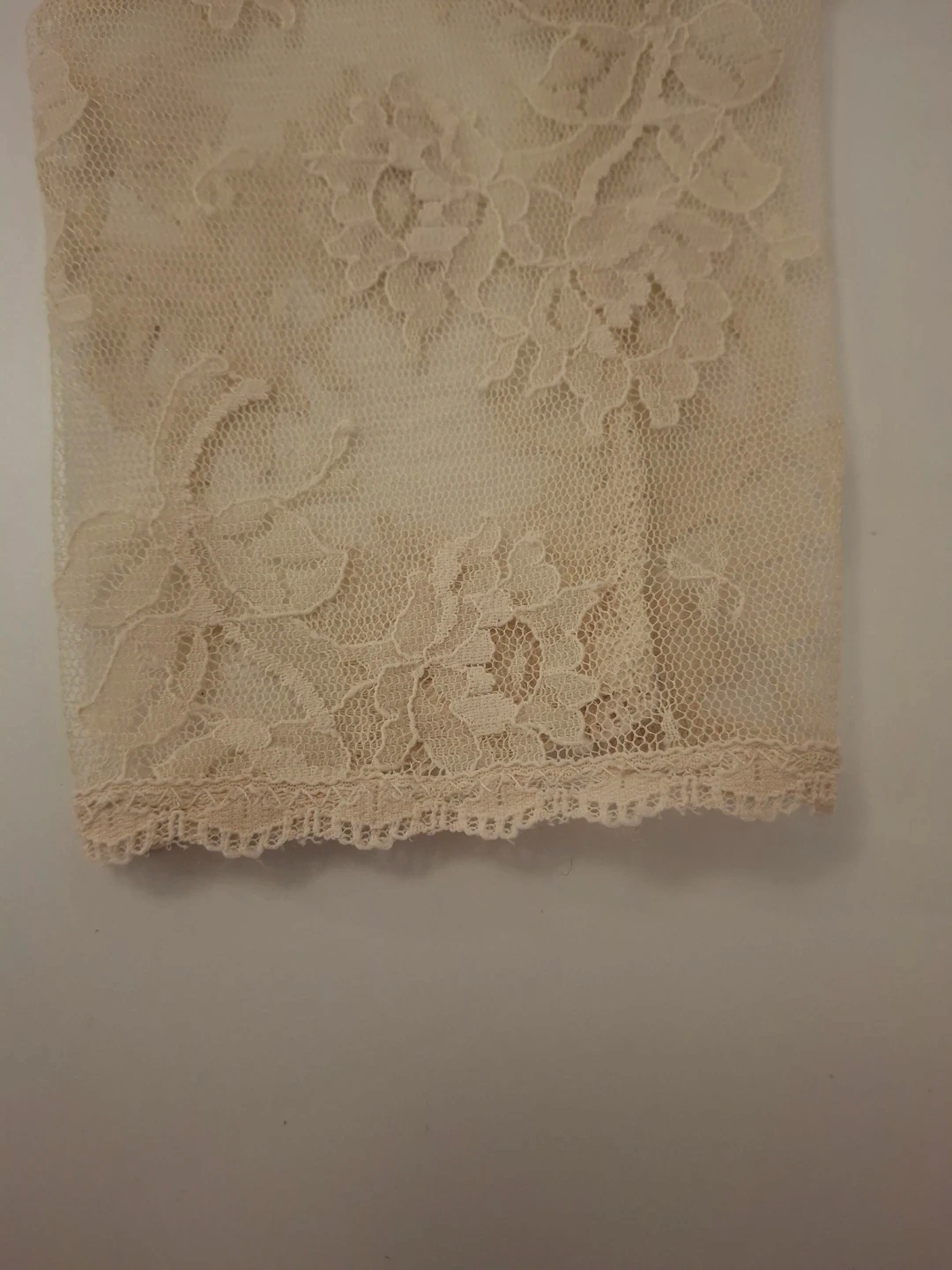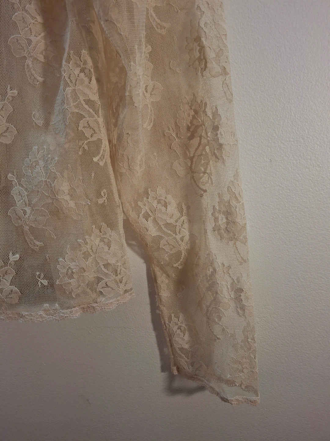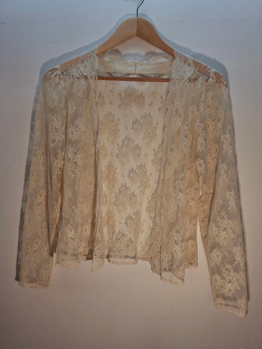 A gorgeous delicate, vintage lace cream-coloured bolero shrug. Perfect for adding a touch of elegance to any outfit. The lace detailing is so pretty, and it's in great condition. It would be a lovely addition to your wardrobe.