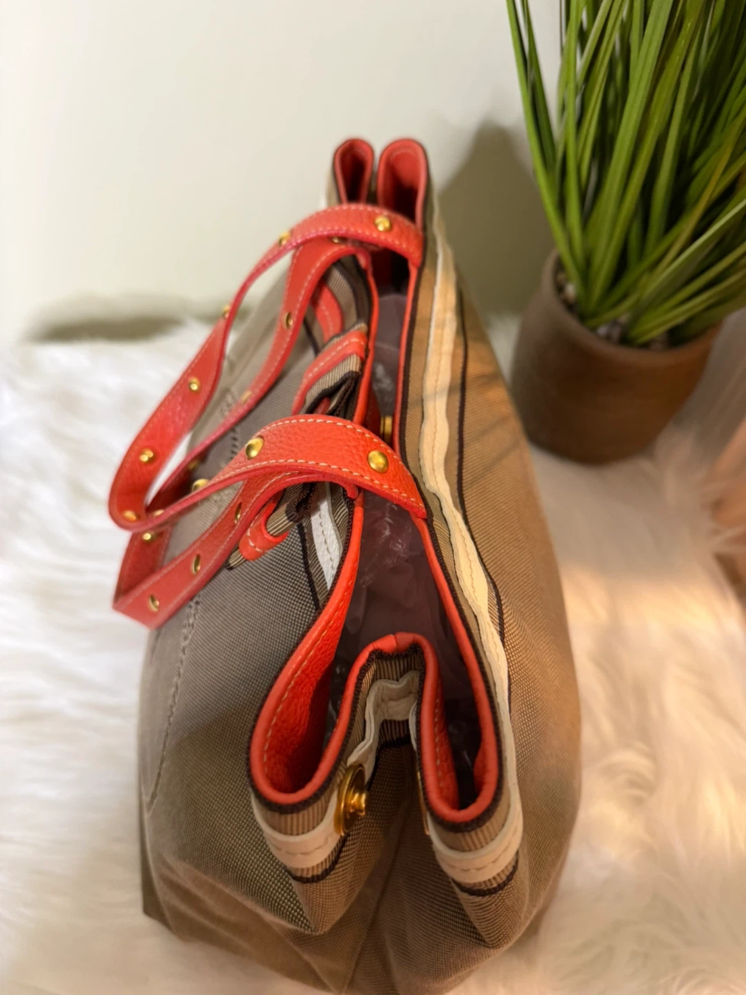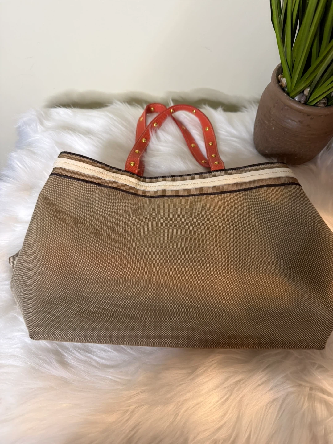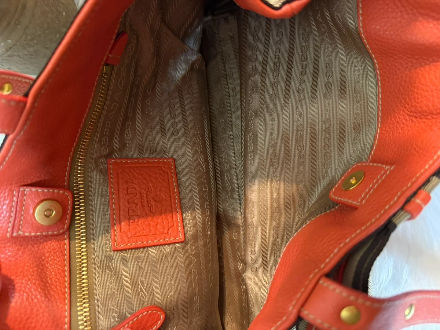 Selling a Prada Milano tote bag. It features orange handles with gold studs and a striped accent. The bag is in good condition and ready for a new owner!