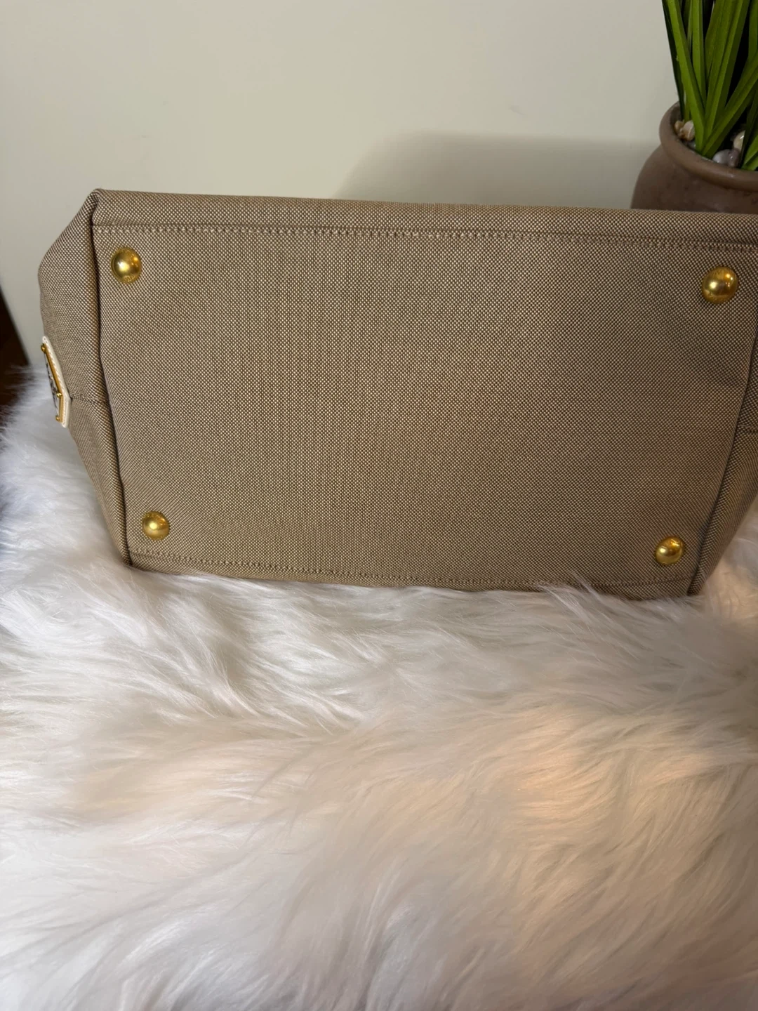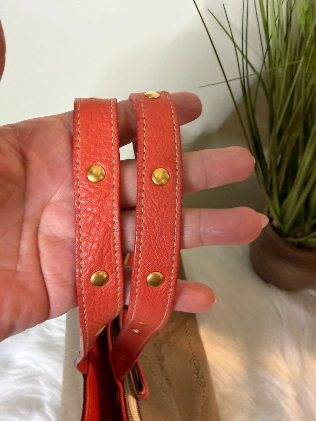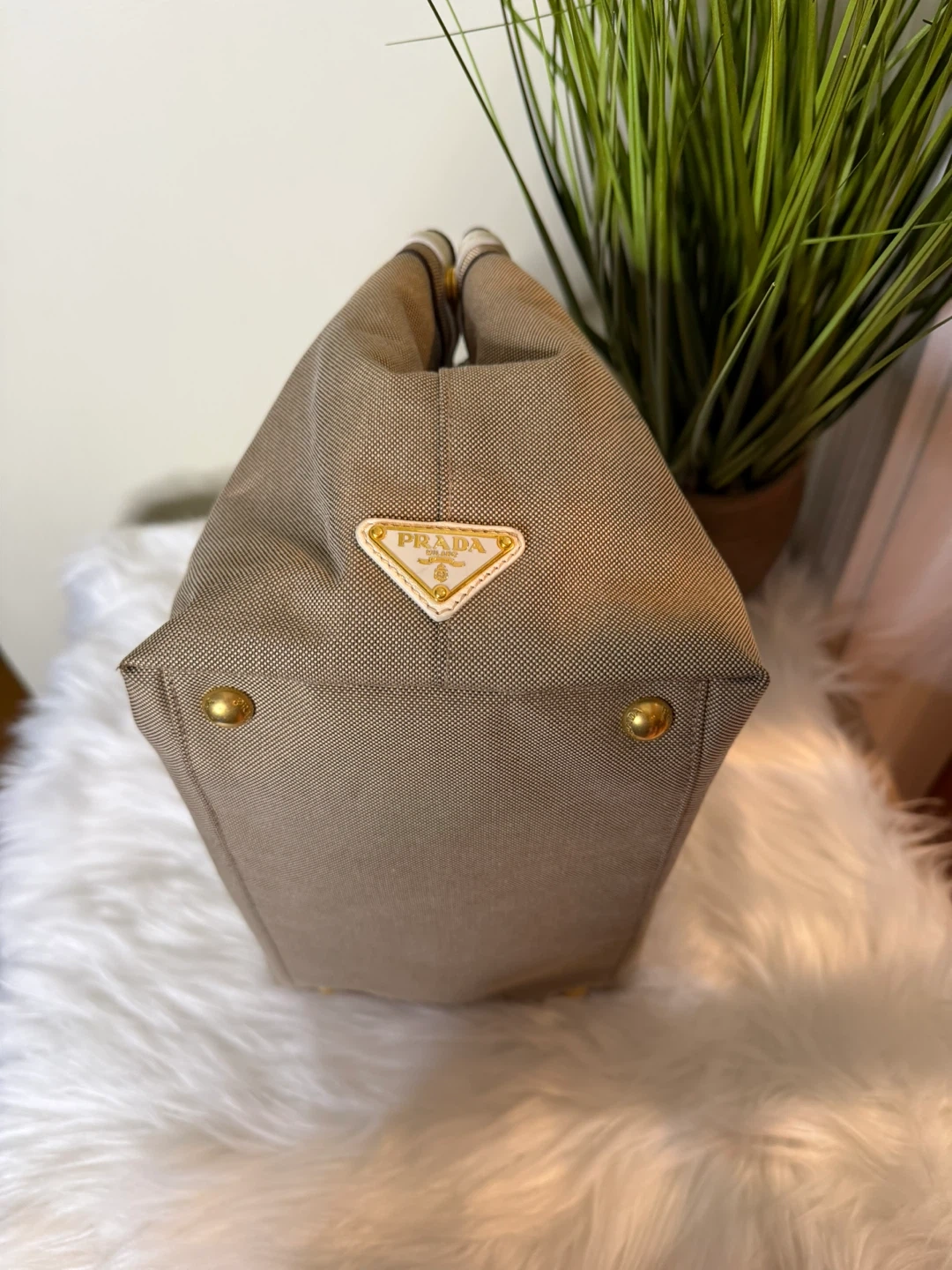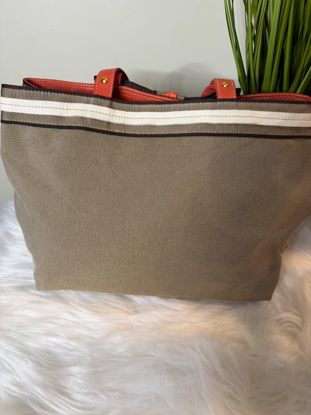 Selling a Prada Milano tote bag. It features orange handles with gold studs and a striped accent. The bag is in good condition and ready for a new owner!