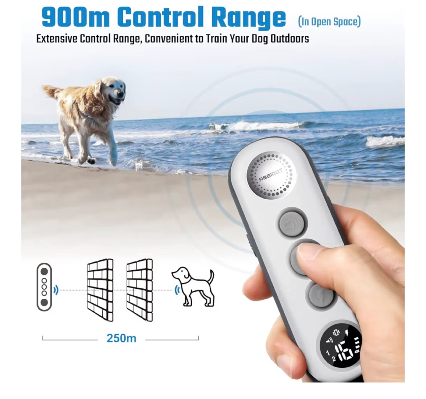 This ABBIDOT dog training collar is designed for dogs weighing between 3 to 55kg. It features a 900m control range in open spaces, making it convenient for outdoor training. The collar is lightweight and comes with 3 training modes: Beep, Vibrate, and Safe Shock with Beep (Level 1~16).