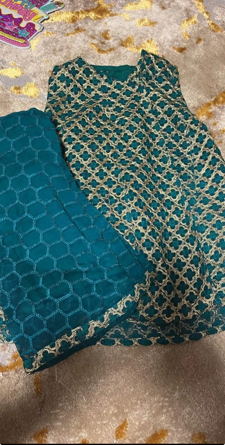 Beautiful green salwar kameez with gold embroidery detailing. Perfect for special occasions or adding a touch of elegance to your wardrobe! The fabric has a lovely texture and the gold embroidery adds a touch of sparkle. Great for weddings and special occasions for kids age 2 to 4 years