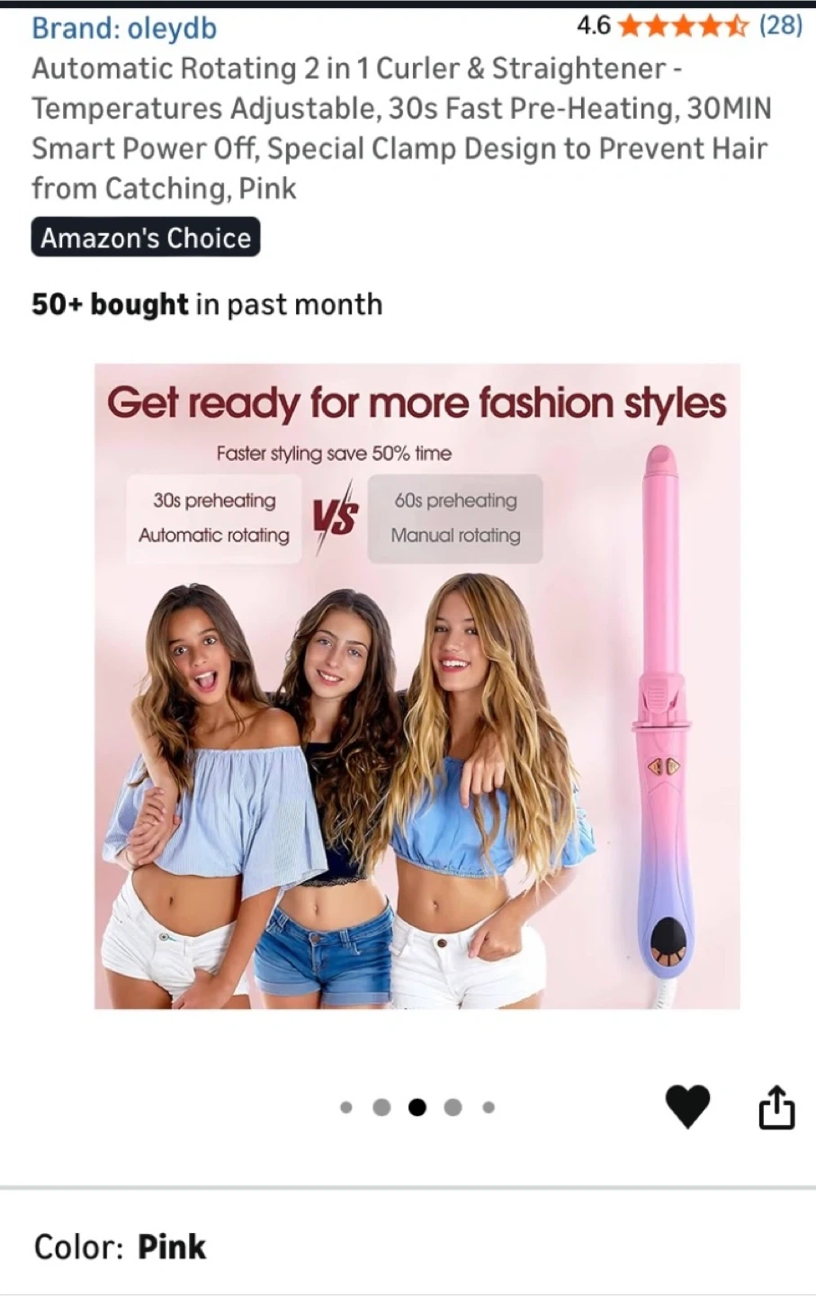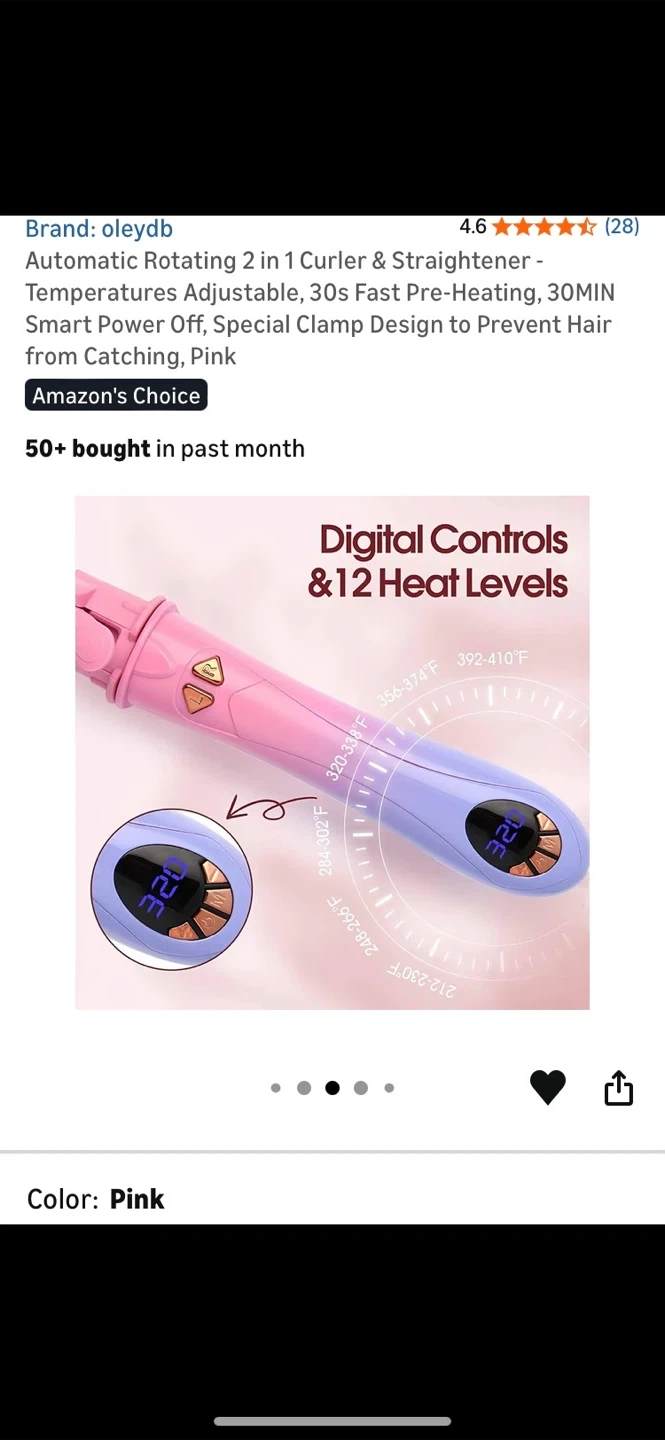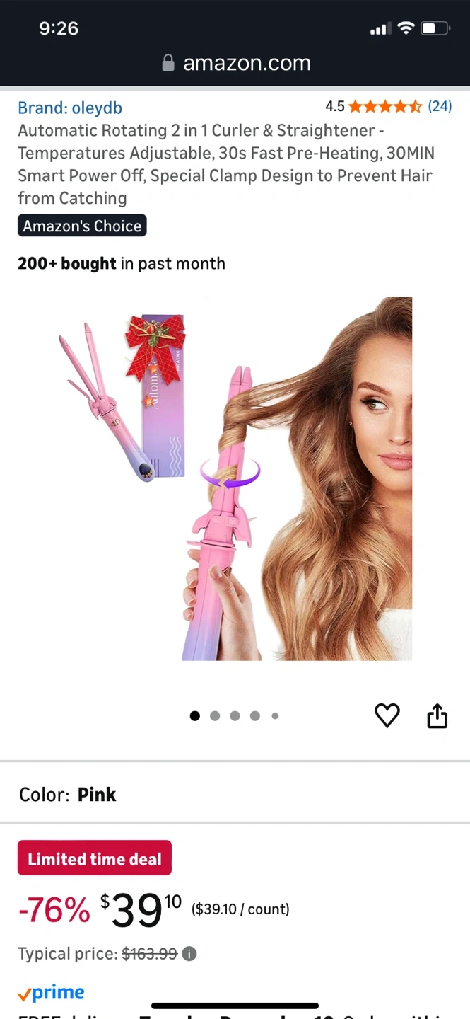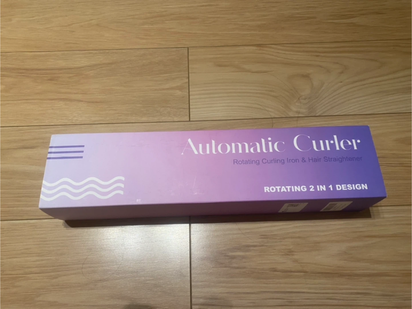 Brand new In an unopened box - oleydb Automatic Rotating 2 in 1 Curler & Straightener in pink! It features adjustable temperatures, 30s fast pre-heating, and a 30MIN smart power off; also has a special clamp design to prevent hair from catching.