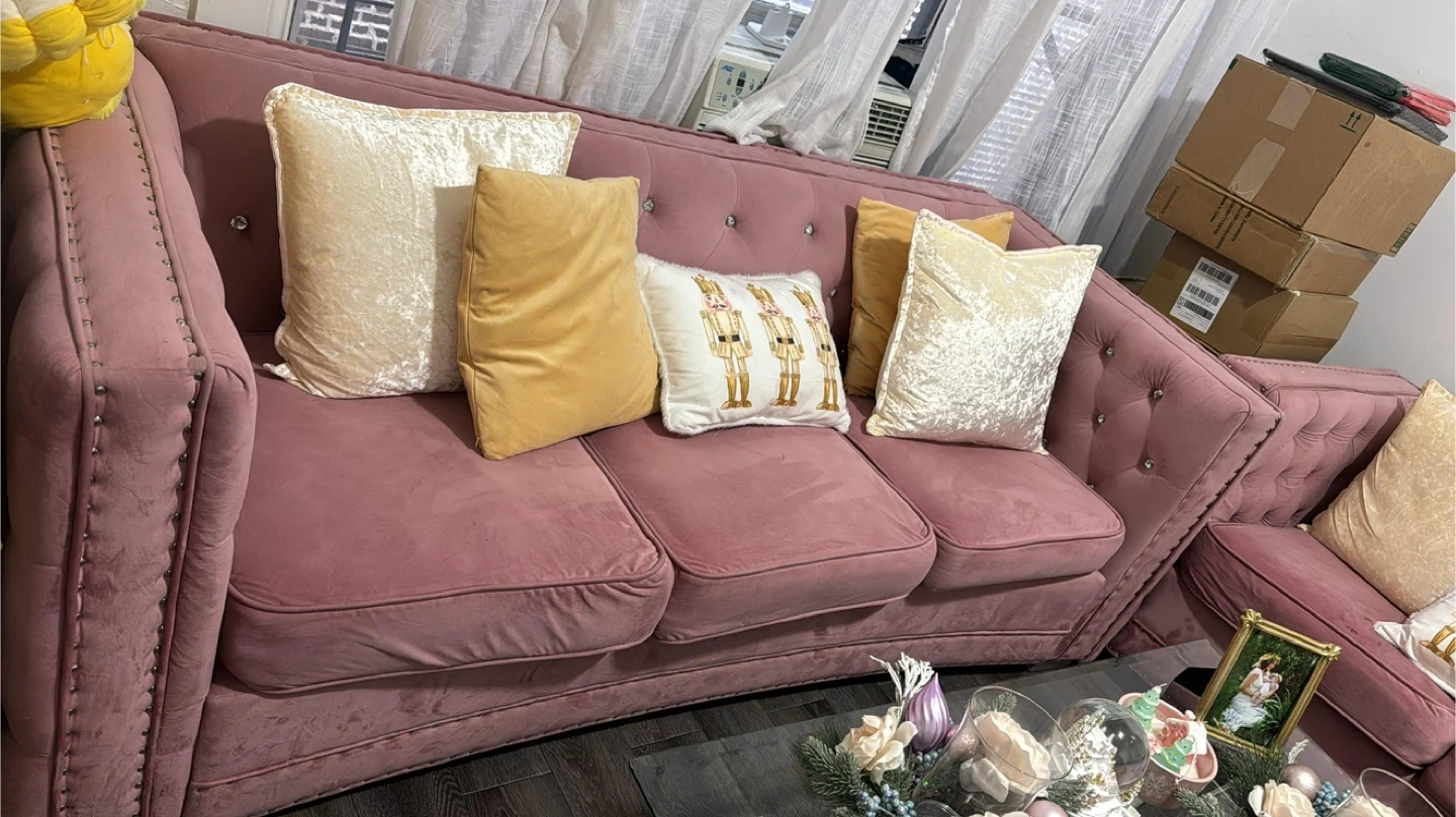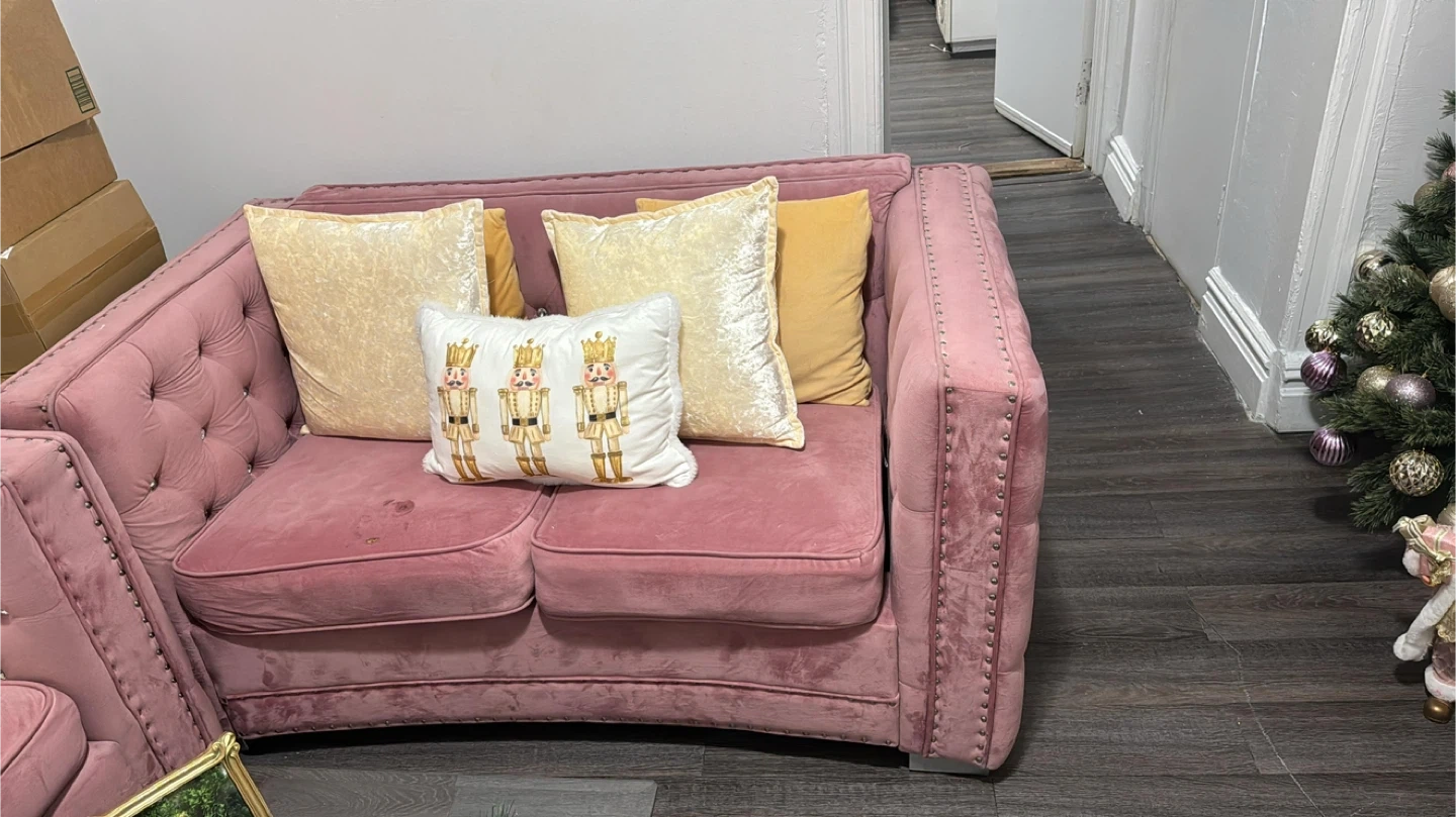 Selling a beautiful pink velvet sofa and loveseat set! This set would be a great addition to any home. The tufted design adds a touch of elegance and the soft velvet material makes it comfortable and inviting