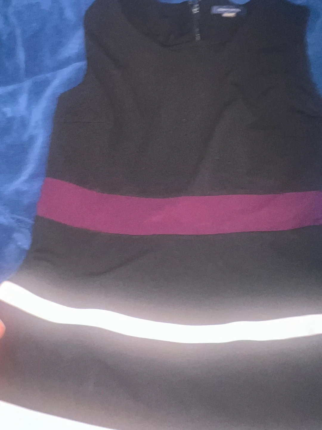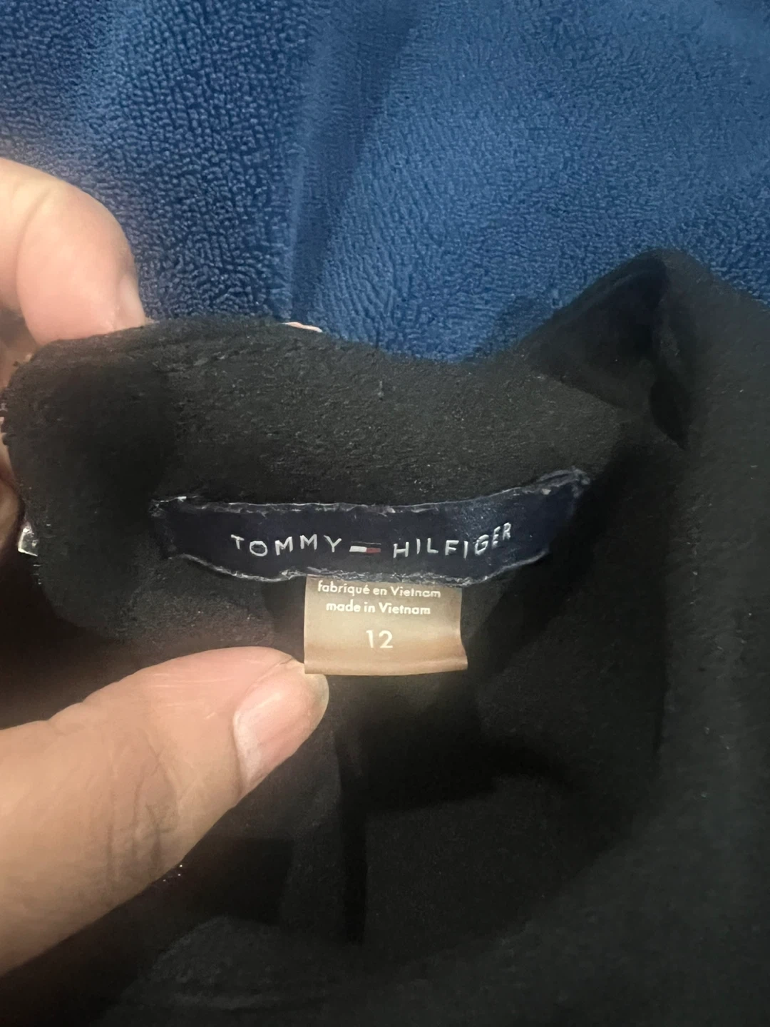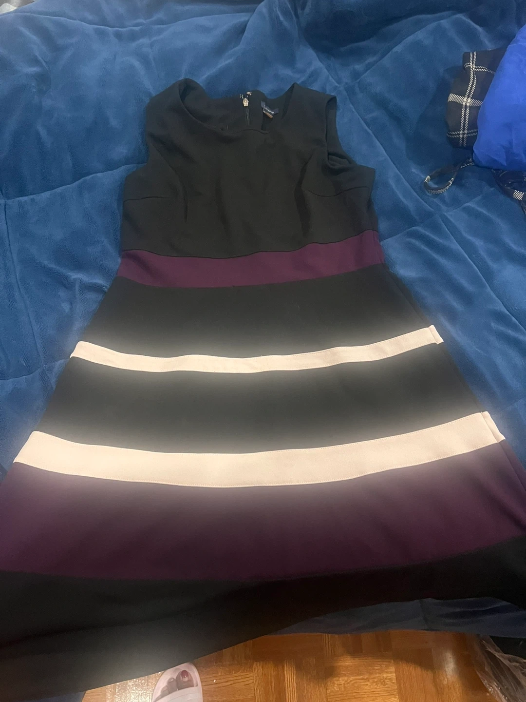 Selling a Tommy Hilfiger dress in size 12. It features a black top, with horizontal stripes in purple, white, and black on the skirt. It's in great condition!