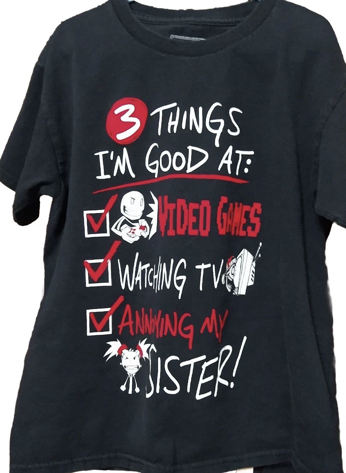Fun and playful boys graphic T-shirt featuring a bold gamer-themed design with a humorous slogan: “3 Things I’m Good At: Video Games, Watching TV, Annoying My Sister!” Perfect for everyday wear, lounging, or as a fun gift for a gamer kid.