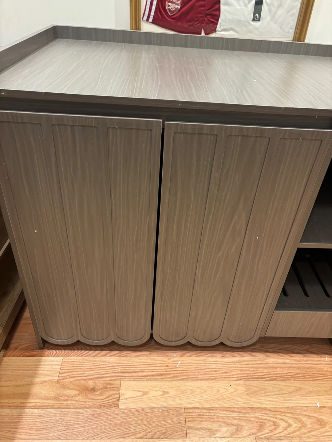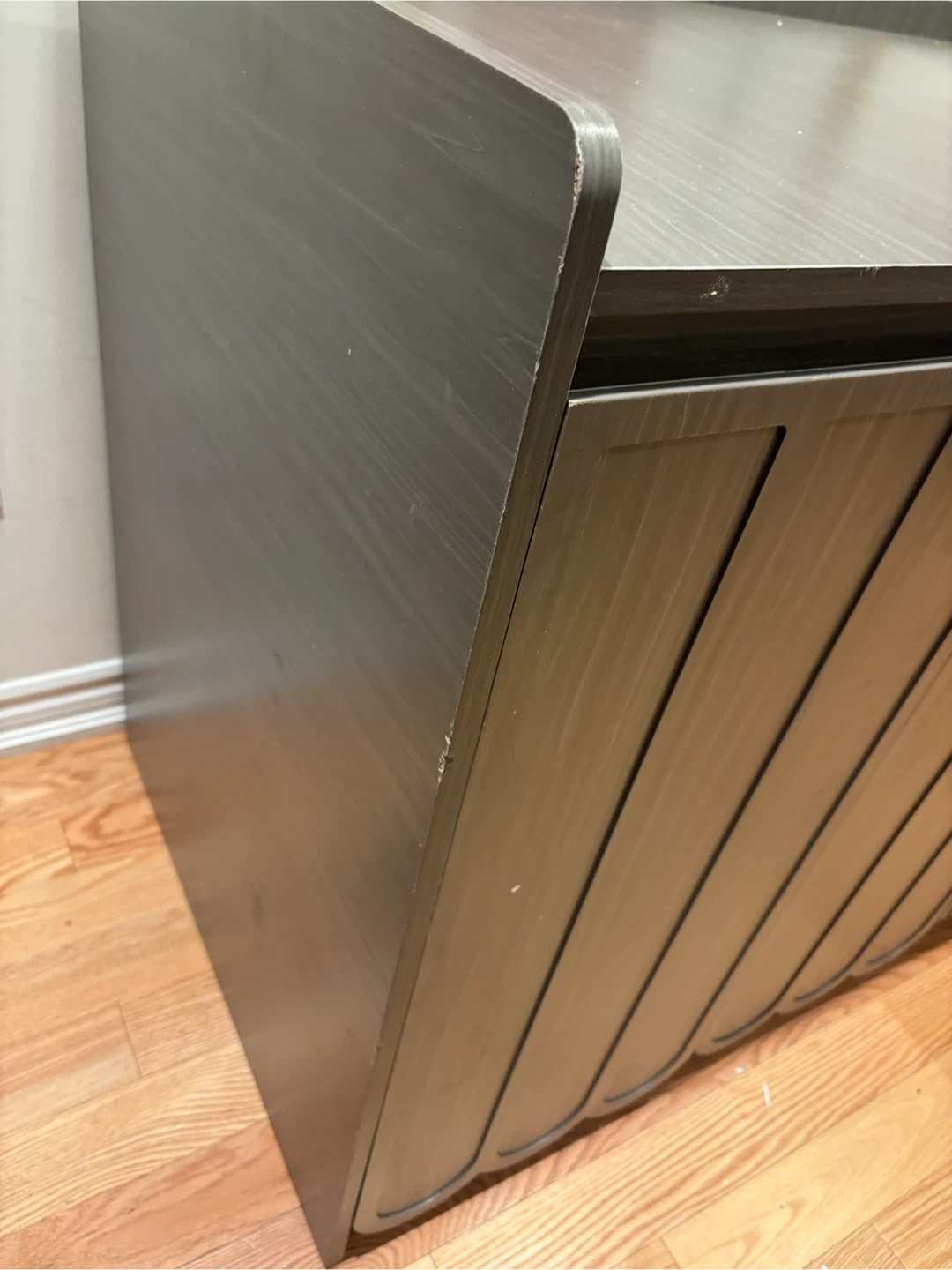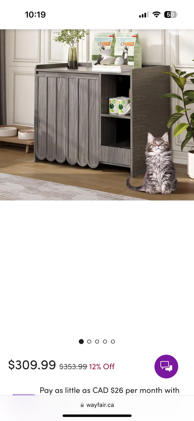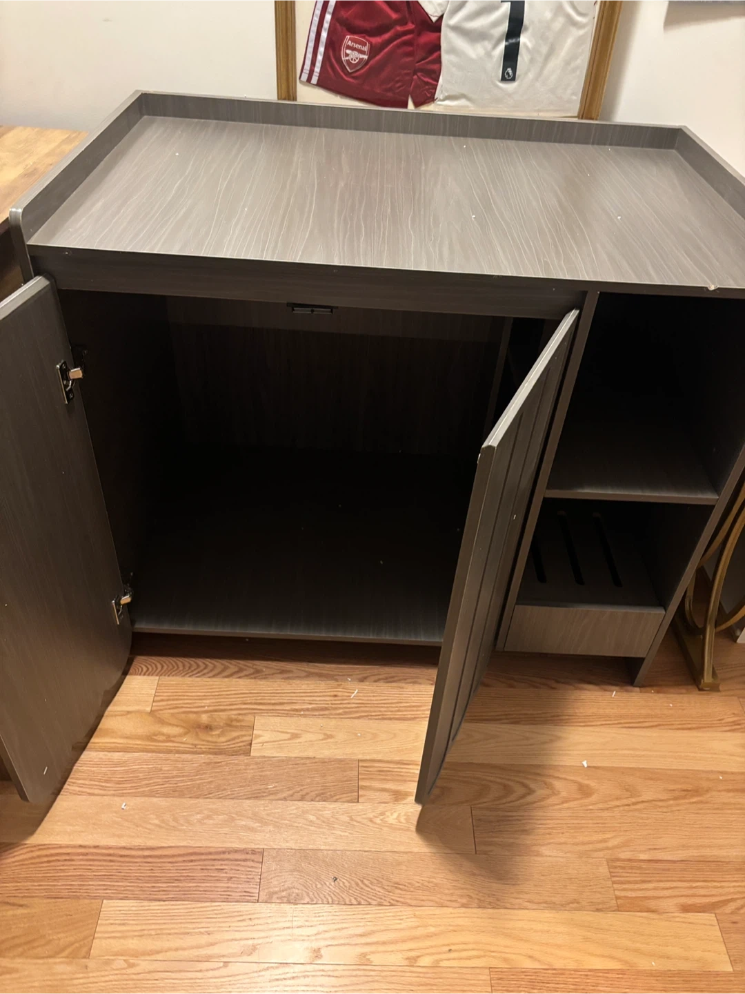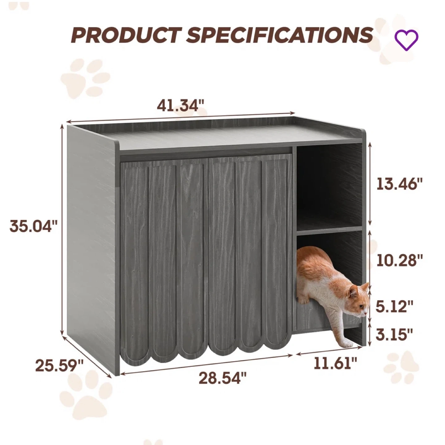 Selling a large cat litter box enclosure fThe dimensions are 41.34" x 35.04" x 25.59". It features a stylish grey wood finish and provides a discreet space for your cat's litter box. Available for pickup and delivery