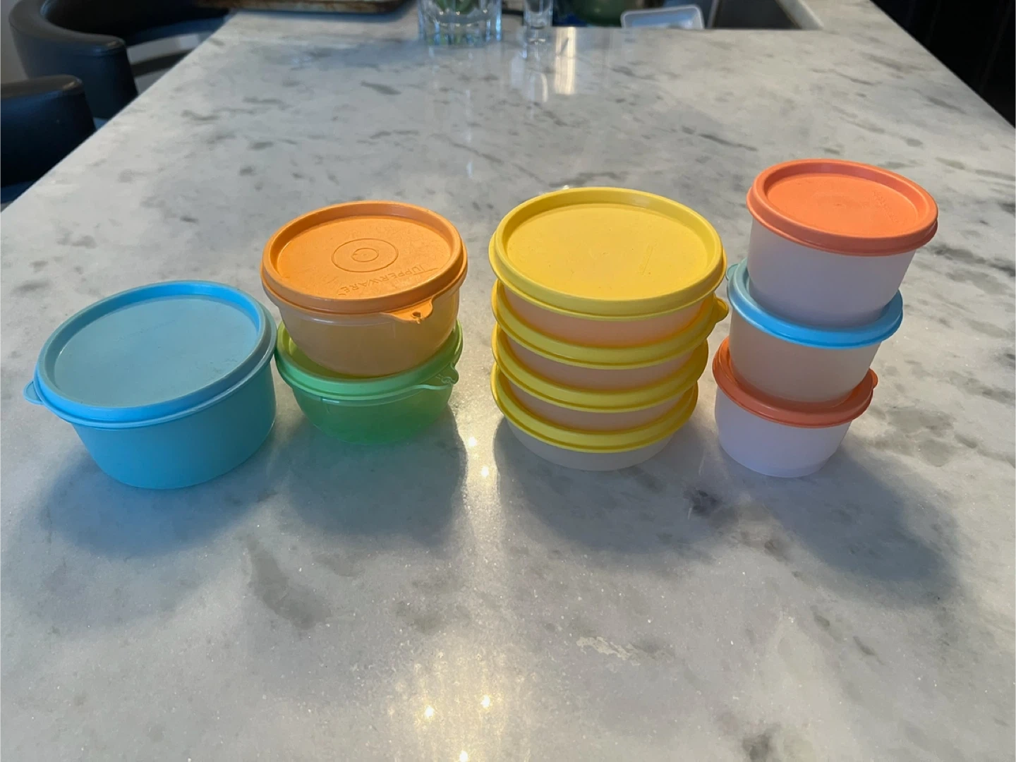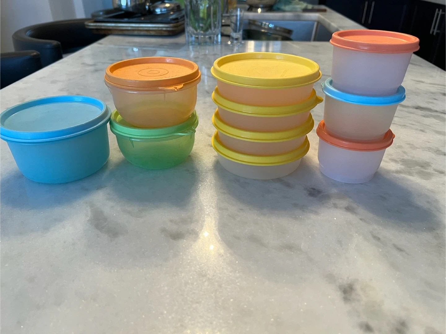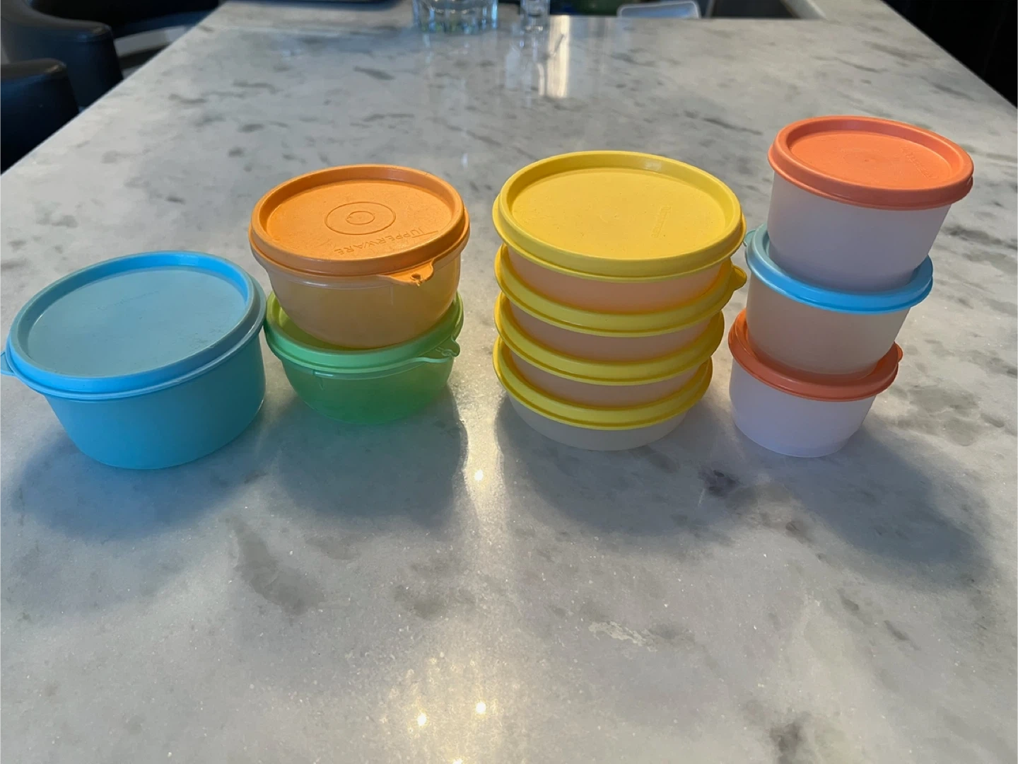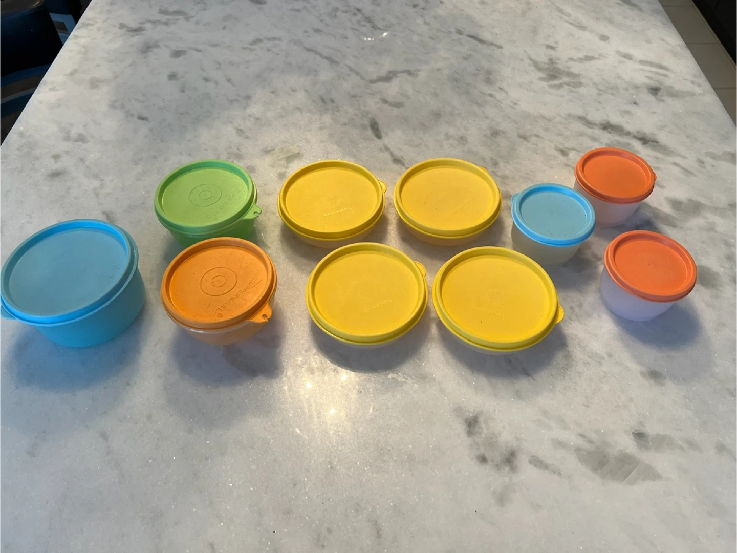 Selling a set of colourful Tupperware brand storage containers! They come in various sizes and colours, perfect for storing leftovers or packing lunches. The set includes blue, orange, yellow, and green containers. Great for keeping your food fresh and organized!