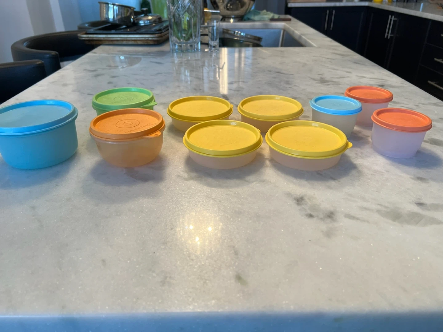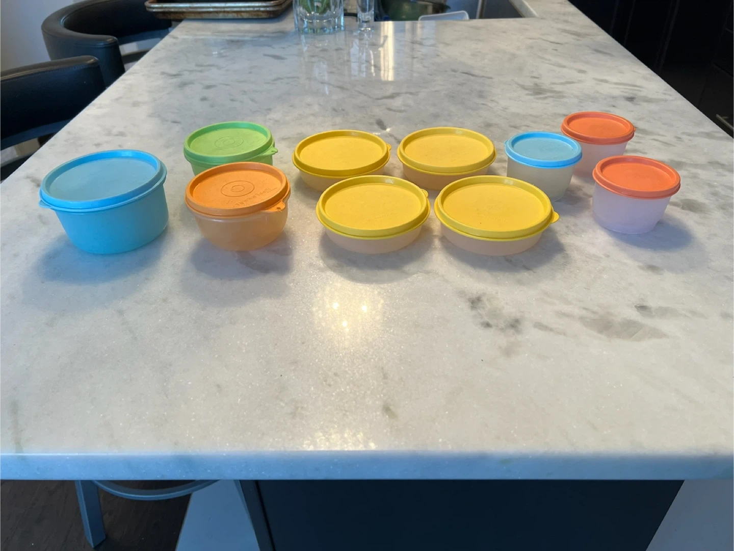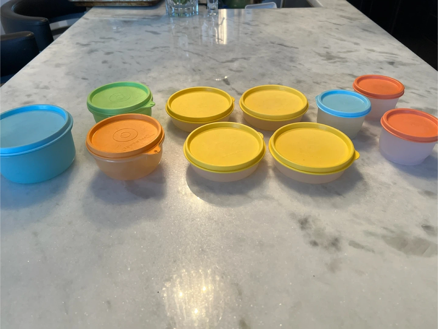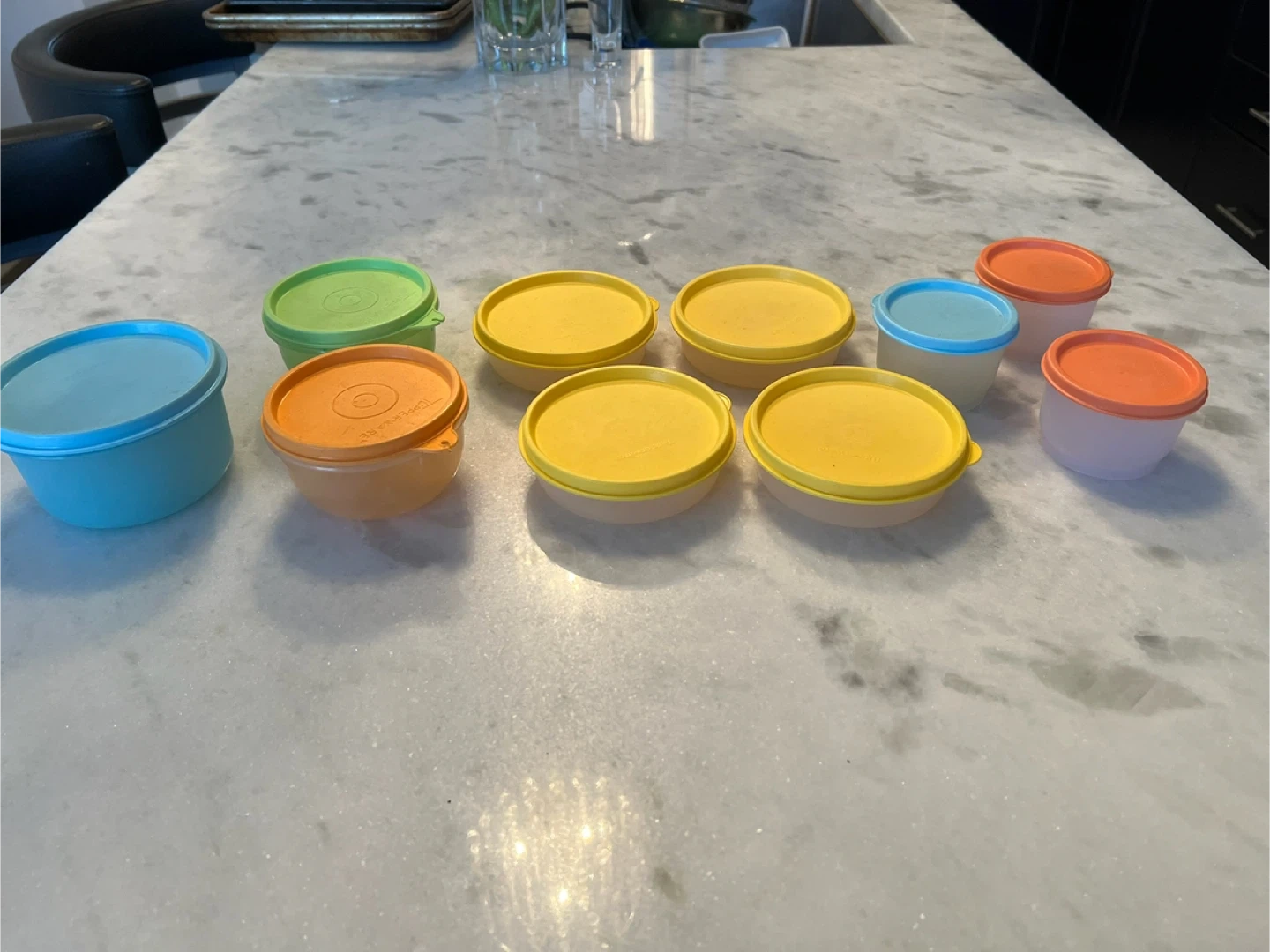Selling a set of colourful Tupperware brand storage containers! They come in various sizes and colours, perfect for storing leftovers or packing lunches. The set includes blue, orange, yellow, and green containers. Great for keeping your food fresh and organized!