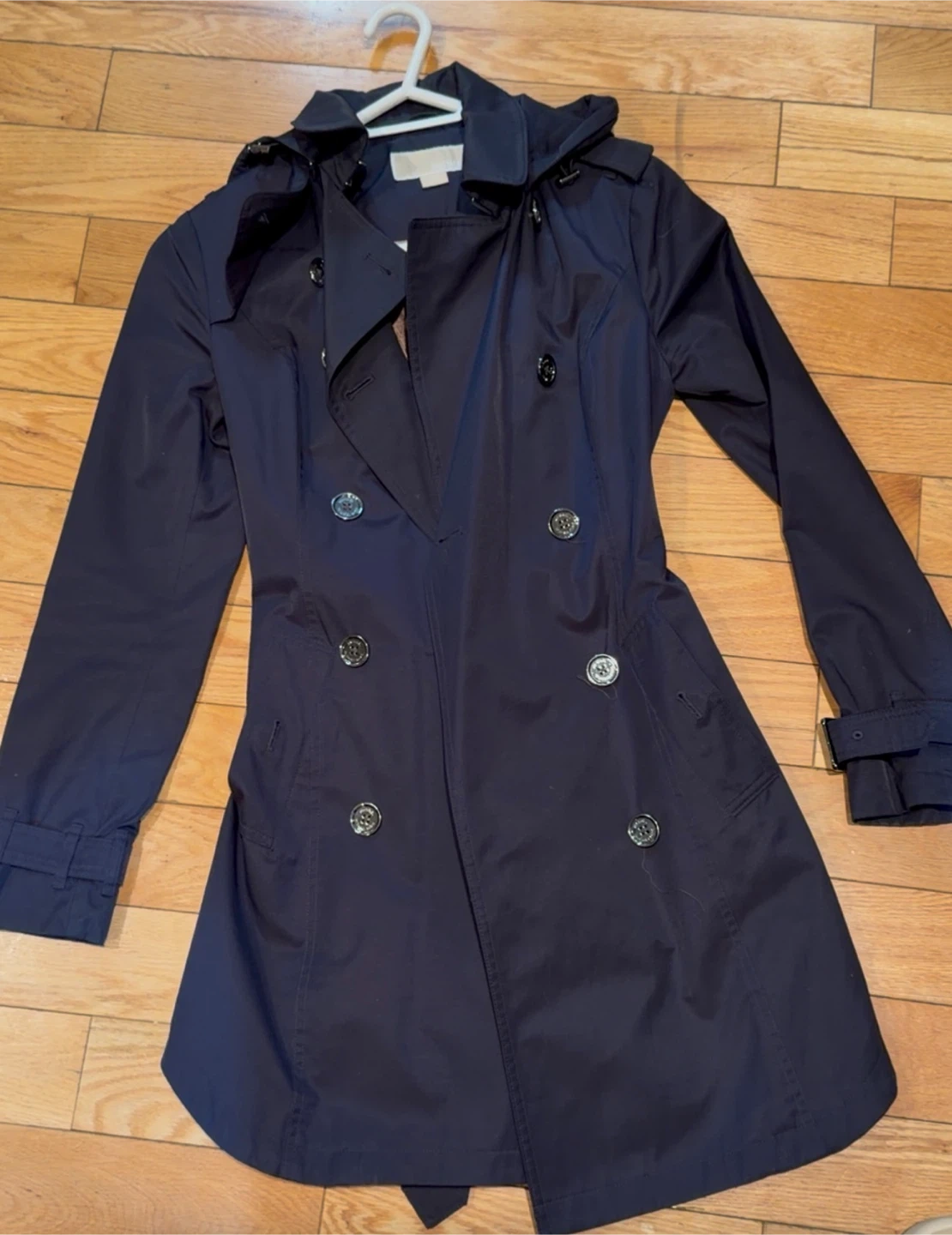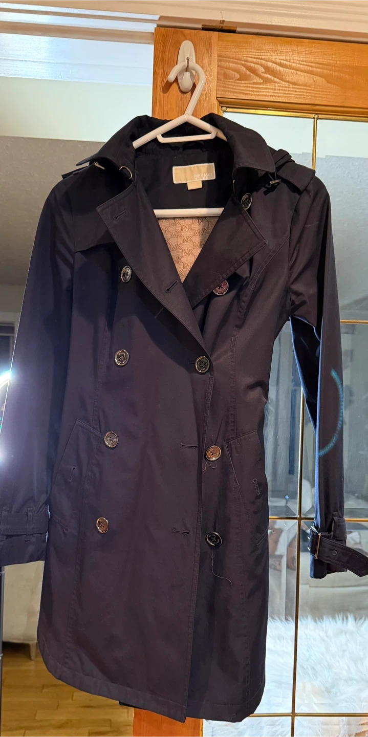 A stylish Michael Kors trench coat in a classic navy blue colour. This coat is perfect for those in-between weather days. It features a double-breasted design with button closures and a flattering silhouette. It's in great condition and ready for a new owner!