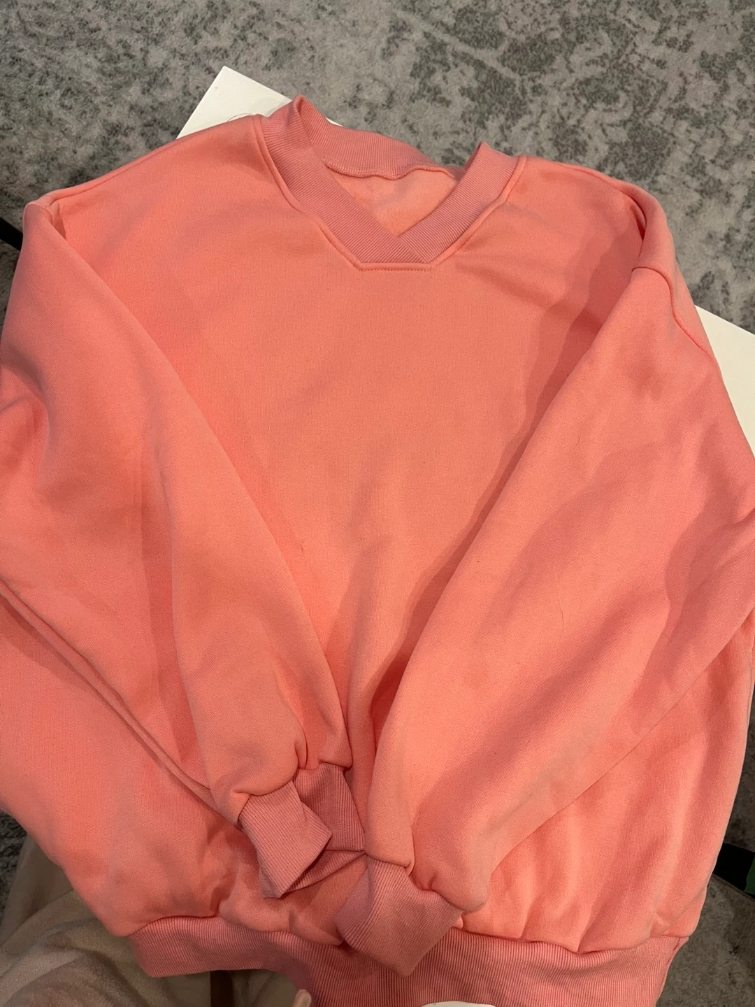Selling a comfy peach-coloured crewneck sweatshirt! It's in great condition and perfect for layering or wearing on its own. The material is soft and cozy, making it ideal for everyday wear. It would make a great addition to your wardrobe!