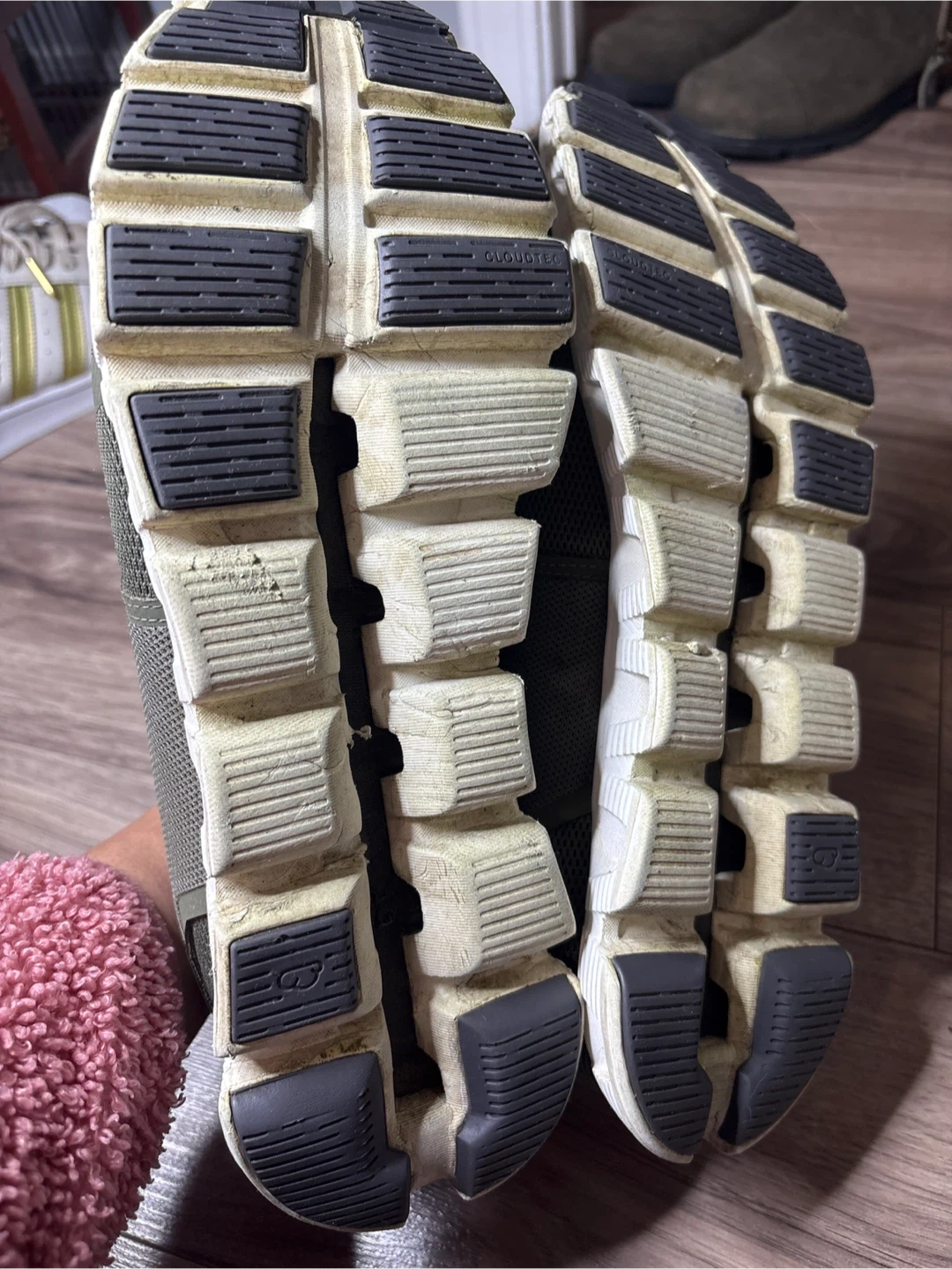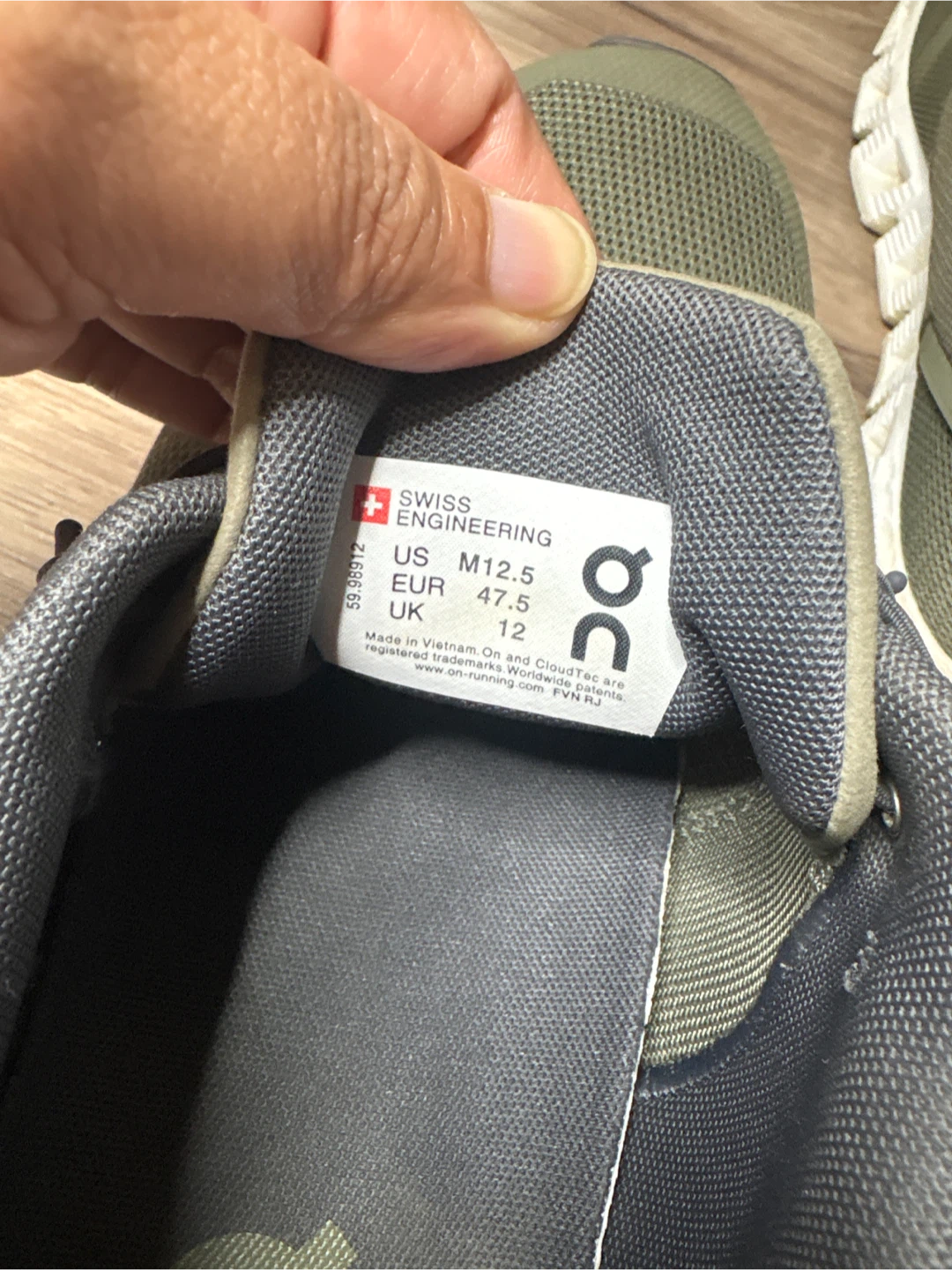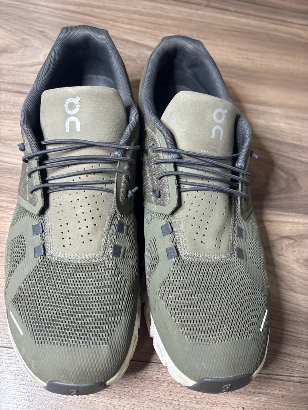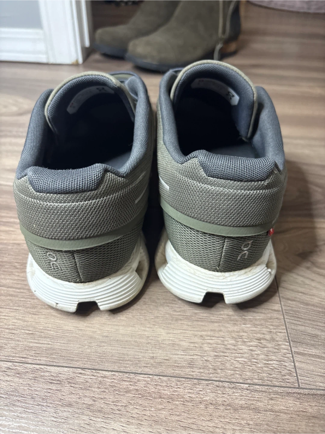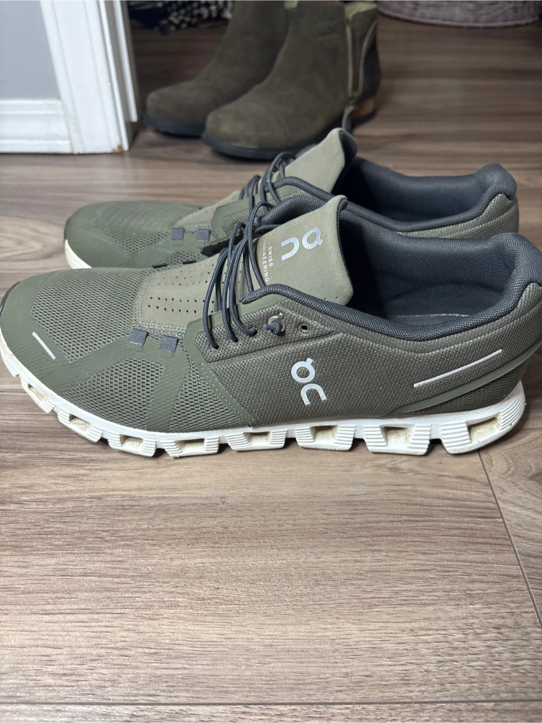 Selling a pair of On Cloud 5 men's running shoes in olive. They are in great condition and ready for your next run! Size is US 12.5.