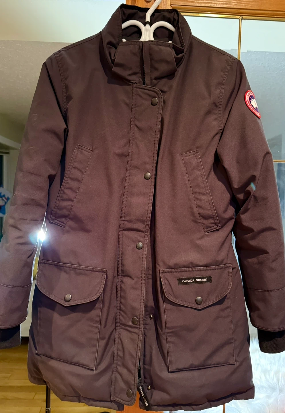 Selling a Canada Goose parka for women. It is in great condition and has the classic Canada Goose logo on the arm. It's a stylish and warm jacket for the Canadian winter!