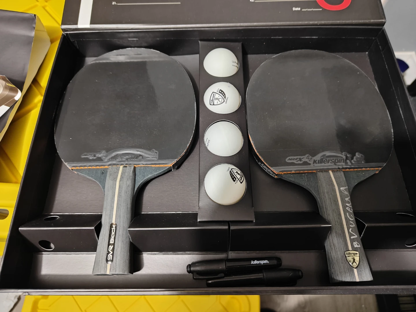 Selling a Killerspin SVR Black 2U table tennis set. It comes with two paddles, three balls, and a case, plus additional balls. The paddles have black rubber and the Killerspin logo on the handle. The set also includes a pen.