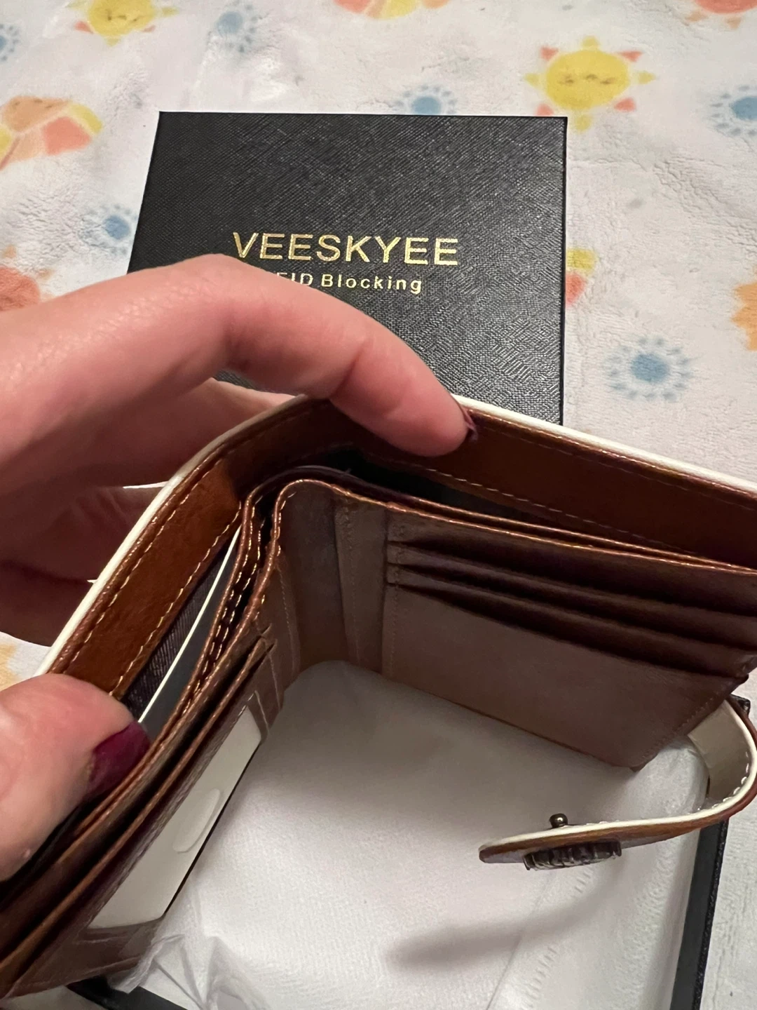 Check out this brand new VEESKYEE RFID blocking wallet! It comes in a stylish brown and white colour combination and includes the original box. Perfect for keeping your cards and cash safe!