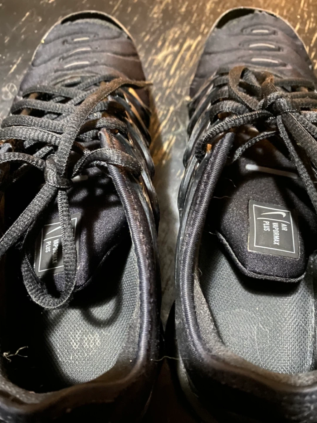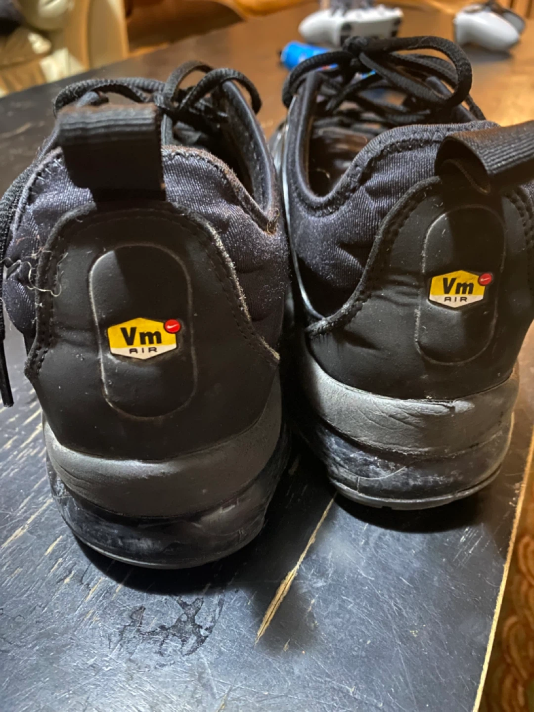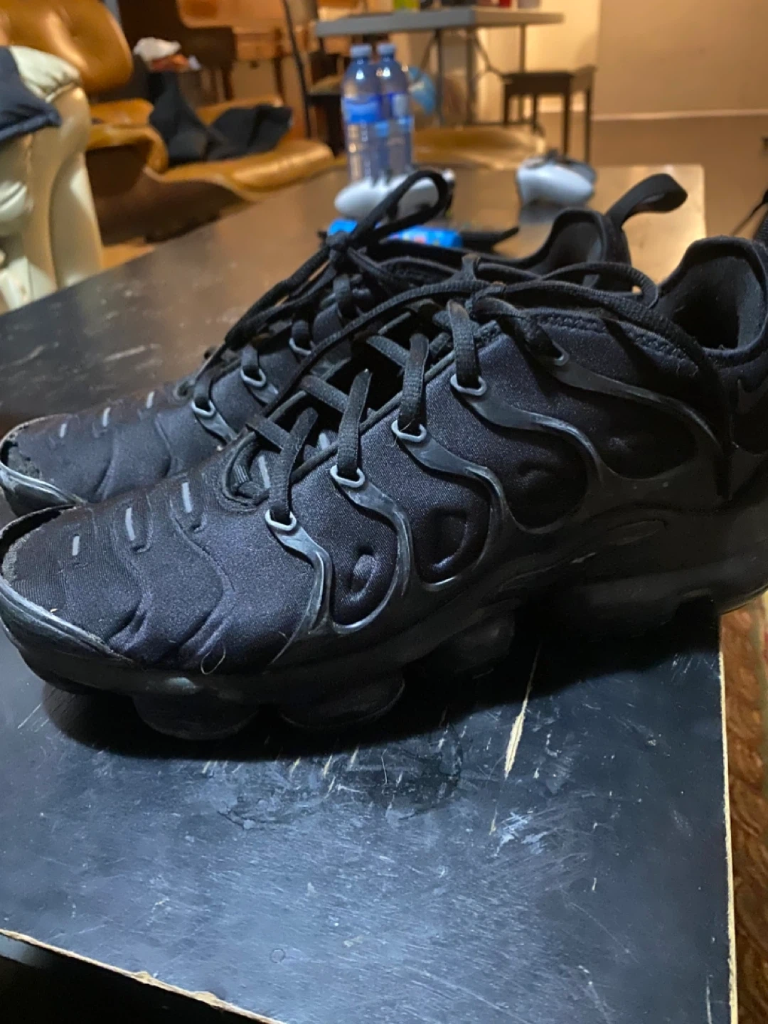 Selling a pair of Nike Air VaporMax Plus sneakers in black. They show some signs of wear, as you can see in the photos.