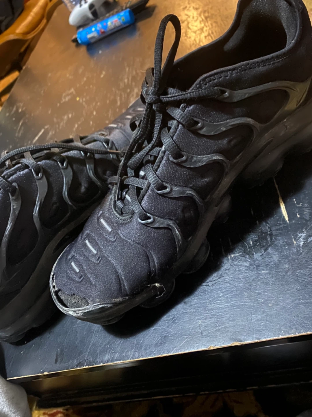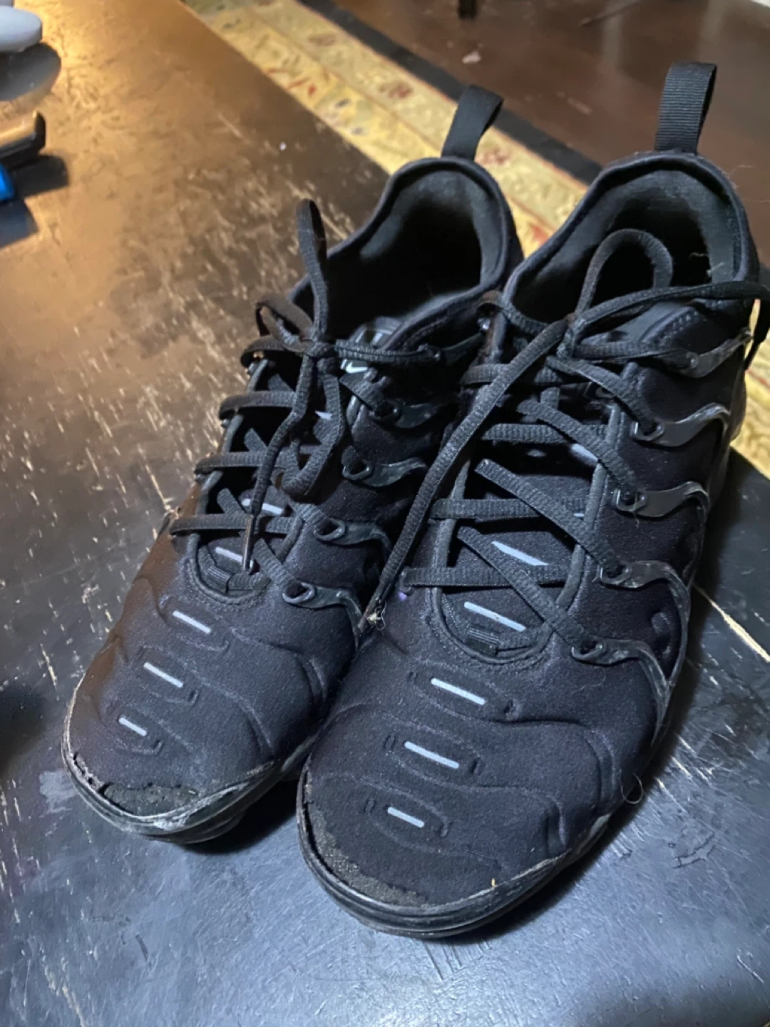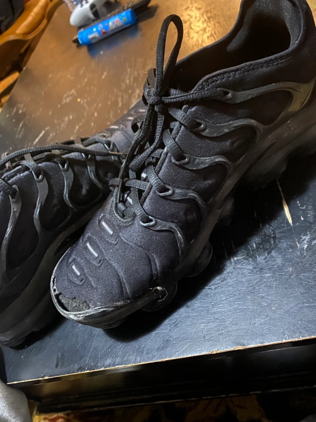 Selling a pair of Nike Air VaporMax Plus sneakers in black. They show some signs of wear, as you can see in the photos.