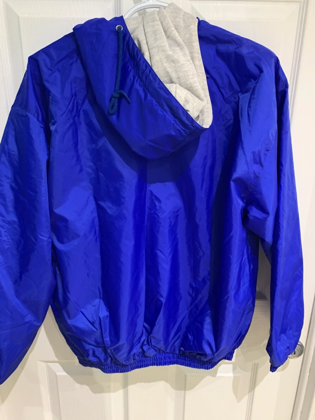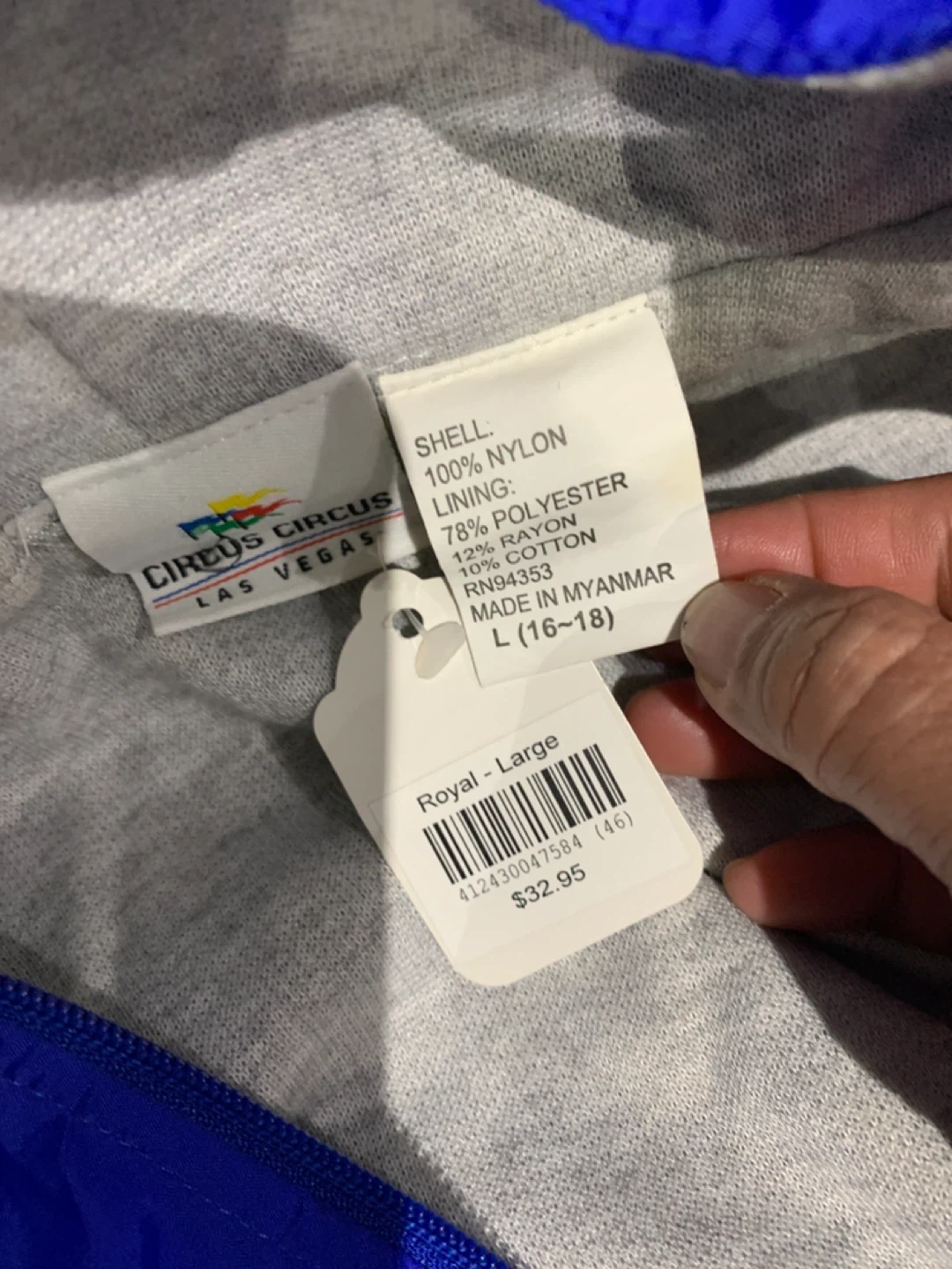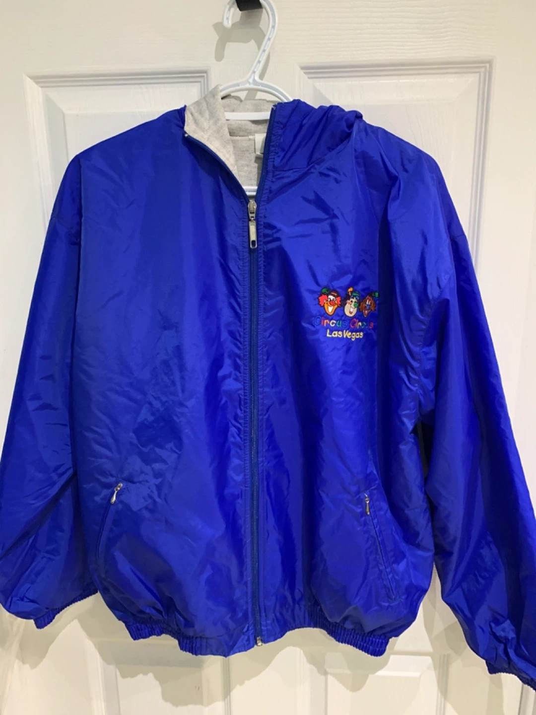 Selling a Circus Circus Las Vegas jacket in size L. It's a vibrant blue colour with a grey hood. The shell is 100% nylon and the lining is 78% polyester, 12% rayon, and 10% cotton. Originally bought for $32.95!