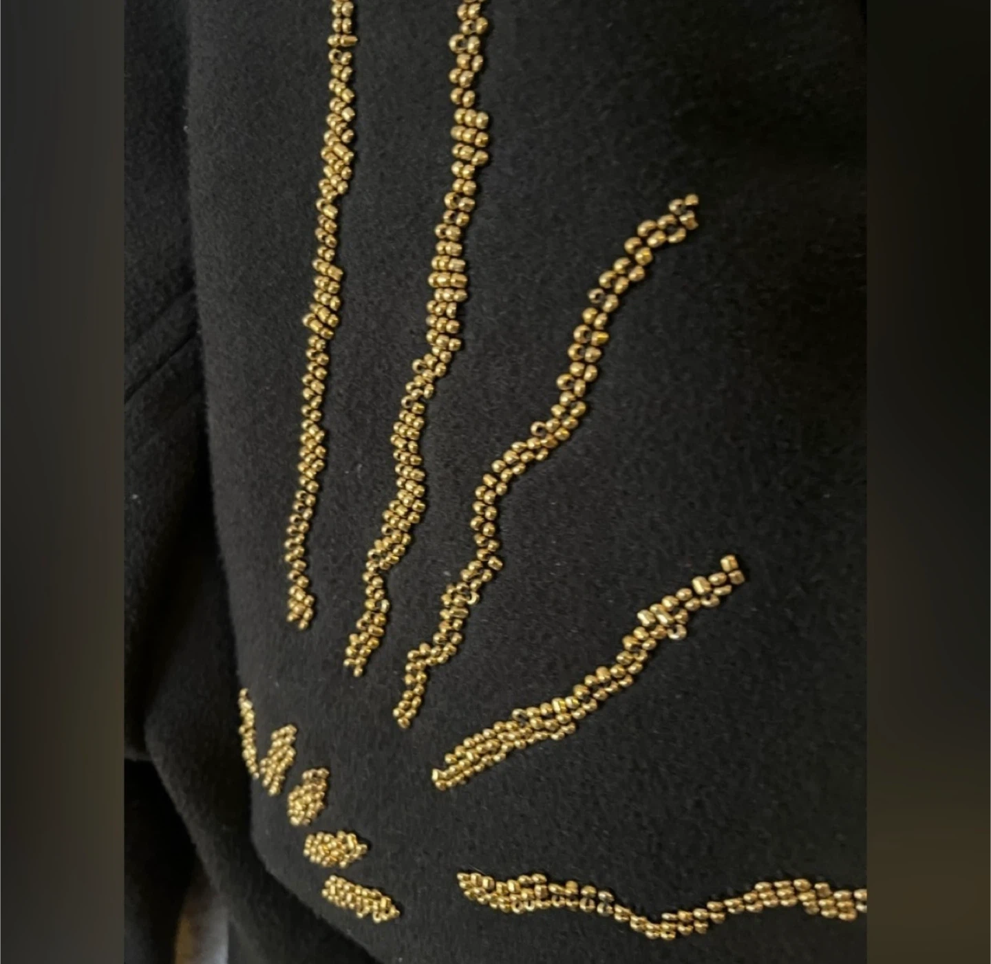 A striking black statement coat with dramatic gold beaded detailing and sculptural tailoring.