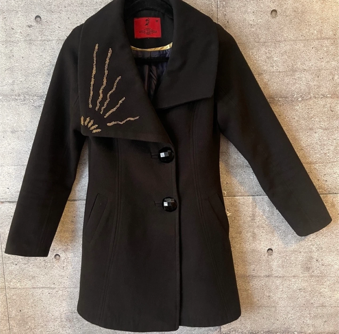 The asymmetric collar and hand-applied gold beadwork create a bold Art Deco / couture-inspired look. Beautifully shaped seams flatter the waist, while the substantial fabric gives the coat presence and elegance.