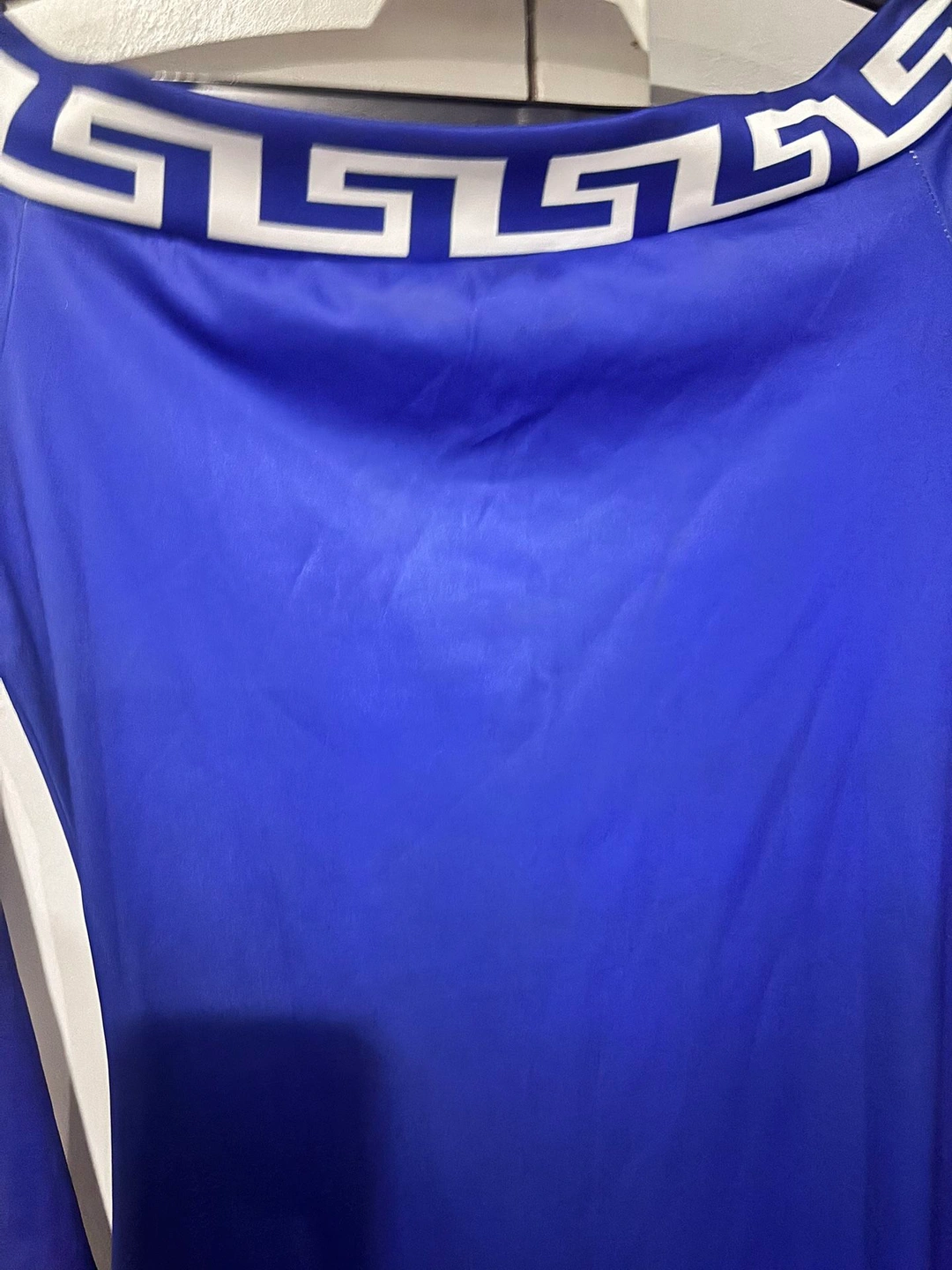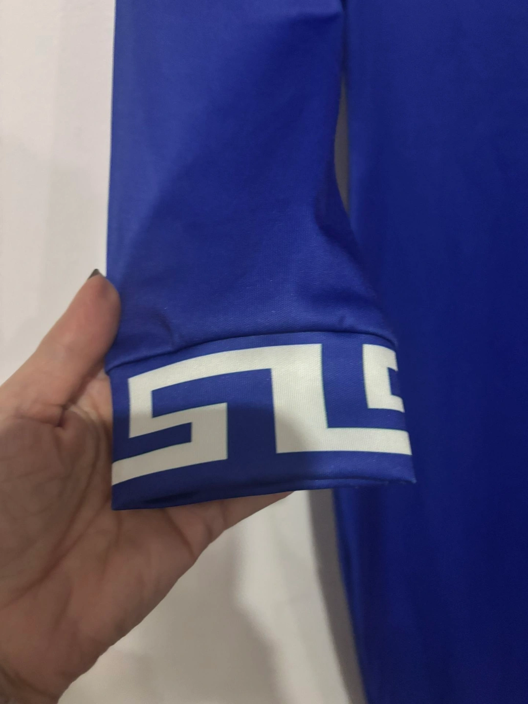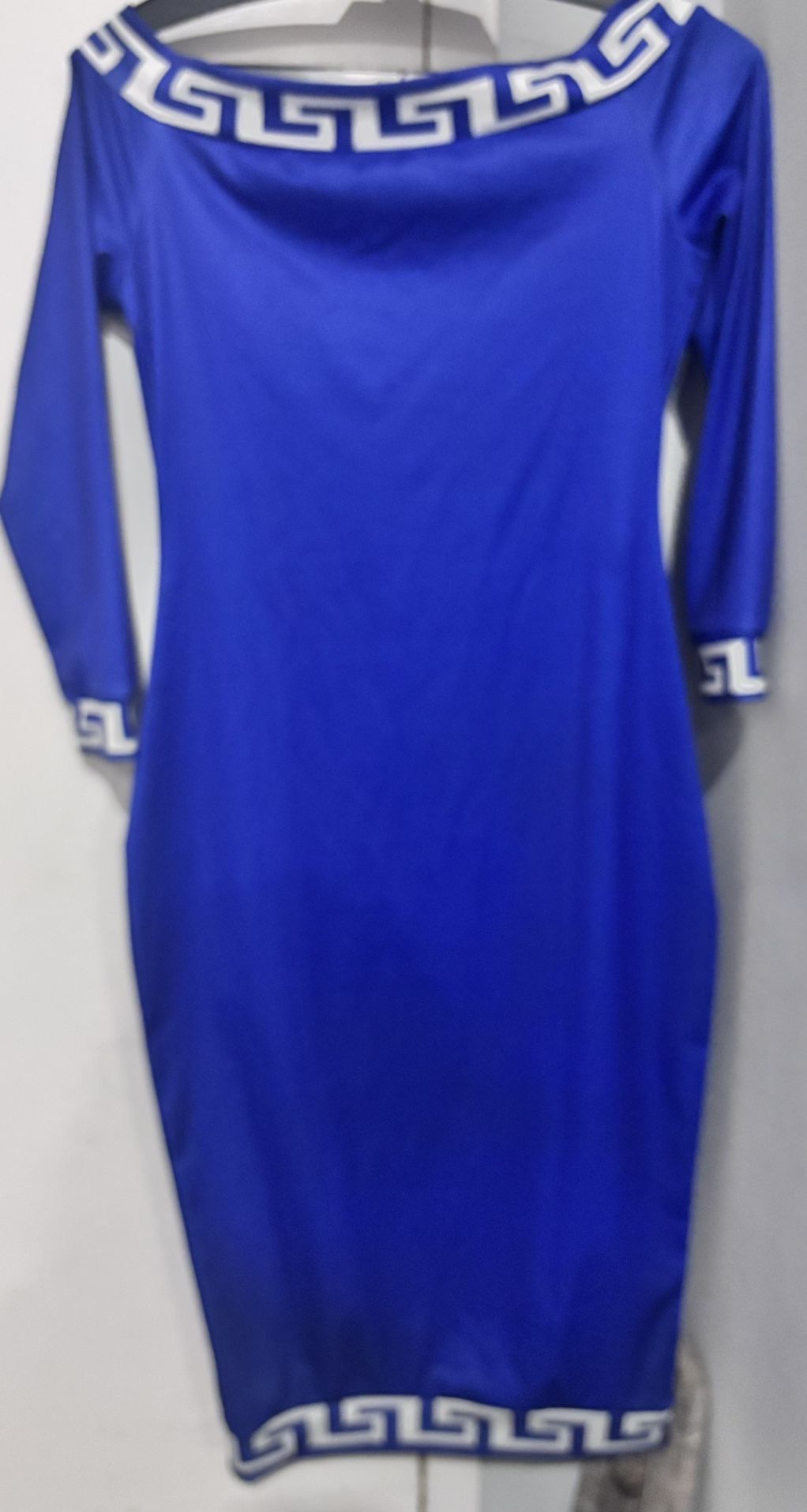 Make a statement in this striking royal blue off-the-shoulder bodycon dress, accented with bold white Greek key detailing along the neckline, sleeves, and hem. Designed to flatter the figure with a sleek, structured silhouette, this piece delivers a perfect balance of elegance and comfort — ideal for cruises, vacations, brunch dates, and summer evenings.