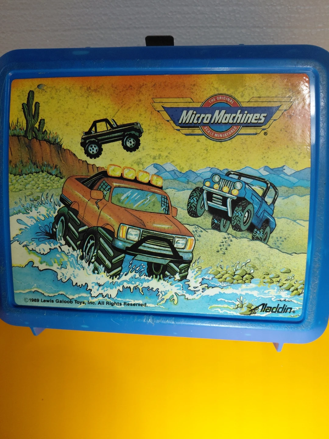 Selling a vintage Aladdin lunchbox featuring Micro Machines graphics! It has some wear and tear, but it's still a cool piece of nostalgia. Great for collectors or anyone who loves vintage toys!