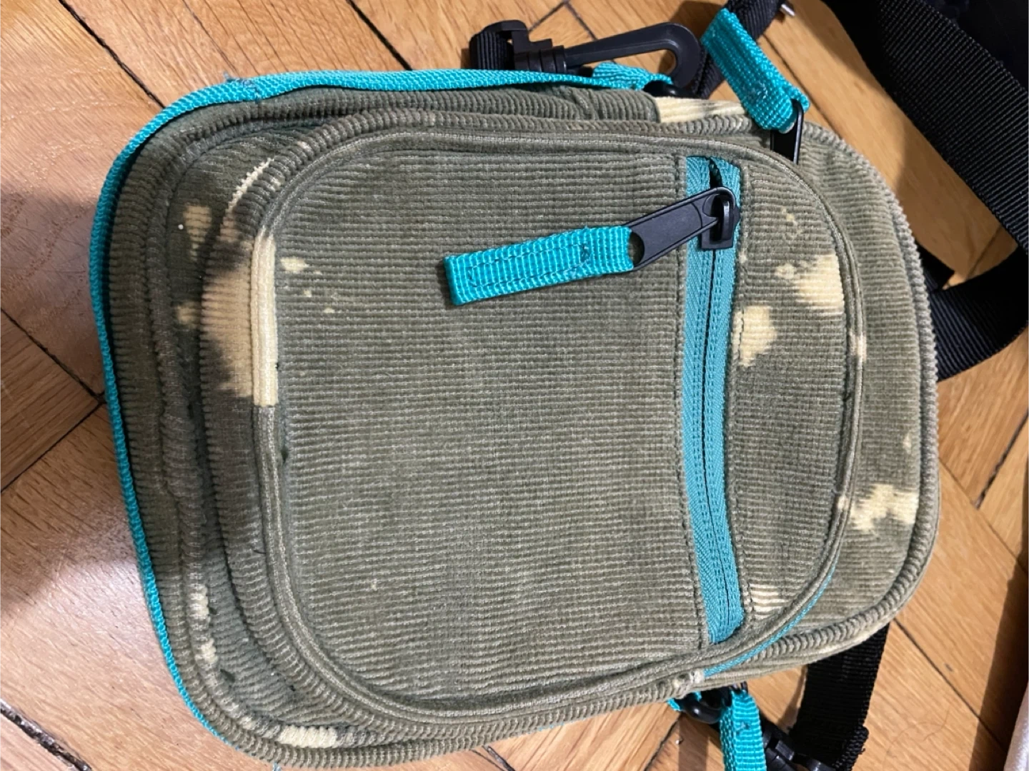 Selling a corduroy belt bag in olive green with turquoise blue accents. It has some discoloration spots that’s part of the design. Please see pictures for details!