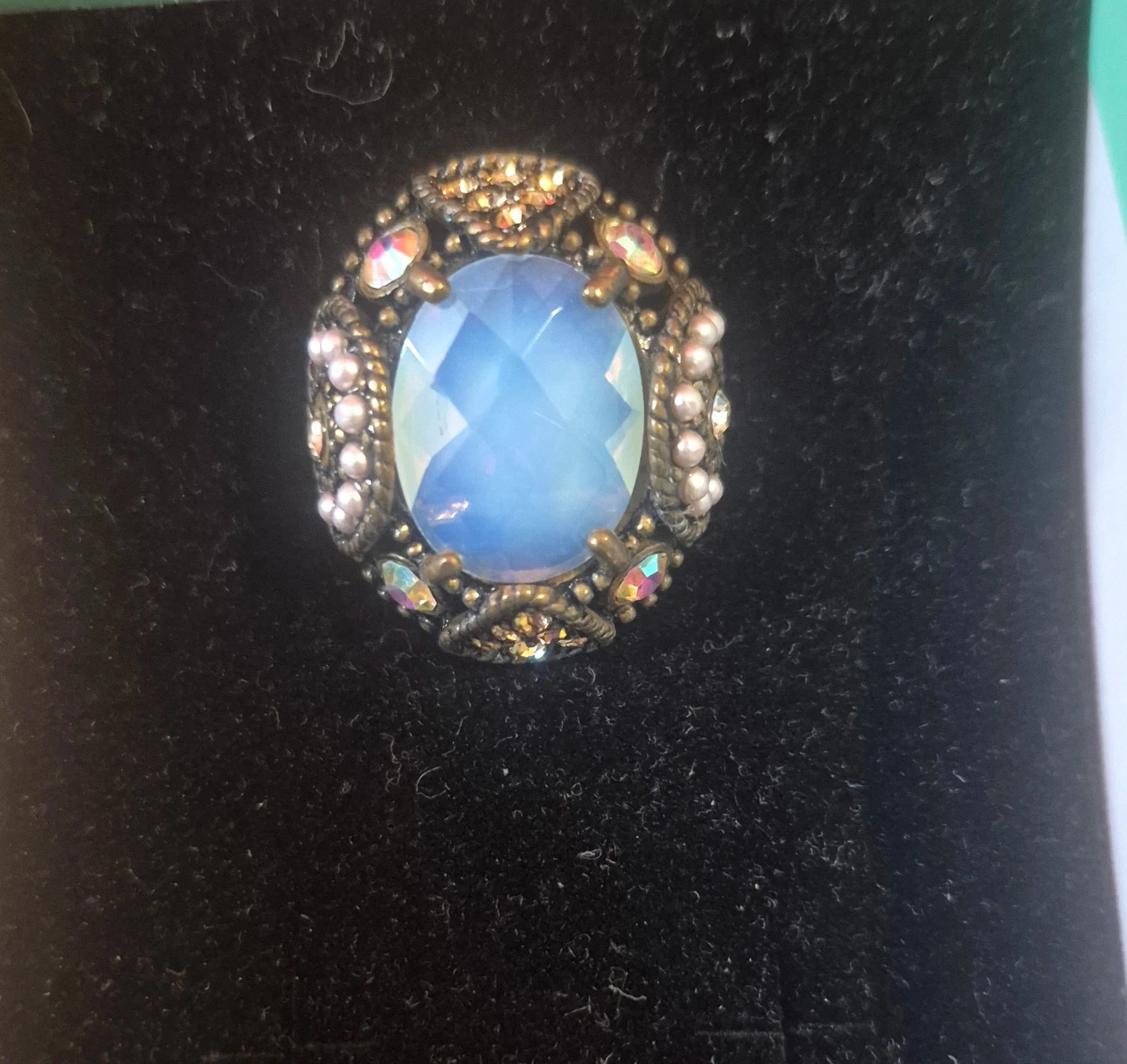 Here's a lovely vintage-style ring! It features a beautiful blue moon stone surrounded by ornate detailing and small pearl-like accents. It's a unique piece that would add a touch of elegance to any outfit