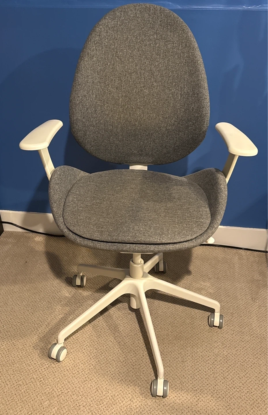 Chair is in excellent, flawless condition and ready for a new desk! Medium gray/white. Very comfortable. Still under warranty!