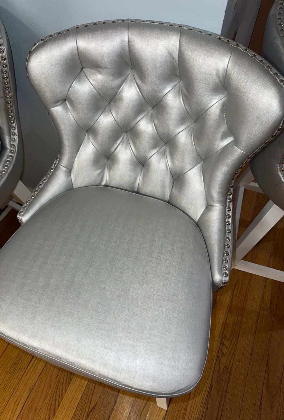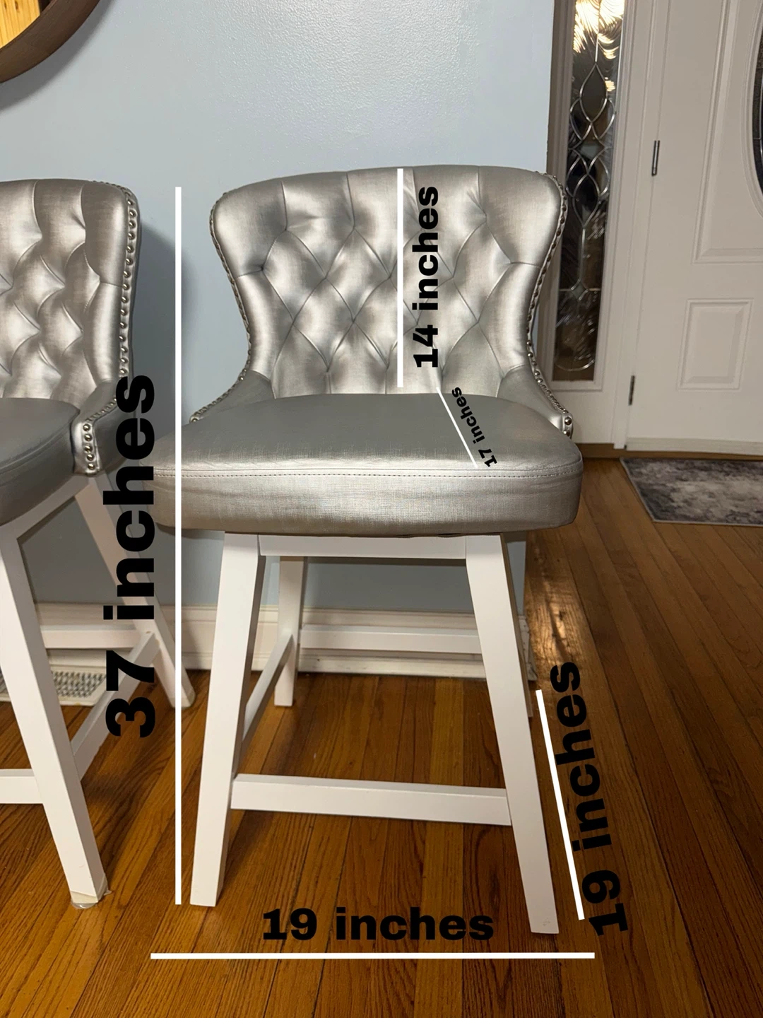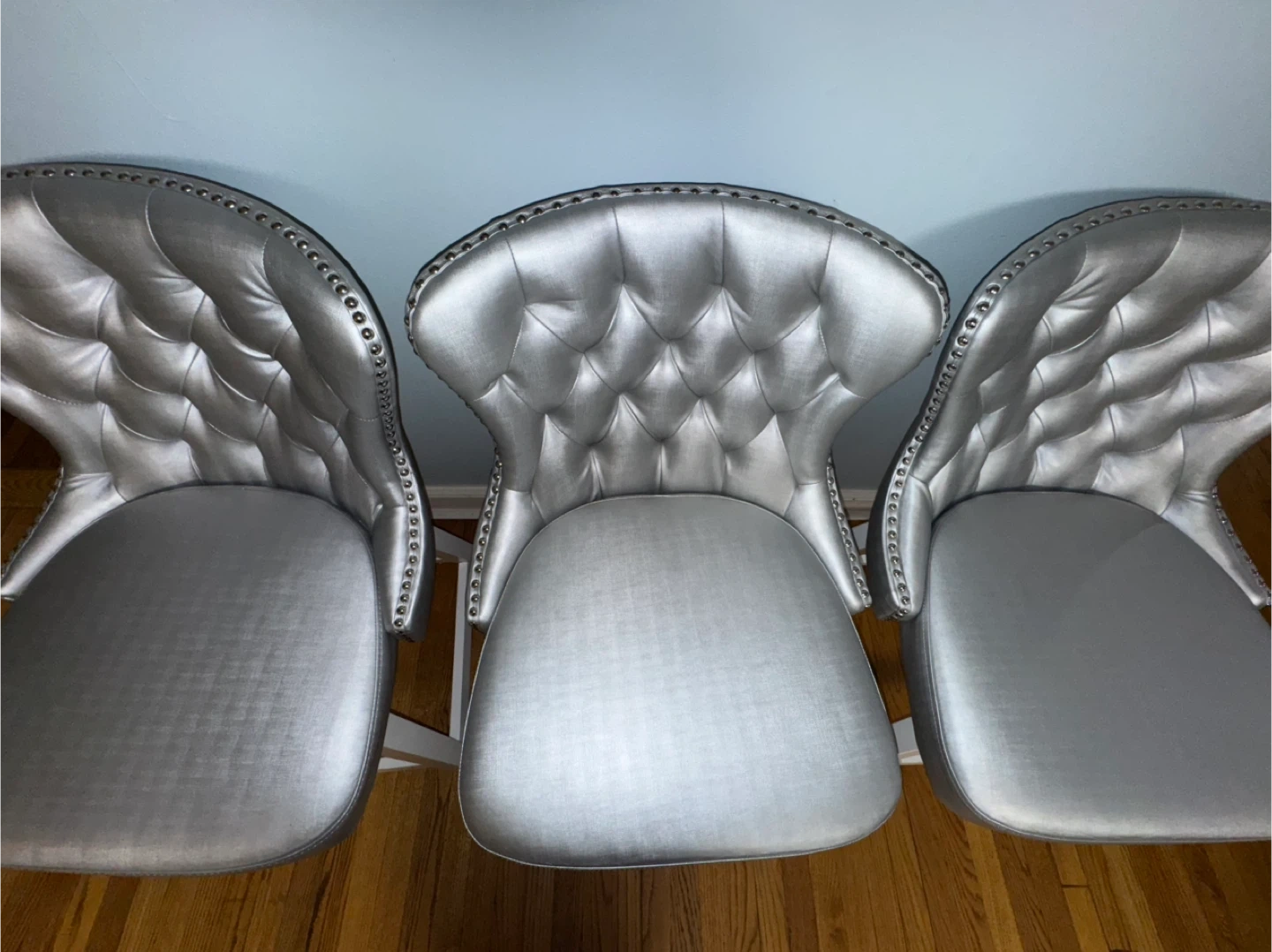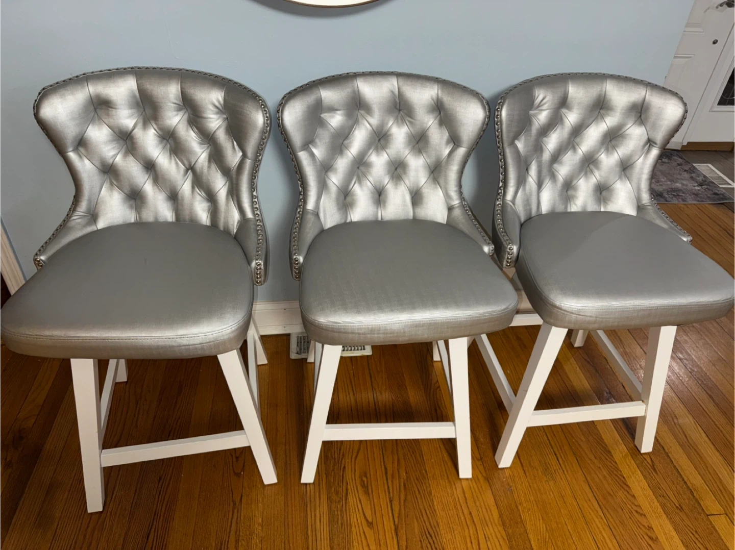 Selling a set of 3 stylish silver bar stools! They feature a tufted back design and a comfortable seat. The dimensions are approximately 37 inches in height, 19 inches in width, and the seat is 14 inches tall and 17 inches wide. They're perfect for adding a touch of elegance to your kitchen or bar area