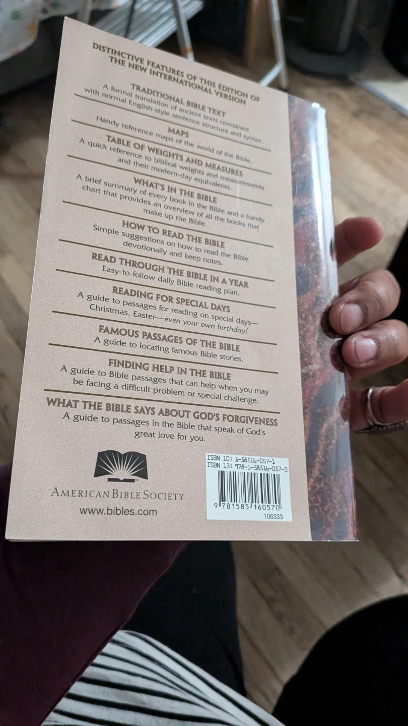 Giving away a Holy Bible in the New International Version. It includes distinctive features such as traditional bible text, maps, table of weights and measures, and suggestions on how to read the bible devotionally and keep notes. Also includes guides for special days and finding help in the bible.