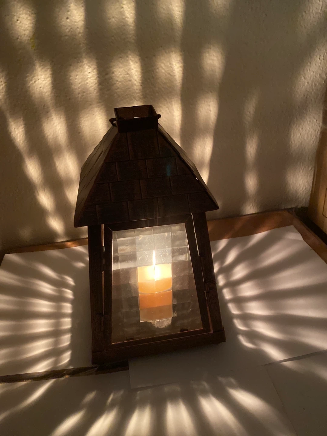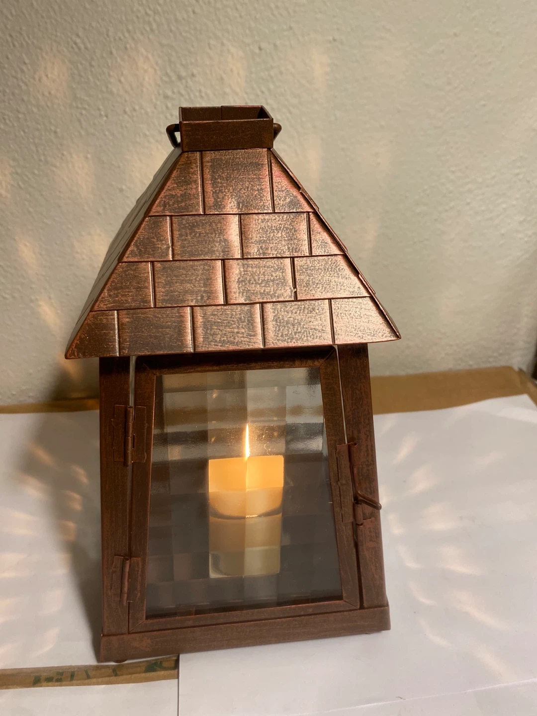 . It has an antique copper finish and a classic design. Comes with glass votive holder.